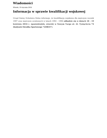 Wiadomości Wtorek, 19 stycznia 2016 Informacja w sprawie kwalifikacji wojskowej Urząd Gminy Ochotnica Dolna informuje, że kwalifikacja wojskowa dla mężczyzn rocznik 1997 oraz mężczyzn urodzonych w latach 1992 - 1996 odbędzie się w dniach 18 - 19 kwietnia 2016 r. (poniedziałek, wtorek) w Nowym Targu ul. Al. Tysiąclecia 74 (budynek Ośrodka Sportowego "GORCE").