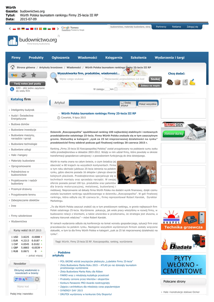 Würth Gazeta: budownictwo.org Tytuł: Würth Polska laureatem rankingu Firmy 25-lecia III RP Data: 2015-07-09 budownictwo, materiały budowlane, okna Firmy Produkty Ogłoszenia Wiadomości Księgarnia Szkolenia Partnerzy Reklama Zaloguj się Wydarzenia i targi Strona główna / Artykuły branżowe / Wiadomości / Würth Polska laureatem rankingu Firmy 25-lecia III RP Wyszukiwarka firm, produktów, wiadomości... Wpisz czego szukasz Chcę dodać: Miejscowość,województwo lub kod Twój notes jest pusty Szukaj Zobacz na mapie EZO - złóż jedno zapytanie do wielu firm W zasięgu km Katalog firm Artykuł Dodaj artykuł Pokaż wszystkie Inteligentny budynek Würth Polska laureatem rankingu Firmy 25-lecia III RP Audyt i Świadectwa Energetyczne Czwartek, 9 lipca 2015 Budowa domów Budowlane inwestycje Budowlane maszyny, narzędzia i sprzęt Budowlane technologie Ranking „Firmy 25-lecia III Rzeczpospolitej Polskiej” został przygotowany na podstawie sumy zysku netto przedsiębiorstwa w dekadzie 2003-2012. Wzięły w nim udział firmy, które powstały w okresie transformacji gospodarczo-ustrojowej i z powodzeniem funkcjonują do dnia dzisiejszego. Budowlane usługi Hale i hangary Materiały budowlane Oprogramowanie Pośrednictwo w budownictwie Projektowanie i nadzór budowlany Przemysł drzewny Przygotowanie terenu Zabezpieczanie obiektów Inne Firmy szkoleniowe Wydawnictwa Kursy walut 08.07.2015 3.8225 4.2213 4.0545 5.8883 0.0671 Würth to marka znana na całym świecie, o czym świadczy jej obecność w 80 krajach na wszystkich kontynentach. Firma w tym roku obchodzi jubileusz 25-lecia istnienia na polskim rynku, gdzie obecnie posiada 16 sklepów i planuje otwarcie kolejnych placówek. Przedsiębiorstwo specjalizuje się w technikach montażu oraz sprzedaży narzędzi. W swojej ofercie posiada ponad 100 tys. produktów oraz patentów dla branży motoryzacyjnej, metalowej, budowlanej i meblowej. Nieprzerwanie od dekady firma Würth Polska ma dodatni wynik finansowy, dzięki czemu została laureatem rankingu opublikowanego w dzienniku „Rzeczpospolita”. W gali finałowej rankingu, która odbyła się 30 czerwca br., firmę reprezentował Robert Karolak, Dyrektor Marketingu. „To dla Würth Polska zaszczyt znaleźć się w tym prestiżowym rankingu, w gronie najlepszych firm Polski ostatniego 25-lecia. Wyróżnienie pokazuje, jak wiele pracy włożyliśmy w rozwój firmy, w budowanie relacji z klientami, a także utwierdza w przekonaniu, że strategia jest słuszna, a wybrany kierunek właściwy” – mówi Robert Karolak. 1 USD 1 EUR 1 CHF 1 GBP 1 RUB Dziennik „Rzeczpospolita” opublikował ranking 100 najbardziej stabilnych i rentownych przedsiębiorstw ostatniego 25-lecia. Firma Würth Polska znalazła się w tym zaszczytnym gronie. Statuetkę w kategorii „zysk za 25 lat nieprzerwanej działalności na rynku” przedstawiciel firmy odebrał podczas gali finałowej rankingu 30 czerwca 2015 r. -0.0088 0.0187 0.0102 -0.0539 0 pokaż więcej W ramach wydarzenia odbyła się konferencja na temat wzrostu gospodarczego, sytuacji firm oraz pracodawców na polskim rynku. Następnie wszystkim wyróżnionym firmom zostały wręczone statuetki, w tym ta dla firmy Würth Polska w kategorii „zysk za 25 lat nieprzerwanej działalności na rynku”. Tagi: Würth, Firmy 25-lecia III RP, Rzeczpospolita, ranking, wyróżnienie Podobne artykuły POL-SKONE wśród zwycięzców plebiscytu „Lubelskie Firmy 25-lecia” Newsletter Złota Budowlana Marka Roku 2015 – ATLAS po raz dziesiąty laureatem prestiżowego wyróżnienia Otrzymuj wiadomości o nowościach w branży Złota Budowlana Marka Roku dla Röben FAKRO wraz z młodzieżą kształtuje przestrzeń Wpisz kod Produkty cenione przez klientów i ekspertów Konkurs Panasonic PRO Awards rozstrzygnięty SYNERGY DAY 2015 Podaj imię i nazwisko: Polecane strony Zajęcia z architektury dla młodzieży coraz popularniejsze DRUTEX wyróżniony w konkursie Orły Eksportu! Hale i konstrukcje stalowe Ocmer Würth Gazeta: budownictwo.org Tytuł: Würth Polska laureatem rankingu Firmy 25-lecia III RP Data: 2015-07-09 Aluprof podwójnie doceniony przez Instytut Nowoczesnego Biznesu Noclegi Formy do produkcji styropianu Twój adres email: Docieplanie dachów, stropodachów Zapisz się Partnerzy Międzynarodowe Targi Poznańskie Targi Kielce Targi w Krakowie Targi Lublin S.A. Międzynarodowe Targi Szczecińskie wszyscy partnerzy Partnerzy serwisu: Mapa strony: Strona główna O serwisie Reklama Regulamin Kontakt Mapa strony Grupa VERTICA.PL: Firmy Dodaj firmę do Katalogu Produkty Ogłoszenia Dodaj bezpłatnie ogłoszenie Wiadomości Księgarnia Wydarzenia i targi Organizacje Alarmy.org Blacha.biz Budowa.org Budownictwo.org Chlodnictwo.biz Elektryka.org Jedzenie.info.pl Klimatyzacja.biz Kominy.biz Ksiegowosc.org Narzedziownia.org Nieruchomosci.biz Odpylanie.info Ogrzewanie.info.pl Opakowania.biz Rachunkowosc.org Sacro.com.pl Stolarstwo.org Styropian.biz Tworzywa.org Metale.org Wentylacja.biz Wszelkie prawa zastrzeżone © 2004-2015 przez Vertica Technologie Internetowe.
