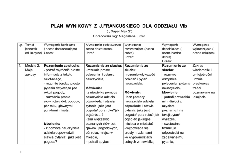 PLAN WYNIKOWY Z J.FRANCUSKIEGO DLA ODDZIAŁU VIb ( „ Super Max 2”) Opracowała mgr Magdalena Luzar Lp. Temat Wymagania konieczne jednostki ( ocena dopuszczająca) edukacyjnej Uczeń: 1. Module 2. Moje zakupy Rozumienie ze słuchu: - potrafi wyróżnić proste informacje z tekstu słuchanego, - rozumie bardzo proste pytania dotyczące pór roku i pogody, - rozróżnia proste słownictwo dot. pogody, pór roku, głównymi punktami miasta, Mówienie: - z pomocą nauczyciela udziela odpowiedzi i stawia pytania: jaka jest pogoda? 1 Wymagania podstawowe( ocena dostateczna) Uczeń Wymagania rozszerzające (ocena dobra) Uczeń: Rozumienie ze słuchu: - rozumie proste polecenia i pytania nauczyciela, Rozumienie ze słuchu: - rozumie większość poleceń i pytań nauczyciela, Mówienie: - z niewielką pomocą nauczyciela udziela odpowiedzi i stawia pytania: jaka jest pogoda/ pora roku?jak dojść do…? - zna większość poznanych słów dot. zjawisk pogodowych, pór roku, miejsc w mieście, - potrafi spytać i Wymagania dopełniające ( ocena bardzo dobra) Uczeń: Rozumienie ze słuchu: - rozumie wszystkie polecenia i pytania nauczyciela, Mówienie: Mówienie: - bez pomocy - potrafi prowadzić nauczyciela udziela mini dialogi z odpowiedzi i stawia użyciem pytania: jaka jest poznanych na pogoda/ pora roku? jak lekcji pytań/ dojść do jakiegoś wyrażeń, miejsca w mieście? - swobodnie - wypowiada się formułuje prostymi zdaniami, odpowiedzi na -w wypowiedziach zadawane mu ustnych z niewielką pytania, Wymagania wykraczające ( ocena celująca) Zakres wiadomości i umiejętności ucznia przekracza treści poznawane na lekcjach. - z błędami potrafi wymienić niektóre zjawiska pogodowe, pory roku, miejsca w mieście, - potrafi z niewielką pomocą nauczyciela odmienić ustnie czasowniki :„ etre”, „avoir” , „ faire” ‘ aller” - zna zaimki osobowe ( je, tu, il, Elle, on, nous, sous, ils, elles) odpowiedzieć na pytanie używając poznanych na lekcjach czasowników – z niewielkimi błędami stosuje zaimki przymiotne dzierżawcze, - w miarę swobodnie używa słownictwa poznanego na lekcji, Pisanie: Pisanie: - pisze w miarę - przepisuje bez błędu poprawnie ze słuchu słowa i proste zdania, znane mu wyrazy - w miarę poprawnie używając odpowiednich uzupełnia zdania wpisując rodzajników podane wcześniej - z niedużymi błędami wyrazy/wyrażenia, pisze zdania, w których - z pomocą nauczyciela używa poznanych pisze wyrażenia czasowników również w dotyczące pogody, pór liczbie mnogiej, roku, miejsc w mieście - w miarę samodzielnie - umie napisać niektóre wykonuje ćwiczenia w nazwy dot. zjawisk zeszycie ćwiczeń, pogodowych , pór roku, miejsc w mieście Czytanie: 2 pomocą nauczyciela posługuje się poznanym słownictwem Pisanie: - pisze poprawnie ze słuchu znane mu wyrazy, - pisze w miarę poprawnie z pamięci, - samodzielnie, z niewielkimi błędami wykonuje ćwiczenia z zeszytu ćwiczeń, Czytanie: Uczeń czyta proste zdania, zna większość poznanych reguł czytania. - wypowiada się pełnymi zdaniami, - w wypowiedziach ustnych w swobodnie posługuje się poznanym słownictwem. Pisanie: - pisze poprawnie ze słuchu znane mu pojedyncze wyrazy i całe zdania, - samodzielnie i bezbłędnie wykonuje ćwiczenia z zeszytu ćwiczeń, Czytanie: Uczeń czyta zdaniami, zna poznane reguły czytania - z pomocą nauczyciela i bazując na przykładach potrafi napisać gdzie idzie - umie napisać używane na lekcjach zaimki osobowe, - z niewielkimi błędami dopasowuje odpowiednie formy czasowników do zaimków osobowych, - z pomocą nauczyciela wykonuje zadania w zeszycie ćwiczeń - czyta pojedyncze słowa, zna niektóre reguły czytania Czytanie: - czyta pojedyncze, znane mu słowa. 2 3 W parku Rozumienie ze słuchu: - potrafi wyróżnić proste informacje z tekstu słuchanego, - rozumie bardzo proste pytania dot. pogody i położenia jakiegoś przedmiotu, - rozróżnia proste Rozumienie ze słuchu: - rozumie proste polecenia i pytania nauczyciela, Mówienie: - z niewielką pomocą nauczyciela udziela odpowiedzi i stawia Rozumienie ze słuchu: - rozumie większość poleceń i pytań nauczyciela, Mówienie: - bez pomocy nauczyciela udziela Rozumienie ze słuchu: - rozumie wszystkie polecenia i pytania nauczyciela, Mówienie: - potrafi prowadzić mini dialogi z Zakres wiadomości i umiejętności ucznia przekracza treści poznawane na lekcjach słownictwo dot. pogody, głównych punktów miasta, pytania: jaka jest pogoda/ pora roku? jak dojść do…? Gdzie idziesz? Do kogo coś należy? Mówienie: - zna większość - z pomocą nauczyciela poznanych słów dot. udziela odpowiedzi i zjawisk pogodowych, , stawia pytania: jaka jest miejsc w mieście, pogoda? Gdzie idziesz? - z niewielkimi błędami - z błędami potrafi używa słownictwa wymienić niektóre związanego z zjawiska pogodowe, usytuowaniem ( loin de, miejsca w mieście, ici itp.) - potrafi z niewielką - potrafi spytać i pomocą nauczyciela odpowiedzieć na odmienić ustnie pytanie używając czasownik „aller”, poznanych na lekcjach - zna zaimki osobowe ( je, czasowników, tu, il, Elle, on, nous, sous, --stosuje formę ils, elles) grzecznościową - zna odmianę ustną czasownika „ vouloir” – czasownika „ acheter” je voudrais Pisanie: – z niewielkimi błędami - przepisuje bez błędu stosuje zaimki słowa i proste zdania, przymiotne - w miarę poprawnie dzierżawcze, uzupełnia zdania wpisując - w miarę swobodnie 4 odpowiedzi i stawia pytania: jaka jest pogoda/ pora roku? jak dojść do jakiegoś miejsca w mieście? czyja to rzecz? - wypowiada się prostymi zdaniami, -w wypowiedziach ustnych z niewielką pomocą nauczyciela posługuje się poznanym słownictwem, Pisanie: - pisze poprawnie ze słuchu znane mu wyrazy, - pisze w miarę poprawnie z pamięci, - z niewielkimi błędami, bez pomocy nauczyciela redaguje ogłoszenie o zaginięciu, zgubieniu czegoś oraz odpowiada na tak