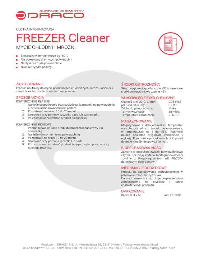 ULOTKA INFORMACYJNA FREEZER Cleaner MYCIE CHŁODNI I MROŹNI Skuteczny w temperaturze do -60°C Nie agresywny dla mytych powierzchni Nabłyszcza myte powierzchnie Niweluje ryzyko poślizgu ZASTOSOWANIE ŚRODKI OSTROŻNOŚCI Produkt neutralny do mycia pomieszczeń chłodniczych, mroźni, lodówek i zamrażalek bez konieczności ich wyłączania. Skład: węglowodory alifatyczne ≥30%, niejonowe środki powierzchniowo czynne <5%. SPOSÓB UŻYCIA WŁAŚCIWOŚCI FIZYKO-CHEMICZNE POWIERZCHNIE PŁASKIE 1. Nanieść bezpośrednio bez rozcieńczania produkt na powierzchnię i rozprowadzić równomiernie padem. 2. Pozostawić na około 10 do 20 minut. 3. Szorować przy pomocy szczotki, pada lub szorowarki. 4. Po zastosowaniu zebrać produkt ściągaczką. Gęstość przy 20˚C, g/cm³: pH produktu (1%): Zdolność pianotwórcza: Termin ważności: Temperatura zamarzania: POWIERZCHNIE PIONOWE 1. Pobrać niewielką ilość produktu na ręcznik papierowy lub ściereczkę. 2. Nanieść równomiernie na powierzchnię. 3. Pozostawić na około 10 do 20 minut. 4. Szorować przy pomocy szczotki lub pada. 5. Po zastosowaniu zebrać produkt ściągaczką lub przy pomocy suchego ręcznika. Magazynować z dala od niskich temperatur oraz bezpośrednich źródeł nasłonecznienia, w temperaturze: od 5 do 35˚C. Pojemniki muszą posiadać oryginalne zamknięcia i etykiety. Pojemniki z produktem chronić przed dostępem osób nieupoważnionych. 0,98 ± 0.5 6 ± 0.5 Niska 36 mies. < -60°C MAGAZYNOWANIE BIODEGRADOWALNOŚĆ Zawarte w produkcie związki powierzchniowo czynne spełniają kryteria biodegradowalności zgodnie z Rozporządzeniem WE 48/2004 dotyczącym detergentów. INFORMACJE DODATKOWE Produkt do zastosowania profesjonalnego w przemyśle rolno-spożywczym. Dalsze informacje i instrukcje bezpieczeństwa zamieszczono na etykiecie i karcie charakterystyki produktu. OPAKOWANIE Kanister: 4 x 5 L kod: 2210005 Producent: DRACO-BIS, ul. Młodzieżowa 29, 62-510 Konin, Polska, www.draco-bis.pl Biuro handlowe: 62-831 Korzeniew 110, tel. +48 62 767 23 55, fax +48 62 767 23 85, e-mail: [email protected]