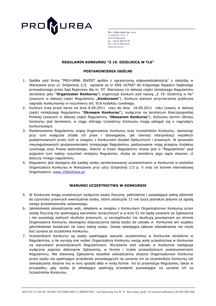 REGULAMIN KONKURSU "Z 19. DZIELNICĄ W TLE" POSTANOWIENIA OGÓLNE 1. Spółka pod firmą "PRO-URBA INVEST spółka z ograniczoną odpowiedzialnością" z siedzibą w Warszawie przy ul. Grójeckiej 1/3, wpisana za nr KRS 167667 do Krajowego Rejestru Sądowego prowadzonego przez Sąd Rejonowy dla m. ST. Warszawy (w dalszej części niniejszego Regulaminu określana jako "Organizator Konkursu") organizuje konkurs pod nazwą „Z 19. Dzielnicą w tle” (zwanym w dalszej części Regulaminu „Konkursem”). Konkurs stanowi przyrzeczenie publiczne nagrody konkursowej w rozumieniu art. 919 kodeksu cywilnego. 2. Konkurs trwa przez okres od dnia 8.09.2011 roku do dnia 18.09.2011 roku (zwany w dalszej części niniejszego Regulaminu "Okresem Konkursu"), wyłącznie na terytorium Rzeczpospolitej Polskiej (zwanym w dalszej części Regulaminu "Obszarem Konkursu"). Końcowy termin Okresu Konkursu jest terminem, w ciągu którego Uczestnicy Konkursu mogą ubiegać się o nagrodę/y konkursową/e. 3. Postanowienia Regulaminu wiążą Organizatora Konkursu oraz Uczestników Konkursu, stanowiąc przy tym wyłączne źródło ich praw i obowiązków, jak również interpretacji wszelkich podejmowanych przez nich w związku z Konkursem działań faktycznych i prawnych. W sprawach nieuregulowanych postanowieniami niniejszego Regulaminu zastosowanie mają przepisy Kodeksu cywilnego oraz Prawa autorskiego. Ilekroć w treści Regulaminu mowa jest o "Regulaminie" pod pojęciem tym należy rozumieć niniejszy Regulamin, chyba że określony jego zapis stanowi, iż dotyczy innego regulaminu. 4. Regulamin jest dostępny dla każdej osoby zainteresowanej uczestnictwem w Konkursie w siedzibie Organizatora Konkursu w Warszawie przy ulicy Grójeckiej 1/3 p. V oraz na stronie internetowej Organizatora: www.19dzielnica.pl. WARUNKI UCZESTNICTWA W KONKURSIE 5. W Konkursie mogą uczestniczyć wyłącznie osoby fizyczne, pełnoletnie i posiadające pełną zdolność do czynności prawnych ewentualnie osoby, które ukończyły 13 rok życia jednakże jedynie za zgodą swego przedstawiciela ustawowego. 6. Jakiekolwiek oświadczenia woli, składane w związku z Konkursem Organizatorowi Konkursu przez osobę fizyczną nie spełniającą warunków oznaczonych w p-kcie 5) nie będą uważane za Zgłoszenia i nie wywołują żadnych skutków prawnych, w szczególności nie skutkują powstaniem po stronie Organizatora Konkursu obowiązku dopuszczenia takiej osoby do udziału w Konkursie ani wypłaty jakichkolwiek świadczeń na rzecz takiej osoby. Osoba składająca takowe oświadczenia nie może być uznana za Uczestnika Konkursu. 7. Uczestnikami Konkursu są osoby spełniające warunki uczestnictwa w Konkursie określone w Regulaminie, o ile wyrażą one wobec Organizatora Konkursu swoją wolę uczestnictwa w Konkursie na warunkach przewidzianych Regulaminem. Wyrażenie woli udziału w Konkursie następuje wyłącznie poprzez dokonanie Zgłoszenia, w formie i trybie przewidzianym postanowieniami Regulaminu. Nie stanowią Zgłoszenia wszelkie oświadczenia złożone Organizatorowi Konkursu przez osoby nie spełniające przesłanek pozwalających na uznanie ich za Uczestników Konkursu lub oświadczenia złożone mu w inny sposób albo w innej formie niż to przewiduje Regulamin, także w przypadku, gdy osoby je składające spełniają przesłanki pozwalające na uznanie ich za Uczestników Konkursu. 8. Uczestnikami Konkursu nie mogą być następujące osoby: a) pracownicy Organizatora Konkursu oraz innych wskazanych w treści niniejszego Regulaminu osób działających na jego zlecenie przy organizacji Konkursu, b) członkowie organów ustrojowych Organizatora Konkursu oraz innych osób działających na jego zlecenie przy organizacji Konkursu, inni niż określeni w pp-kcie a), c) osoby wchodzące w skład Komisji Konkursowej oraz osoby sprawujące nadzór prawidłowym przeprowadzeniem Konkursu, d) osoby związane z osobami wskazanymi w pp-ktach a), b) i c) stosunkiem małżeństwa, pokrewieństwa poniżej trzeciego stopnia lub powinowactwa poniżej drugiego stopnia. 9. Organizator Konkursu przyjmuje w dobrej wierze wszelkie oświadczenia woli lub wiedzy składane mu przez osoby dokonujące Zgłoszenia. Na osobach dokonujących Zgłoszenia oraz składających Organizatorowi Konkursu inne oświadczania woli lub wiedzy z związku z Konkursem ciąży obowiązek zachowania należytej staranności przy badaniu wszelkich okoliczności faktycznych i prawnych powoływanych w ich treści. W razie powzięcia istotnych wątpliwości co do prawdziwości twierdzeń objętych Zgłoszeniem lub innymi oświadczeniami woli i wiedzy składanymi mu w związku z Konkursem przez osoby dokonujące Zgłoszenia, Organizator Konkursu zastrzega sobie prawo ich weryfikacji - w szczególności pod kątem spełniania przez osoby dokonujące Zgłoszenia przesłanek uznania ich za Uczestników Konkursu zgodnie z postanowieniami niniejszego Regulaminu. Weryfikacja takowa następować może wyłącznie w granicach dozwolonych przepisami prawa obowiązującego. Osoby dokonujące Zgłoszenia wyrażają tym samym (tj. poprzez fakt dokonania Zgłoszenia) zgodę na poddanie ich takowej weryfikacji i zobowiązują się bezzwłocznie udzielić Organizatorowi Konkursu wszelkich informacji w zakresie niezbędnym dla przeprowadzenia takowej weryfikacji. Osoby te wyrażają zarazem - poprzez fakt dokonania Zgłoszenia - swoją zgodę na przetwarzanie przez Organizatora Konkursu dotyczących ich danych osobowych, z zastrzeżeniem, że wszelkie dane osobowe, które zostały przekazane Organizatorowi Konkursu wyłącznie w celu dokonania opisanej powyżej weryfikacji (tzn. inne niż objęte Zgłoszeniem), gromadzone i przetwarzane będą wyłącznie w zakresie niezbędnym dla takowej weryfikacji oraz ochrony słusznych interesów Organizatora Konkursu na wypadek zaistnienia pomiędzy nim a osobą poddaną weryfikacji jakichkolwiek spraw spornych w związku z Konkursem. P