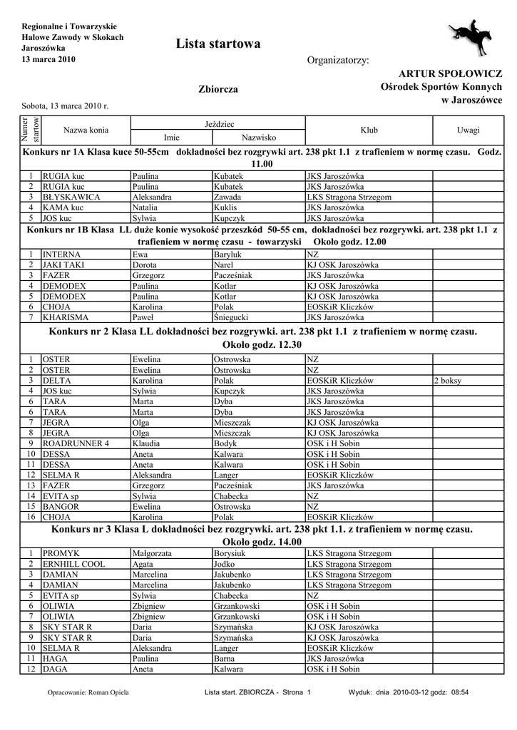 Regionalne i Towarzyskie Halowe Zawody w Skokach Jaroszówka 13 marca 2010 Lista startowa Organizatorzy: ARTUR SPOŁOWICZ Ośrodek Sportów Konnych w Jaroszówce Zbiorcza Numer startow Sobota, 13 marca 2010 r. Nazwa konia Jeździec Imie Klub Nazwisko Uwagi Konkurs nr 1A Klasa kuce 50-55cm dokładności bez rozgrywki art. 238 pkt 1.1 z trafieniem w normę czasu. Godz. 11.00 1 2 3 4 5 RUGIA kuc RUGIA kuc BŁYSKAWICA KAMA kuc JOS kuc Paulina Paulina Aleksandra Natalia Sylwia Kubatek Kubatek Zawada Kuklis Kupczyk JKS Jaroszówka JKS Jaroszówka LKS Stragona Strzegom JKS Jaroszówka JKS Jaroszówka Konkurs nr 1B Klasa LL duże konie wysokość przeszkód 50-55 cm, dokładności bez rozgrywki. art. 238 pkt 1.1 z trafieniem w normę czasu - towarzyski Około godz. 12.00 1 2 3 4 5 6 7 INTERNA JAKI TAKI FAZER DEMODEX DEMODEX CHOJA KHARISMA Ewa Dorota Grzegorz Paulina Paulina Karolina Paweł Baryluk Narel Pacześniak Kotlar Kotlar Polak Śniegucki NZ KJ OSK Jaroszówka JKS Jaroszówka KJ OSK Jaroszówka KJ OSK Jaroszówka EOSKiR Kliczków JKS Jaroszówka Konkurs nr 2 Klasa LL dokładności bez rozgrywki. art. 238 pkt 1.1 z trafieniem w normę czasu. Około godz. 12.30 1 2 3 4 6 6 7 8 9 10 11 12 13 14 15 16 OSTER OSTER DELTA JOS kuc TARA TARA JEGRA JEGRA ROADRUNNER 4 DESSA DESSA SELMA R FAZER EVITA sp BANGOR CHOJA Ewelina Ewelina Karolina Sylwia Marta Marta Olga Olga Klaudia Aneta Aneta Aleksandra Grzegorz Sylwia Ewelina Karolina Ostrowska Ostrowska Polak Kupczyk Dyba Dyba Mieszczak Mieszczak Bodyk Kalwara Kalwara Langer Pacześniak Chabecka Ostrowska Polak NZ NZ EOSKiR Kliczków JKS Jaroszówka JKS Jaroszówka JKS Jaroszówka KJ OSK Jaroszówka KJ OSK Jaroszówka OSK i H Sobin OSK i H Sobin OSK i H Sobin EOSKiR Kliczków JKS Jaroszówka NZ NZ EOSKiR Kliczków 2 boksy Konkurs nr 3 Klasa L dokładności bez rozgrywki. art. 238 pkt 1.1. z trafieniem w normę czasu. Około godz. 14.00 1 2 3 4 5 6 7 8 9 10 11 12 PROMYK ERNHILL COOL DAMIAN DAMIAN EVITA sp OLIWIA OLIWIA SKY STAR R SKY STAR R SELMA R HAGA DAGA Opracowanie: Roman Opiela Małgorzata Agata Marcelina Marcelina Sylwia Zbigniew Zbigniew Daria Daria Aleksandra Paulina Aneta Borysiuk Jodko Jakubenko Jakubenko Chabecka Grzankowski Grzankowski Szymańska Szymańska Langer Barna Kalwara LKS Stragona Strzegom LKS Stragona Strzegom LKS Stragona Strzegom LKS Stragona Strzegom NZ OSK i H Sobin OSK i H Sobin KJ OSK Jaroszówka KJ OSK Jaroszówka EOSKiR Kliczków JKS Jaroszówka OSK i H Sobin Lista start. ZBIORCZA - Strona 1 Wyduk: dnia 2010-03-12 godz: 08:54 13 14 15 16 17 18 19 20 21 22 23 24 25 26 27 28 29 30 31 BANGOR ITS' ME 5 DAGA ROADRUNNER 4 ROADRUNNER 4 DELTA NEW PORT GRUBIANIAN GRUBIANIAN MARA SELWINA SELWINA ASPAN MITSHUBISHI J POLONIA KANSAS SALAZAR FORMAN FORMAN Ewelina Paulina Aneta Marta Marta Karolina Klaudia Artur Artur Karina Sylwia Sylwia Katarzyna Paweł Piotr Małgorzata Agata Marcelina Marcelina Ostrowska Piórkowska Kalwara Dyba Dyba Polak Smaza Społowicz Społowicz Skowron Kupczyk Kupczyk Stąpor Śniegucki Bujak Borysiuk Jodko Jakubenko Jakubenko NZ KJ OSK Jaroszówka OSK i H Sobin JKS Jaroszówka JKS Jaroszówka EOSKiR Kliczków JKS Jaroszówka NZ NZ JKS Jaroszówka JKS Jaroszówka JKS Jaroszówka KJ OSK Jaroszówka JKS Jaroszówka LKS Stragona Strzegom LKS Stragona Strzegom LKS Stragona Strzegom LKS Stragona Strzegom LKS Stragona Strzegom Konkurs nr 4 Klasa P zwykły art. 238 pkt 2.1 Około godz. 16.00 1 2 3 4 5 6 7 8 9 10 11 12 13 14 15 16 17 18 19 HASZYSZ KANSAS MARA SALAZAR MAGOWSKI WM KADIN ITS' ME 5 NEW PORT TRESKA WECORT ASPAN PROMYK BESKID ERNHILL COOL RUFIN KROK W KROK HAGA NAPAD HARBUZ Artur Małgorzata Karina Agata Szymon Ksawery Paulina Klaudia Piotr Artur Katarzyna Małgorzata Karina Agata Szymon Ksawery Paulina Paweł Artur Społowicz Borysiuk Skowron Jodko Nachotko Śniegucki Piórkowska Smaza Bujak Społowicz Stąpor Borysiuk Skowron Jodko Nachotko Śniegucki Barna Śniegucki Społowicz NZ LKS Stragona Strzegom JKS Jaroszówka LKS Stragona Strzegom KJ OSK Jaroszówka JKS Jaroszówka KJ OSK Jaroszówka JKS Jaroszówka LKS Stragona Strzegom NZ KJ OSK Jaroszówka LKS Stragona Strzegom JKS Jaroszówka LKS Stragona Strzegom KJ OSK Jaroszówka JKS Jaroszówka JKS Jaroszówka JKS Jaroszówka NZ 6 boksów Konkurs nr 5 Klasa N zwykły art. 238 pkt 2.1 Około godz. 17.00 1 HARBUZ Artur Społowicz NZ 2 BESKID Karina Skowron JKS Jaroszówka 3 HASZYSZ Artur Społowicz NZ 4 ORLEAN Artur Społowicz NZ W każdym konkursie zawodnicy posiadający wszystkie dokumenty startują w ZR, a nie posiadający wszystkich wymaganych dokumentów w ZT. Kolejność startów może ulec niewielkim zmianom. Sędzia Główny Anna Augustyńska Mincger Opracowanie: Roman Opiela Lista start. ZBIORCZA - Strona 2 Wyduk: dnia 2010-03-12 godz: 08:54
