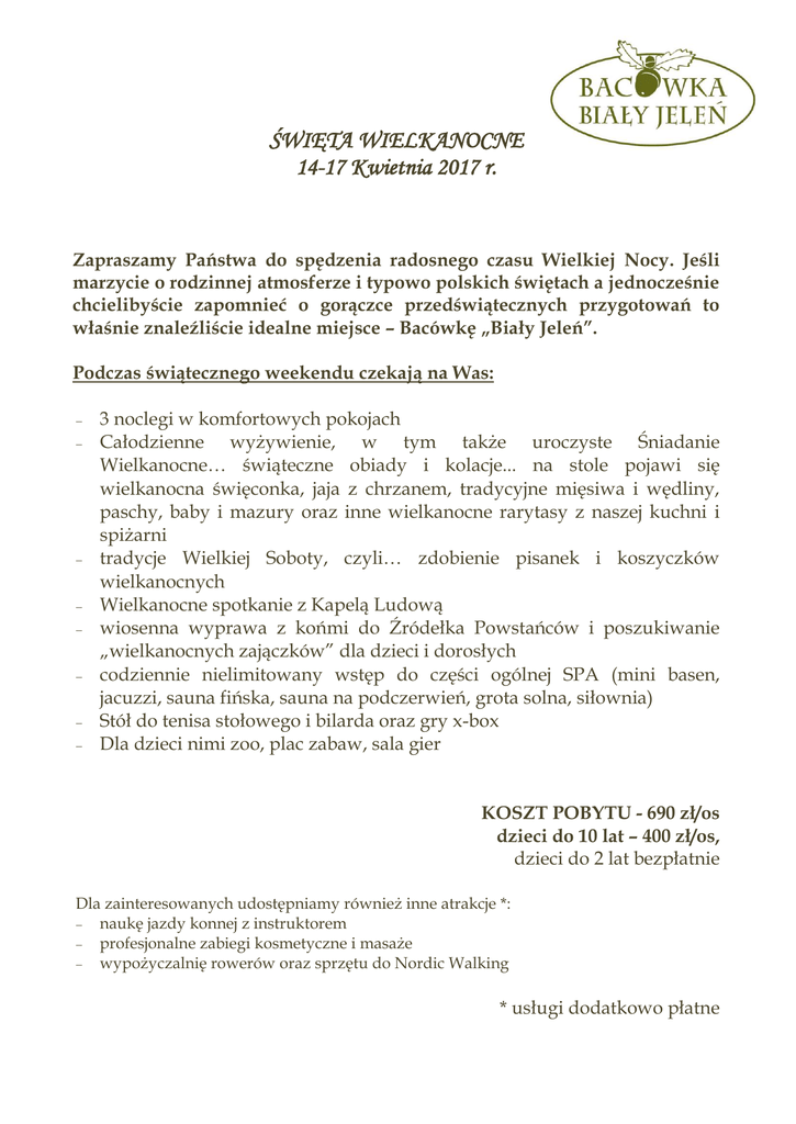 ŚWIĘTA WIELKANOCNE 14-17 Kwietnia 2017 r. Zapraszamy Państwa do spędzenia radosnego czasu Wielkiej Nocy. Jeśli marzycie o rodzinnej atmosferze i typowo polskich świętach a jednocześnie chcielibyście zapomnieć o gorączce przedświątecznych przygotowań to właśnie znaleźliście idealne miejsce – Bacówkę „Biały Jeleń”. Podczas świątecznego weekendu czekają na Was: 3 noclegi w komfortowych pokojach Całodzienne wyżywienie, w tym także uroczyste Śniadanie Wielkanocne… świąteczne obiady i kolacje... na stole pojawi się wielkanocna święconka, jaja z chrzanem, tradycyjne mięsiwa i wędliny, paschy, baby i mazury oraz inne wielkanocne rarytasy z naszej kuchni i spiżarni tradycje Wielkiej Soboty, czyli… zdobienie pisanek i koszyczków wielkanocnych Wielkanocne spotkanie z Kapelą Ludową wiosenna wyprawa z końmi do Źródełka Powstańców i poszukiwanie „wielkanocnych zajączków” dla dzieci i dorosłych codziennie nielimitowany wstęp do części ogólnej SPA (mini basen, jacuzzi, sauna fińska, sauna na podczerwień, grota solna, siłownia) Stół do tenisa stołowego i bilarda oraz gry x-box Dla dzieci nimi zoo, plac zabaw, sala gier KOSZT POBYTU - 690 zł/os dzieci do 10 lat – 400 zł/os, dzieci do 2 lat bezpłatnie Dla zainteresowanych udostępniamy również inne atrakcje *: naukę jazdy konnej z instruktorem profesjonalne zabiegi kosmetyczne i masaże wypożyczalnię rowerów oraz sprzętu do Nordic Walking * usługi dodatkowo płatne