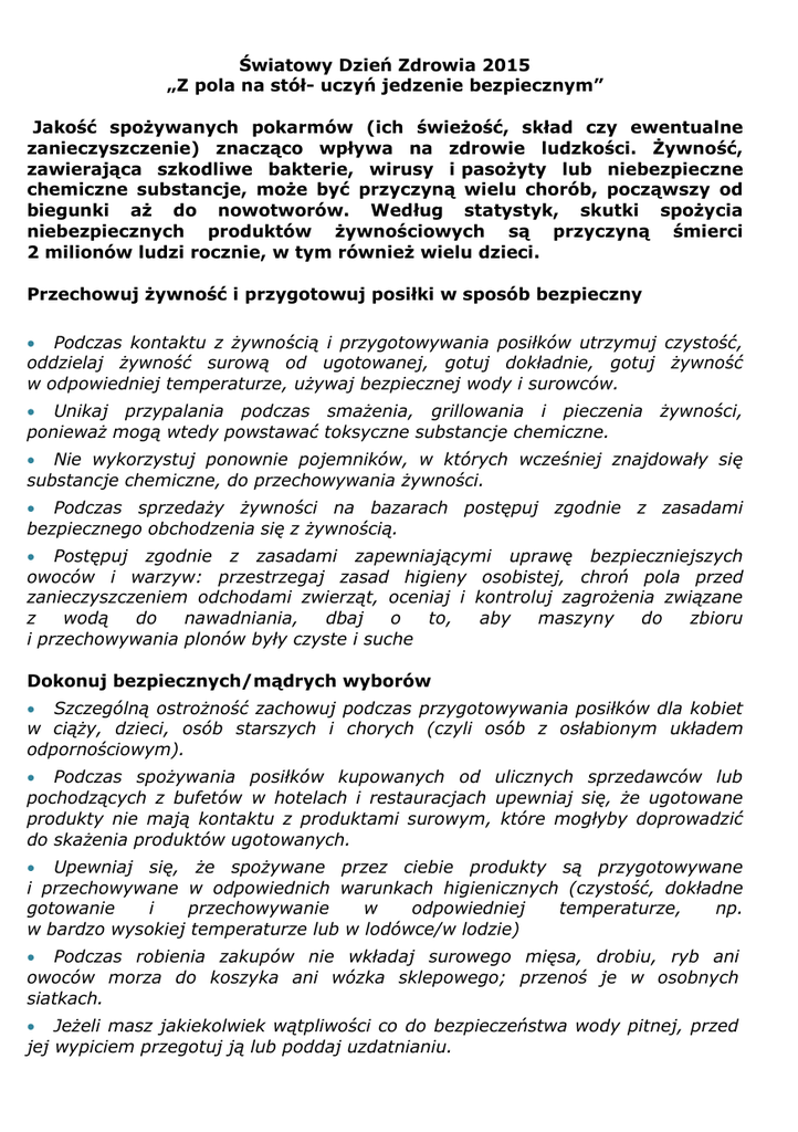 Światowy Dzień Zdrowia 2015 „Z pola na stół- uczyń jedzenie bezpiecznym” Jakość spożywanych pokarmów (ich świeżość, skład czy ewentualne zanieczyszczenie) znacząco wpływa na zdrowie ludzkości. Żywność, zawierająca szkodliwe bakterie, wirusy i pasożyty lub niebezpieczne chemiczne substancje, może być przyczyną wielu chorób, począwszy od biegunki aż do nowotworów. Według statystyk, skutki spożycia niebezpiecznych produktów żywnościowych są przyczyną śmierci 2 milionów ludzi rocznie, w tym również wielu dzieci. Przechowuj żywność i przygotowuj posiłki w sposób bezpieczny Podczas kontaktu z żywnością i przygotowywania posiłków utrzymuj czystość, oddzielaj żywność surową od ugotowanej, gotuj dokładnie, gotuj żywność w odpowiedniej temperaturze, używaj bezpiecznej wody i surowców. Unikaj przypalania podczas smażenia, grillowania i pieczenia ponieważ mogą wtedy powstawać toksyczne substancje chemiczne. żywności, Nie wykorzystuj ponownie pojemników, w których wcześniej znajdowały się substancje chemiczne, do przechowywania żywności. Podczas sprzedaży żywności na bazarach postępuj zgodnie z zasadami bezpiecznego obchodzenia się z żywnością. Postępuj zgodnie z zasadami zapewniającymi uprawę bezpieczniejszych owoców i warzyw: przestrzegaj zasad higieny osobistej, chroń pola przed zanieczyszczeniem odchodami zwierząt, oceniaj i kontroluj zagrożenia związane z wodą do nawadniania, dbaj o to, aby maszyny do zbioru i przechowywania plonów były czyste i suche Dokonuj bezpiecznych/mądrych wyborów Szczególną ostrożność zachowuj podczas przygotowywania posiłków dla kobiet w ciąży, dzieci, osób starszych i chorych (czyli osób z osłabionym układem odpornościowym). Podczas spożywania posiłków kupowanych od ulicznych sprzedawców lub pochodzących z bufetów w hotelach i restauracjach upewniaj się, że ugotowane produkty nie mają kontaktu z produktami surowym, które mogłyby doprowadzić do skażenia produktów ugotowanych. Upewniaj się, że spożywane przez ciebie produkty są przygotowywane i przechowywane w odpowiednich warunkach higienicznych (czystość, dokładne gotowanie i przechowywanie w odpowiedniej temperaturze, np. w bardzo wysokiej temperaturze lub w lodówce/w lodzie) Podczas robienia zakupów nie wkładaj surowego mięsa, drobiu, ryb ani owoców morza do koszyka ani wózka sklepowego; przenoś je w osobnych siatkach. Jeżeli masz jakiekolwiek wątpliwości co do bezpieczeństwa wody pitnej, przed jej wypiciem przegotuj ją lub poddaj uzdatnianiu.