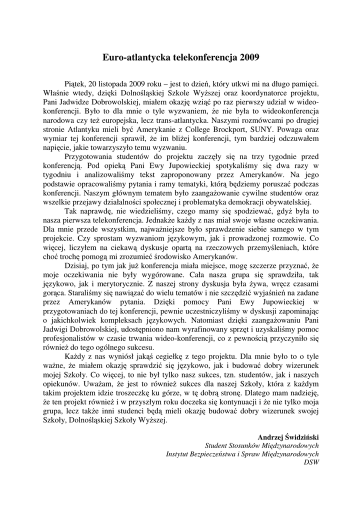 Euro-atlantycka telekonferencja 2009 Piątek, 20 listopada 2009 roku – jest to dzień, który utkwi mi na długo pamięci. Właśnie wtedy, dzięki Dolnośląskiej Szkole Wyższej oraz koordynatorce projektu, Pani Jadwidze Dobrowolskiej, miałem okazję wziąć po raz pierwszy udział w wideokonferencji. Było to dla mnie o tyle wyzwaniem, że nie była to wideokonferencja narodowa czy też europejska, lecz trans-atlantycka. Naszymi rozmówcami po drugiej stronie Atlantyku mieli być Amerykanie z College Brockport, SUNY. Powaga oraz wymiar tej konferencji sprawił, że im bliżej konferencji, tym bardziej odczuwałem napięcie, jakie towarzyszyło temu wyzwaniu. Przygotowania studentów do projektu zaczęły się na trzy tygodnie przed konferencją. Pod opieką Pani Ewy Jupowieckiej spotykaliśmy się dwa razy w tygodniu i analizowaliśmy tekst zaproponowany przez Amerykanów. Na jego podstawie opracowaliśmy pytania i ramy tematyki, którą będziemy poruszać podczas konferencji. Naszym głównym tematem było zaangażowanie cywilne studentów oraz wszelkie przejawy działalności społecznej i problematyka demokracji obywatelskiej. Tak naprawdę, nie wiedzieliśmy, czego mamy się spodziewać, gdyż była to nasza pierwsza telekonferencja. Jednakże każdy z nas miał swoje własne oczekiwania. Dla mnie przede wszystkim, najważniejsze było sprawdzenie siebie samego w tym projekcie. Czy sprostam wyzwaniom językowym, jak i prowadzonej rozmowie. Co więcej, liczyłem na ciekawą dyskusje opartą na rzeczowych przemyśleniach, które choć trochę pomogą mi zrozumieć środowisko Amerykanów. Dzisiaj, po tym jak już konferencja miała miejsce, mogę szczerze przyznać, że moje oczekiwania nie były wygórowane. Cała nasza grupa się sprawdziła, tak językowo, jak i merytorycznie. Z naszej strony dyskusja była żywa, wręcz czasami gorąca. Staraliśmy się nawiązać do wielu tematów i nie szczędzić wyjaśnień na zadane przez Amerykanów pytania. Dzięki pomocy Pani Ewy Jupowieckiej w przygotowaniach do tej konferencji, pewnie uczestniczyliśmy w dyskusji zapominając o jakichkolwiek kompleksach językowych. Natomiast dzięki zaangażowaniu Pani Jadwigi Dobrowolskiej, udostępniono nam wyrafinowany sprzęt i uzyskaliśmy pomoc profesjonalistów w czasie trwania wideo-konferencji, co z pewnością przyczyniło się również do tego ogólnego sukcesu. Każdy z nas wyniósł jakąś cegiełkę z tego projektu. Dla mnie było to o tyle ważne, że miałem okazję sprawdzić się językowo, jak i budować dobry wizerunek mojej Szkoły. Co więcej, to nie był tylko nasz sukces, tzn. studentów, jak i naszych opiekunów. Uważam, że jest to również sukces dla naszej Szkoły, która z każdym takim projektem idzie troszeczkę ku górze, w tę dobrą stronę. Dlatego mam nadzieję, że ten projekt również i w przyszłym roku doczeka się kontynuacji i że nie tylko moja grupa, lecz także inni studenci będą mieli okazję budować dobry wizerunek swojej Szkoły, Dolnośląskiej Szkoły Wyższej. Andrzej Świdziński Student Stosunków Międzynarodowych Instytut Bezpieczeństwa i Spraw Międzynarodowych DSW