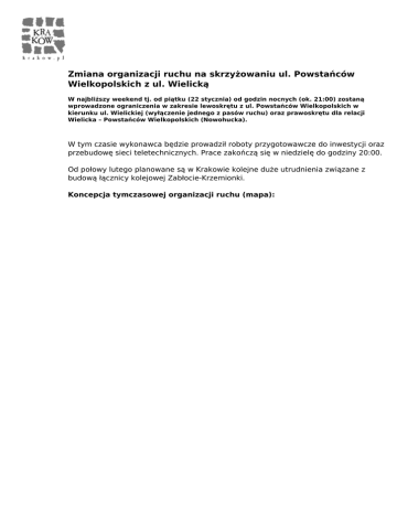 Zmiana organizacji ruchu na skrzyżowaniu ul. Powstańców Wielkopolskich z ul. Wielicką W najbliższy weekend tj. od piątku (22 stycznia) od godzin nocnych (ok. 21:00) zostaną wprowadzone ograniczenia w zakresie lewoskrętu z ul. Powstańców Wielkopolskich w kierunku ul. Wielickiej (wyłączenie jednego z pasów ruchu) oraz prawoskrętu dla relacji Wielicka – Powstańców Wielkopolskich (Nowohucka). W tym czasie wykonawca będzie prowadził roboty przygotowawcze do inwestycji oraz przebudowę sieci teletechnicznych. Prace zakończą się w niedzielę do godziny 20:00. Od połowy lutego planowane są w Krakowie kolejne duże utrudnienia związane z budową łącznicy kolejowej Zabłocie-Krzemionki. Koncepcja tymczasowej organizacji ruchu (mapa): Powered by TCPDF (www.tcpdf.org)