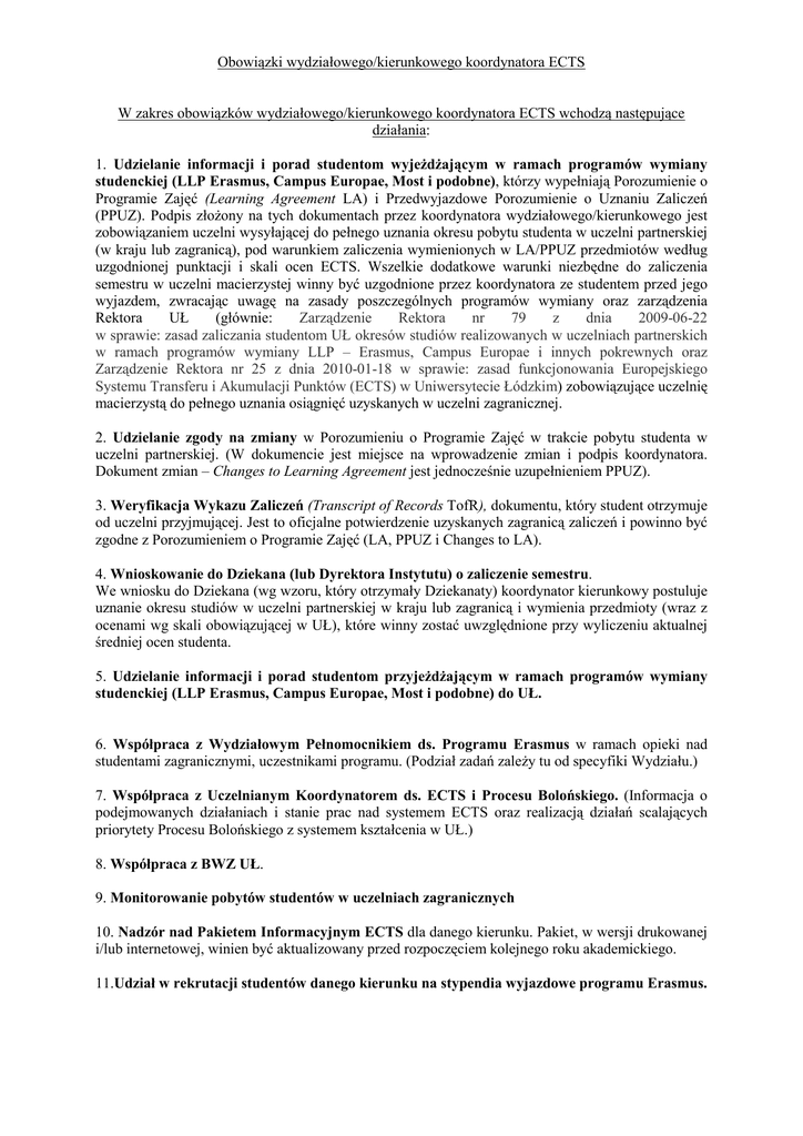 Obowiązki wydziałowego/kierunkowego koordynatora ECTS W zakres obowiązków wydziałowego/kierunkowego koordynatora ECTS wchodzą następujące działania: 1. Udzielanie informacji i porad studentom wyjeżdżającym w ramach programów wymiany studenckiej (LLP Erasmus, Campus Europae, Most i podobne), którzy wypełniają Porozumienie o Programie Zajęć (Learning Agreement LA) i Przedwyjazdowe Porozumienie o Uznaniu Zaliczeń (PPUZ). Podpis złożony na tych dokumentach przez koordynatora wydziałowego/kierunkowego jest zobowiązaniem uczelni wysyłającej do pełnego uznania okresu pobytu studenta w uczelni partnerskiej (w kraju lub zagranicą), pod warunkiem zaliczenia wymienionych w LA/PPUZ przedmiotów według uzgodnionej punktacji i skali ocen ECTS. Wszelkie dodatkowe warunki niezbędne do zaliczenia semestru w uczelni macierzystej winny być uzgodnione przez koordynatora ze studentem przed jego wyjazdem, zwracając uwagę na zasady poszczególnych programów wymiany oraz zarządzenia Zarządzenie Rektora nr 79 z dnia 2009-06-22 Rektora UŁ (głównie: w sprawie: zasad zaliczania studentom UŁ okresów studiów realizowanych w uczelniach partnerskich w ramach programów wymiany LLP – Erasmus, Campus Europae i innych pokrewnych oraz Zarządzenie Rektora nr 25 z dnia 2010-01-18 w sprawie: zasad funkcjonowania Europejskiego Systemu Transferu i Akumulacji Punktów (ECTS) w Uniwersytecie Łódzkim) zobowiązujące uczelnię macierzystą do pełnego uznania osiągnięć uzyskanych w uczelni zagranicznej. 2. Udzielanie zgody na zmiany w Porozumieniu o Programie Zajęć w trakcie pobytu studenta w uczelni partnerskiej. (W dokumencie jest miejsce na wprowadzenie zmian i podpis koordynatora. Dokument zmian – Changes to Learning Agreement jest jednocześnie uzupełnieniem PPUZ). 3. Weryfikacja Wykazu Zaliczeń (Transcript of Records TofR), dokumentu, który student otrzymuje od uczelni przyjmującej. Jest to oficjalne potwierdzenie uzyskanych zagranicą zaliczeń i powinno być zgodne z Porozumieniem o Programie Zajęć (LA, PPUZ i Changes to LA). 4. Wnioskowanie do Dziekana (lub Dyrektora Instytutu) o zaliczenie semestru. We wniosku do Dziekana (wg wzoru, który otrzymały Dziekanaty) koordynator kierunkowy postuluje uznanie okresu studiów w uczelni partnerskiej w kraju lub zagranicą i wymienia przedmioty (wraz z ocenami wg skali obowiązującej w UŁ), które winny zostać uwzględnione przy wyliczeniu aktualnej średniej ocen studenta. 5. Udzielanie informacji i porad studentom przyjeżdżającym w ramach programów wymiany studenckiej (LLP Erasmus, Campus Europae, Most i podobne) do UŁ. 6. Współpraca z Wydziałowym Pełnomocnikiem ds. Programu Erasmus w ramach opieki nad studentami zagranicznymi, uczestnikami programu. (Podział zadań zależy tu od specyfiki Wydziału.) 7. Współpraca z Uczelnianym Koordynatorem ds. ECTS i Procesu Bolońskiego. (Informacja o podejmowanych działaniach i stanie prac nad systemem ECTS oraz realizacją działań scalających priorytety Procesu Bolońskiego z systemem kształcenia w UŁ.) 8. Współpraca z BWZ UŁ. 9. Monitorowanie pobytów studentów w uczelniach zagranicznych 10. Nadzór nad Pakietem Informacyjnym ECTS dla danego kierunku. Pakiet, w wersji drukowanej i/lub internetowej, winien być aktualizowany przed rozpoczęciem kolejnego roku akademickiego. 11.Udział w rekrutacji studentów danego kierunku na stypendia wyjazdowe programu Erasmus.