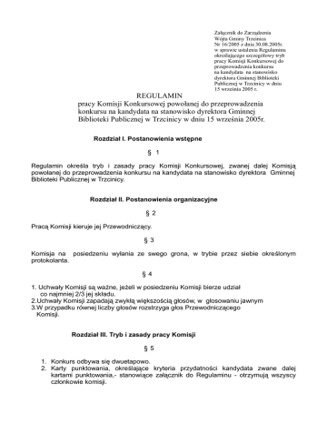 Załącznik do Zarządzenia Wójta Gminy Trzcinica Nr 16/2005 z dnia 30.08.2005r. w sprawie ustalenia Regulaminu określającego szczegółowy tryb pracy Komisji Konkursowej do przeprowadzenia konkursu na kandydata na stanowisko dyrektora Gminnej Biblioteki Publicznej w Trzcinicy w dniu 15 września 2005 r. REGULAMIN pracy Komisji Konkursowej powołanej do przeprowadzenia konkursu na kandydata na stanowisko dyrektora Gminnej Biblioteki Publicznej w Trzcinicy w dniu 15 września 2005r. Rozdział I. Postanowienia wstępne § 1 Regulamin określa tryb i zasady pracy Komisji Konkursowej, zwanej dalej Komisją powołanej do przeprowadzenia konkursu na kandydata na stanowisko dyrektora Gminnej Biblioteki Publicznej w Trzcinicy. Rozdział II. Postanowienia organizacyjne §2 Pracą Komisji kieruje jej Przewodniczący. §3 Komisja na posiedzeniu wyłania ze swego grona, w trybie przez siebie określonym protokolanta. §4 1. Uchwały Komisji są ważne, jeżeli w posiedzeniu Komisji bierze udział co najmniej 2/3 jej składu. 2.Uchwały Komisji zapadają zwykłą większością głosów, w głosowaniu jawnym 3.W przypadku równej liczby głosów rozstrzyga głos Przewodniczącego Komisji. Rozdział III. Tryb i zasady pracy Komisji §5 1. Konkurs odbywa się dwuetapowo. 2. Karty punktowania, określające kryteria przydatności kandydata zwane dalej kartami punktowania,- stanowiące załącznik do Regulaminu - otrzymują wszyscy członkowie komisji. 3. W pierwszym etapie członkowie komisji sprawdzają, czy oferty zostały złożone w terminie i zawierają wszystkie wskazane w ogłoszeniu o konkursie dokumenty oraz czy z dokumentów tych wynika, że kandydat spełnia wymagania wskazane w ogłoszeniu. 4. Oferty złożone po terminie, nie zawierające wszystkich wskazanych w ogłoszeniu o konkursie dokumentów oraz oferty, z których wynika, że kandydat nie spełnia wymagań wskazanych w ogłoszeniu o konkursie podlegają odrzuceniu, a kandydaci nie są dopuszczani do dalszego postępowania konkursowego. 5. Przewodniczący komisji informuje na piśmie kandydatów o dopuszczeniu niedopuszczeniu do dalszego postępowania konkursowego. albo 6. Drugi etap postępowania konkursowego polega na merytorycznej ocenie kandydatów wynikającej z rozmów kwalifikacyjnych przeprowadzonych przez komisję, 7. W trakcie rozmów kwalifikacyjnych kandydaci przedstawiają swoje koncepcje kierowania biblioteką, oraz udzielają odpowiedzi na zadawane pytania, które mogą dotyczyć przedstawionej koncepcji, zagadnień merytorycznych, ekonomicznych lub prawnych związanych z działalnością instytucji kultury. § 6 1. Członkowie komisji oceniają przydatność kandydatów poprzez ocenę punktową na karcie punktowania, którą podpisują swoim imieniem i nazwiskiem, 2. Członkowie komisji dokonują oceny punktowej poprzez wpisanie rubrykę cyfry arabskiej , w odpowiednią 3. Komisja wyłania kandydata na stanowisko dyrektora w głosowaniu jawnym poprzez podniesienie ręki w górę, które oznacza poparcie dla danego kandydata, wstrzymanie się od głosu lub glos przeciw wszystkim kandydatom, 4. Każdy z członków komisji dysponuje jednym głosem, 5. Konkurs jest rozstrzygnięty, jeżeli na jednego z kandydatów oddała glosy zwykła większość obecnych na posiedzeniu członków komisji, 6. W przypadku gdy żaden z kandydatów nie uzyskał większości, o której mowa w ust 5, komisja przeprowadza drugą turę głosowania, do której przechodzą dwaj kandydaci z największą liczba głosów, 7. Konkurs jest rozstrzygnięty, jeżeli w drugim glosowaniu jeden z kandydatów uzyskał większą niż inny kandydat liczbę głosów. § 7 1. Z posiedzenia komisji sporządza się protokół, który podpisują obecni na posiedzeniu członkowie komisji. 2. Do protokołu dołącza się karty punktowania. § 8 O wynikach konkursu przewodniczący komisji niezwłocznie zawiadamia Wójta Gminy Trzcinica i przekazuje mu dokumentację postępowania konkursowego. §9 Wójt Gminy Trzcinica unieważnia konkurs na dyrektora Gminnej Biblioteki Publicznej w Trzcinicy i zarządza ponownie jego przeprowadzenie w przypadku stwierdzenia: a. nieuzasadnionego odrzucenia oferty, b. przeprowadzenia przez komisję postępowania konkursowego bez wymaganej większości 2/3 jej członków; c. innych nieprawidłowości w postępowaniu konkursowym, które mogły wpływać na wynik konkursu. § 10 Nie zgłoszenie się kandydata dopuszczonego do drugiego etapu konkursu – niezależnie od przyczyn eliminuje go z udziału w konkursie. § 11 Członkowie Komisji są zobowiązani do zachowania tajemnicy z całości przebiegu postępowania konkursowego. Rozdział IV. Postanowienia końcowe § 12 Komisja ulega rozwiązaniu z dniem zakończenia postępowania konkursowego, bez względu na wynik tego postępowania. § 13 Członkowie komisji po zapoznaniu się z treścią regulaminu przyjmują go do realizacji potwierdzając podpisem. Za łącznik do Regulaminu określającego szczegó łowy tryb pracy Komisji Konkursowej do przeprowadzenia konkursu na kandydata na stanowisko dyrektora Gminnej Biblioteki Publicznej w Trzcinicy KARTA PUNKTOWA określająca kryteria przydatności kandydata na stanowisko dyrektora Gminnej Biblioteki Publicznej w Trzcinicy Imię i nazwisko kandydata Ocena posiadanych kwalifikacji ( od 0 – 3 pkt ) Trzcinica , dnia ........................ Ocena przedstawionej przez kandydata koncepcji kierowania GBP Ocena rozmowy kwalifikacyjnej z kandydatem ( 0 – 4 pkt ) ( 0 – 6 pkt. ) ..................................................... ( czytelny podpis cz łonka komisji )