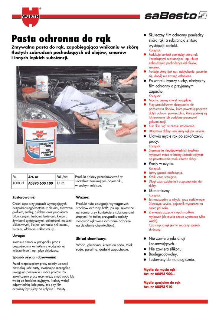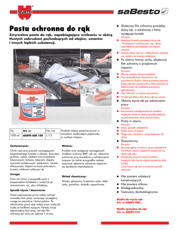 Pasta ochronna do rąk Zmywalna pasta do rąk, zapobiegająca wnikaniu w skórę tłustych zabrudzeń pochodzących od olejów, smarów i innych lepkich substancji. ● Skuteczny film ochronny pomiędzy skórą rąk, a substancją z którą występuje kontakt. Korzyści: ● Redukuje kontakt pomiędzy skórą rąk i brudzącymi substancjami, np.: tłuste zabrudzenia pochodzące od olejów, smarów. ● Funkcje skóry (jak np.: oddychanie, pocenie się, dotyk) nie zostają osłabione. ● Po wtarciu tworzy suchy, elastyczny film ochronny o przyjemnym zapachu. Korzyści: ● Mocny, pewny chwyt narzędzia. ● Przy prawidłowym dozowaniu nie pozostawia śladów, które powstają poprzez dotyk palcami powierzchni, które później są lakierowane lub poddane procesowi galwanizacji. ● Nie “klei się” w czasie stosowania. ● Utrzymuje dobry stan skóry rąk po umyciu. ● Ułatwia mycie rąk po zakończeniu pracy. Korzyści: ● Stosowanie nieodpowiednich środków myjących może w istotny sposób wpłynąć na powstawanie wielu chorób skóry. ● Poj. Art. nr Pak./szt. 1000 ml A0890 600 100 1/12 Produkt należy przechowywać w szczelnie zamkniętym pojemniku, w suchym miejscu. Korzyści: ● Łatwy sposób nakładania. ● Krótki czas schnięcia. ● Długi czas działania i przyczepności do skóry. ● Zastosowanie: Ważne: Chroni ręce przy pracach wymagających bezpośredniego kontaktu z olejami, tłuszczem, grafitem, sadzą, asfaltem oraz produktami bitumicznymi, farbami, lakierami, klejami, żywicami syntetycznymi, poliestrami, masami silikonowymi, klejami na bazie poliuretanu, kurzem, włóknami szklanymi itp. Produkt nuie zastępuje wymaganych środków ochrony BHP, jak np. rękawice ochronne przy kontakcie z substancjami żrącymi (w takim przypadku należy stosować rękawice ochronne odporne na działanie chemikaliów). Uwaga: Krem nie chroni w przypadku prac z bezpośrednim kontaktem z wodą lub jej mieszaninami, np.: płyn chłodzący. Sposób użycia i dozowania: Przed rozpoczęciem pracy należy wetrzeć niewielką ilość pasty, zwracając szczególną uwagę na paznokcie i końce palców. Po zakończeniu pracy ręce należy umyć wodą lub wodą ze środkiem myjącym. Należy wziąć odpowiednią ilość pasty, tak aby film ochronny był suchy po upływie 1 minuty. Skład chemiczny: Woda, gliceryna, krzemian sodu, talek sodu, parafina, dodatki zapachowe. Prosty w użyciu. Ekonomiczny. Korzyści: ● Jest oszczędny w użyciu: przy codziennym 3-krotnym użyciu, pojemnik wystarcza na około pół roku. ● Zmniejsza zużycie innych środków myjących (do mycia często wystarcza tylko woda). Czas mycia rąk jest w znaczny sposób skrócony. Nie zawiera substancji konserwujących. ● Nie zawiera silikonu. ● Biodegradowalny. ● Testowany dermatologicznie. ● Mydło do mycia rąk Art. nr A0893 900... Mydło specjalne do rąk Art. nr A0893 910