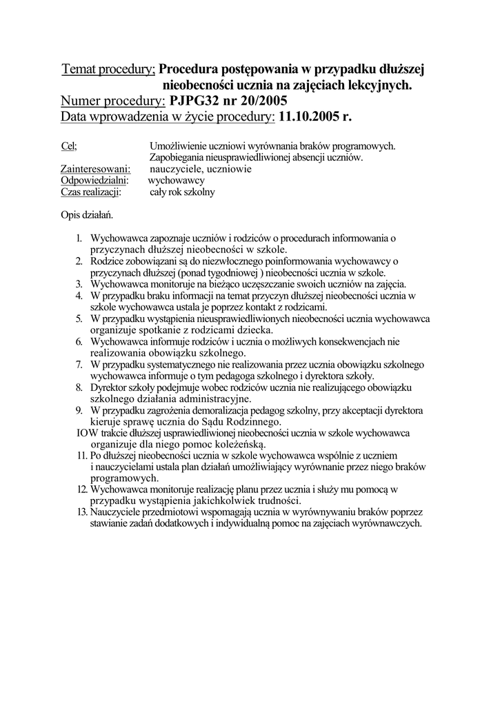 Temat procedury; Procedura postępowania w przypadku dłuższej nieobecności ucznia na zajęciach lekcyjnych. Numer procedury: PJPG32 nr 20/2005 Data wprowadzenia w życie procedury: 11.10.2005 r. Cel; Zainteresowani: Odpowiedzialni: Czas realizacji: Umożliwienie uczniowi wyrównania braków programowych. Zapobiegania nieusprawiedliwionej absencji uczniów. nauczyciele, uczniowie wychowawcy cały rok szkolny Opis działań. 1. Wychowawca zapoznaje uczniów i rodziców o procedurach informowania o przyczynach dłuższej nieobecności w szkole. 2. Rodzice zobowiązani są do niezwłocznego poinformowania wychowawcy o przyczynach dłuższej (ponad tygodniowej ) nieobecności ucznia w szkole. 3. Wychowawca monitoruje na bieżąco uczęszczanie swoich uczniów na zajęcia. 4. W przypadku braku informacji na temat przyczyn dłuższej nieobecności ucznia w szkole wychowawca ustala je poprzez kontakt z rodzicami. 5. W przypadku wystąpienia nieusprawiedliwionych nieobecności ucznia wychowawca organizuje spotkanie z rodzicami dziecka. 6. Wychowawca informuje rodziców i ucznia o możliwych konsekwencjach nie realizowania obowiązku szkolnego. 7. W przypadku systematycznego nie realizowania przez ucznia obowiązku szkolnego wychowawca informuje o tym pedagoga szkolnego i dyrektora szkoły. 8. Dyrektor szkoły podejmuje wobec rodziców ucznia nie realizującego obowiązku szkolnego działania administracyjne. 9. W przypadku zagrożenia demoralizacja pedagog szkolny, przy akceptacji dyrektora kieruje sprawę ucznia do Sądu Rodzinnego. IOW trakcie dłuższej usprawiedliwionej nieobecności ucznia w szkole wychowawca organizuje dla niego pomoc koleżeńską. 11. Po dłuższej nieobecności ucznia w szkole wychowawca wspólnie z uczniem i nauczycielami ustala plan działań umożliwiający wyrównanie przez niego braków programowych. 12. Wychowawca monitoruje realizację planu przez ucznia i służy mu pomocą w przypadku wystąpienia jakichkolwiek trudności. 13. Nauczyciele przedmiotowi wspomagają ucznia w wyrównywaniu braków poprzez stawianie zadań dodatkowych i indywidualną pomoc na zajęciach wyrównawczych.