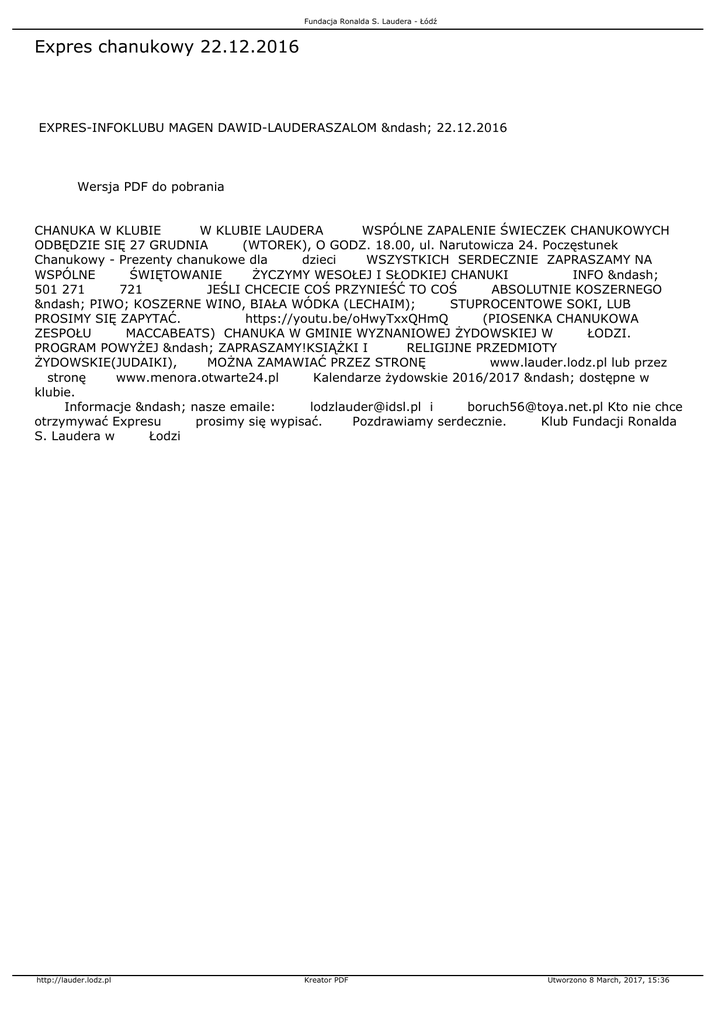 Fundacja Ronalda S. Laudera - Łódź Expres chanukowy 22.12.2016 EXPRES-INFOKLUBU MAGEN DAWID-LAUDERASZALOM – 22.12.2016 Wersja PDF do pobrania CHANUKA W KLUBIE W KLUBIE LAUDERA WSPÓLNE ZAPALENIE ŚWIECZEK CHANUKOWYCH ODBĘDZIE SIĘ 27 GRUDNIA (WTOREK), O GODZ. 18.00, ul. Narutowicza 24. Poczęstunek Chanukowy - Prezenty chanukowe dla dzieci WSZYSTKICH SERDECZNIE ZAPRASZAMY NA WSPÓLNE ŚWIĘTOWANIE ŻYCZYMY WESOŁEJ I SŁODKIEJ CHANUKI INFO – 501 271 721 JEŚLI CHCECIE COŚ PRZYNIEŚĆ TO COŚ ABSOLUTNIE KOSZERNEGO – PIWO; KOSZERNE WINO, BIAŁA WÓDKA (LECHAIM); STUPROCENTOWE SOKI, LUB PROSIMY SIĘ ZAPYTAĆ. https://youtu.be/oHwyTxxQHmQ (PIOSENKA CHANUKOWA ZESPOŁU MACCABEATS) CHANUKA W GMINIE WYZNANIOWEJ ŻYDOWSKIEJ W ŁODZI. PROGRAM POWYŻEJ – ZAPRASZAMY!KSIĄŻKI I RELIGIJNE PRZEDMIOTY ŻYDOWSKIE(JUDAIKI), MOŻNA ZAMAWIAĆ PRZEZ STRONĘ www.lauder.lodz.pl lub przez stronę www.menora.otwarte24.pl Kalendarze żydowskie 2016/2017 – dostępne w klubie. Informacje – nasze emaile: [email protected] i [email protected] Kto nie chce otrzymywać Expresu prosimy się wypisać. Pozdrawiamy serdecznie. Klub Fundacji Ronalda S. Laudera w Łodzi http://lauder.lodz.pl Kreator PDF Utworzono 8 March, 2017, 15:36