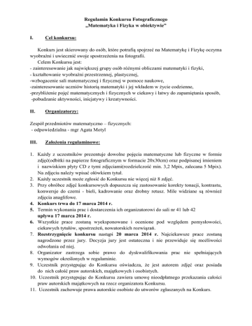 Regulamin Konkursu Fotograficznego „Matematyka i Fizyka w obiektywie” I. Cel konkursu: Konkurs jest skierowany do osób, które potrafią spojrzeć na Matematykę i Fizykę oczyma wyobraźni i uwiecznić swoje spostrzeżenia na fotografii. Celem Konkursu jest: - zainteresowanie jak największej grupy osób różnymi obliczami matematyki i fizyki, - kształtowanie wyobraźni przestrzennej, plastycznej, -wzbogacenie sali matematycznej i fizycznej w pomoce naukowe, -zainteresowanie uczniów historią matematyki i jej wkładem w życie codzienne, -przybliżenie pojęć matematycznych i fizycznych w ciekawy i łatwy do zapamiętania sposób, -pobudzanie aktywności, inicjatywy i kreatywności. II. Organizatorzy: Zespół przedmiotów matematyczno – fizycznych: - odpowiedzialna - mgr Agata Motyl III. Założenia regulaminowe: 1. Każdy z uczestników prezentuje dowolne pojęcia matematyczne lub fizyczne w formie zdjęć(odbitki na papierze fotograficznym w formacie 20x30cm) oraz podpisanej imieniem i nazwiskiem płyty CD z tymi zdjęciami(rozdzielczość min. 3,2 Mpix, zalecana 5 Mpix). Na zdjęciu należy wpisać ołówkiem tytuł. 2. Każdy uczestnik może zgłosić do Konkursu nie więcej niż 8 zdjęć. 3. Przy obróbce zdjęć konkursowych dopuszcza się zastosowanie korekty tonacji, kontrastu, konwersje do czerni - bieli, kadrowanie oraz drobny retusz. Mile widziane są również zdjęcia anaglifowe. 4. Konkurs trwa do 17 marca 2014 r. 5. Termin wykonania prac i dostarczenia ich organizatorowi do sali nr 41 lub 42 upływa 17 marca 2014 r. 6. Wszystkie prace zostaną wyeksponowane i ocenione pod względem pomysłowości, ciekawych tytułów, spostrzeżeń, nowatorskich rozwiązań. 7. Rozstrzygnięcie konkursu nastąpi 20 marca 2014 r. Najciekawsze prace zostaną nagrodzone przez jury. Decyzja jury jest ostateczna i nie przewiduje się możliwości odwołania od niej. 8. Organizator zastrzega sobie prawo do dyskwalifikowania prac nie spełniających wymogów określonych w regulaminie. 9. Uczestnik przystępując do Konkursu oświadcza, że jest autorem zdjęć oraz posiada do nich całość praw autorskich, majątkowych i osobistych. 10. Uczestnik przystępując do Konkursu zawiera umowę nieodpłatnego przekazania całości praw autorskich majątkowych na rzecz organizatora Konkursu. 11. Uczestnik zachowuje prawa autorskie osobiste do utworów zgłaszanych na Konkurs. 12. Organizator nie zwraca prac konkursowych, prac zdyskwalifikowanych, wyłączonych z niego i dostarczonych po terminie. Prace zgłoszone do konkursu stają się własnością organizatora. 13. W Konkursie mogą brać udział wyłącznie te prace, które nie były nigdzie publikowane, ani nie brały udziału w żadnym innym konkursie. 14. Organizator nie pokrywa kosztów związanych z uczestnictwem w Konkursie (w szczególności kosztu druku zdjęć, kosztu zakupu płyt). 15. Zgłoszenie prac na Konkurs oznacza akceptację jego regulaminu. 16. Organizator zastrzega sobie prawo do zmiany regulaminu oraz podejmowania decyzji w sprawach nieuregulowanych niniejszym regulaminem. SERDECZNIE ZAPRASZAMY