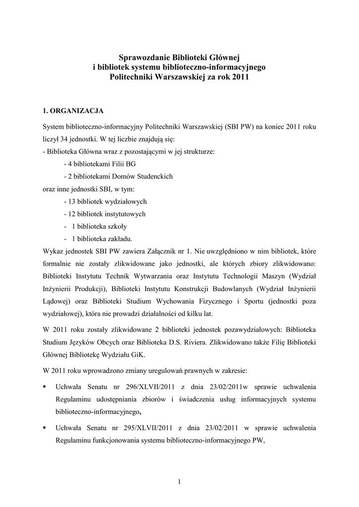 Sprawozdanie Biblioteki Głównej i bibliotek systemu biblioteczno-informacyjnego Politechniki Warszawskiej za rok 2011 1. ORGANIZACJA System biblioteczno-informacyjny Politechniki Warszawskiej (SBI PW) na koniec 2011 roku liczył 34 jednostki. W tej liczbie znajdują się: - Biblioteka Główna wraz z pozostającymi w jej strukturze: - 4 bibliotekami Filii BG - 2 bibliotekami Domów Studenckich oraz inne jednostki SBI, w tym: - 13 bibliotek wydziałowych - 12 bibliotek instytutowych - 1 biblioteka szkoły - 1 biblioteka zakładu. Wykaz jednostek SBI PW zawiera Załącznik nr 1. Nie uwzględniono w nim bibliotek, które formalnie nie zostały zlikwidowane jako jednostki, ale których zbiory zlikwidowano: Biblioteki Instytutu Technik Wytwarzania oraz Instytutu Technologii Maszyn (Wydział Inżynierii Produkcji), Biblioteki Instytutu Konstrukcji Budowlanych (Wydział Inżynierii Lądowej) oraz Biblioteki Studium Wychowania Fizycznego i Sportu (jednostki poza wydziałowej), która nie prowadzi działalności od kilku lat. W 2011 roku zostały zlikwidowane 2 biblioteki jednostek pozawydziałowych: Biblioteka Studium Języków Obcych oraz Biblioteka D.S. Riviera. Zlikwidowano także Filię Biblioteki Głównej Bibliotekę Wydziału GiK. W 2011 roku wprowadzono zmiany uregulowań prawnych w zakresie: Uchwała Senatu nr 296/XLVII/2011 z dnia 23/02/2011w sprawie uchwalenia Regulaminu udostępniania zbiorów i świadczenia usług informacyjnych systemu biblioteczno-informacyjnego, Uchwała Senatu nr 295/XLVII/2011 z dnia 23/02/2011 w sprawie uchwalenia Regulaminu funkcjonowania systemu biblioteczno-informacyjnego PW, 1 Zarządzenie Rektora nr 015/2011 z dnia 30/03/2011zmieniające zarządzenie Rektora nr 30/2009 z dnia 24 września 2009 w sprawie wprowadzenia Regulaminu Organizacyjnego Biblioteki Głównej Politechniki Warszawskiej. Zgodnie z Decyzją nr 39/2011 Rektora Politechniki Warszawskiej z dnia 12 maja 2011 r. w sprawie oceny funkcjonowania Systemu Biblioteczno-Informacyjnego Politechniki Warszawskiej powołany przez Rektora 11-osobowy Zespół podjął działania zmierzające do zbadania funkcjonowania SBI.1. Dla wielu pracowników bibliotek wyjątkowe znaczenie miała Decyzja Rektora nr 080/2011 z dnia 14-10-2011 w sprawie wymiaru urlopu dla bibliotekarzy zatrudnionych na stanowiskach kustosza bibliotecznego, starszego bibliotekarza i starszego dokumentalisty w Politechnice Warszawskiej, którzy nabyli uprawnienia na podstawie ustawy o szkolnictwie wyższym z dnia 12 września 1990 roku. Decyzja kończy wieloletnie starania tej grupy pracowników o przywrócenie 36-dniowego urlopu osobom, które nabyły do niego prawo na mocy ustawy z 1990 roku. Dotyczy to grupy 36-osób spośród zatrudnionych w całym systemie w tym czasie. Zgodnie z Decyzją Rektora uprawnienie objęło rok 2011, a także lata 2008-2010 (łącznie należnego urlopu pracownicy SBI mają z tego tytułu ponad 1200 dni) i tylko niewielką jego część mogli odebrać w 2011 roku. W związku z Uchwałą nr 377/XLVII/2011 Senatu Politechniki Warszawskiej z dnia 21 grudnia 2011 r. w sprawie zmiany Statutu Politechniki Warszawskiej, na szczególną uwagę zasługują następujące zmiany dotyczące SBI, w tym: § 26 — nazwa Szkoły Nauk Technicznych i Społecznych w Płocku na Filia Politechniki Warszawskiej w Płocku (skutkująca zmianą nazwy Filii BG w Płocku2, § 111 — zasad tworzenia, przekształcania i likwidacji bibliotek specjalistycznych, § 113 ust. 2 pkt. 6 — zniesienie obowiązku opiniowania przez Radę Biblioteczną awansów na stanowisko starszego bibliotekarza i kustosza. Systematycznie porządkowane są procedury i zakresy zadań pracowników jednostek SBI opracowywane we współpracy z Zespołem ds. Systemu Zarządzania Jakością w Administracji 1 Sprawozdanie Zespołu ds. oceny funkcjonowania Systemu –Biblioteczno-Informacyjnego przedstawiono Radzie Bibliotecznej na spotkaniu w dniu 13 marca 2012 roku. 2 Zarządzenie Rektora nr 019/2012 z dnia 27/02/2012 zmieniające zarządzenie nr 30/2009 Rektora PW z dnia 24 września 2009 w sprawie wprowadzenia Regulaminu Organizacyjnego Biblioteki Głównej Politechniki Warszawskiej 2 PW. W 2011 roku wprowadzono w wielu bibliotekach, procedury segregacji i selekcji zbiorów (na podstawie Procedury ramowej nr 1/USZJA/BG/2010). Opracowywano także zakresy zadań kierowników i pracowników kilku jednostek SBI oraz Filii BG PW. 1.1 Pracownicy Liczba etatów w 2011 roku w całym SBI PW wyniosła ogółem 132,58. Zatrudniano łącznie 151 bibliotekarzy [Załącznik nr 2]. Dwie osoby, w wyniku pomyślnie zdanego w roku 2010 egzaminu kwalifikacyjnego, uzyskały uprawnienia kustosza dyplomowanego i od 2011 zostały zatrudnione na stanowisku kustosza dyplomowanego. W 2011 roku awansowały na stanowisko kustosza 4 osoby, oraz 4 na stanowisko starszego bibliotekarza. W związku z wdrażaniem nowej struktury organizacyjnej w BG powołano 3 kierowników sekcji. Rada Biblioteczna zaakceptowała także kandydata na nowego kierownika Filii Biblioteki Głównej Biblioteki Wydziału Chemicznego. Przedstawiciele Biblioteki Głównej pracowali w Komisjach Senackich: ds. Nauki, ds. Organizacji Uczelni, ds. Współpracy z Zagranicą, ds. Historii i Tradycji, ds. Rozwoju Kampusów Akademickich oraz ds. Kształcenia oraz w Radzie Muzealnej. Odbyło się 5 posiedzeń Rady Bibliotecznej. Przedstawiciele Biblioteki Głównej współpracowali także z instytucjami i bibliotekami zewnętrznymi. Wśród tych działań na uwagę zasługuje szczególnie udział trzech osób z grona pracowników BG w pracach powołanych przez Radę Wykonawczą Konferencji Dyrektorów Bibliotek Akademickich Szkół Polskich: – Zespole ds. deduplikacji (przekształcony w StatEl), którego celem było uporządkowanie terminologii dotyczącej źródeł elektronicznych oraz ujednolicenie danych statystycznych o tych zasobach dla celów ankiet i rankingów prasowych (2 osoby); – Zespole ds. multiwyszukiwarek, 
