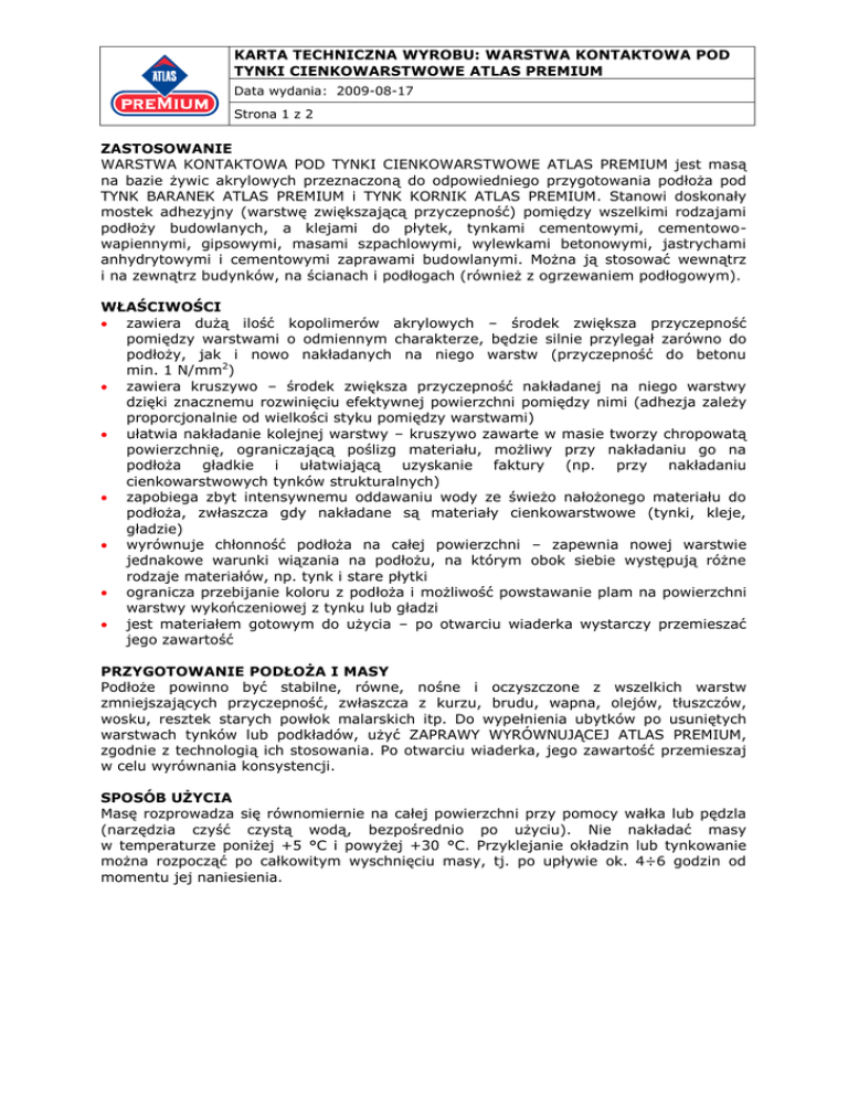 KARTA TECHNICZNA WYROBU: WARSTWA KONTAKTOWA POD TYNKI CIENKOWARSTWOWE ATLAS PREMIUM Data wydania: 2009-08-17 Strona 1 z 2 ZASTOSOWANIE WARSTWA KONTAKTOWA POD TYNKI CIENKOWARSTWOWE ATLAS PREMIUM jest masą na bazie żywic akrylowych przeznaczoną do odpowiedniego przygotowania podłoża pod TYNK BARANEK ATLAS PREMIUM i TYNK KORNIK ATLAS PREMIUM. Stanowi doskonały mostek adhezyjny (warstwę zwiększającą przyczepność) pomiędzy wszelkimi rodzajami podłoży budowlanych, a klejami do płytek, tynkami cementowymi, cementowowapiennymi, gipsowymi, masami szpachlowymi, wylewkami betonowymi, jastrychami anhydrytowymi i cementowymi zaprawami budowlanymi. Można ją stosować wewnątrz i na zewnątrz budynków, na ścianach i podłogach (również z ogrzewaniem podłogowym). WŁAŚCIWOŚCI zawiera dużą ilość kopolimerów akrylowych – środek zwiększa przyczepność pomiędzy warstwami o odmiennym charakterze, będzie silnie przylegał zarówno do podłoży, jak i nowo nakładanych na niego warstw (przyczepność do betonu min. 1 N/mm2) zawiera kruszywo – środek zwiększa przyczepność nakładanej na niego warstwy dzięki znacznemu rozwinięciu efektywnej powierzchni pomiędzy nimi (adhezja zależy proporcjonalnie od wielkości styku pomiędzy warstwami) ułatwia nakładanie kolejnej warstwy – kruszywo zawarte w masie tworzy chropowatą powierzchnię, ograniczającą poślizg materiału, możliwy przy nakładaniu go na podłoża gładkie i ułatwiającą uzyskanie faktury (np. przy nakładaniu cienkowarstwowych tynków strukturalnych) zapobiega zbyt intensywnemu oddawaniu wody ze świeżo nałożonego materiału do podłoża, zwłaszcza gdy nakładane są materiały cienkowarstwowe (tynki, kleje, gładzie) wyrównuje chłonność podłoża na całej powierzchni – zapewnia nowej warstwie jednakowe warunki wiązania na podłożu, na którym obok siebie występują różne rodzaje materiałów, np. tynk i stare płytki ogranicza przebijanie koloru z podłoża i możliwość powstawanie plam na powierzchni warstwy wykończeniowej z tynku lub gładzi jest materiałem gotowym do użycia – po otwarciu wiaderka wystarczy przemieszać jego zawartość PRZYGOTOWANIE PODŁOŻA I MASY Podłoże powinno być stabilne, równe, nośne i oczyszczone z wszelkich warstw zmniejszających przyczepność, zwłaszcza z kurzu, brudu, wapna, olejów, tłuszczów, wosku, resztek starych powłok malarskich itp. Do wypełnienia ubytków po usuniętych warstwach tynków lub podkładów, użyć ZAPRAWY WYRÓWNUJĄCEJ ATLAS PREMIUM, zgodnie z technologią ich stosowania. Po otwarciu wiaderka, jego zawartość przemieszaj w celu wyrównania konsystencji. SPOSÓB UŻYCIA Masę rozprowadza się równomiernie na całej powierzchni przy pomocy wałka lub pędzla (narzędzia czyść czystą wodą, bezpośrednio po użyciu). Nie nakładać masy w temperaturze poniżej +5 °C i powyżej +30 °C. Przyklejanie okładzin lub tynkowanie można rozpocząć po całkowitym wyschnięciu masy, tj. po upływie ok. 4÷6 godzin od momentu jej naniesienia. KARTA TECHNICZNA WYROBU: WARSTWA KONTAKTOWA POD TYNKI CIENKOWARSTWOWE ATLAS PREMIUM Data wydania: 2009-08-17 Strona 2 z 2 ZUŻYCIE Średnio zużywa się ok. 0,2 kilograma masy na 1 m² powierzchni. DOSTĘPNE OPAKOWANIA Wiadra plastikowe: 5 kg, 10 kg. PRZECHOWYWANIE I TRANSPORT Okres przydatności do użycia masy wynosi 12 miesięcy od daty produkcji umieszczonej na opakowaniu. Środek należy przewozić i przechowywać w szczelnie zamkniętych wiaderkach, w suchych warunkach, w temperaturze dodatniej (najlepiej na paletach). Chronić przed przegrzaniem. Nie wolno pozostawiać otwartych napoczętych pojemników. DOKUMENTY FORMALNO-PRAWNE Nie są wymagane, ponieważ produkt nie jest klasyfikowany jako wyrób budowlany zgodnie z obowiązującymi przepisami. Niniejsze informacje stanowią podstawowe wytyczne, dotyczące stosowania wyrobu i nie zwalniają z obowiązku wykonywania prac zgodnie z zasadami sztuki budowlanej i przepisami BHP. Wraz z wydaniem niniejszej karty technicznej, wszystkie poprzednie tracą ważność. Data aktualizacji: 2009-08-18