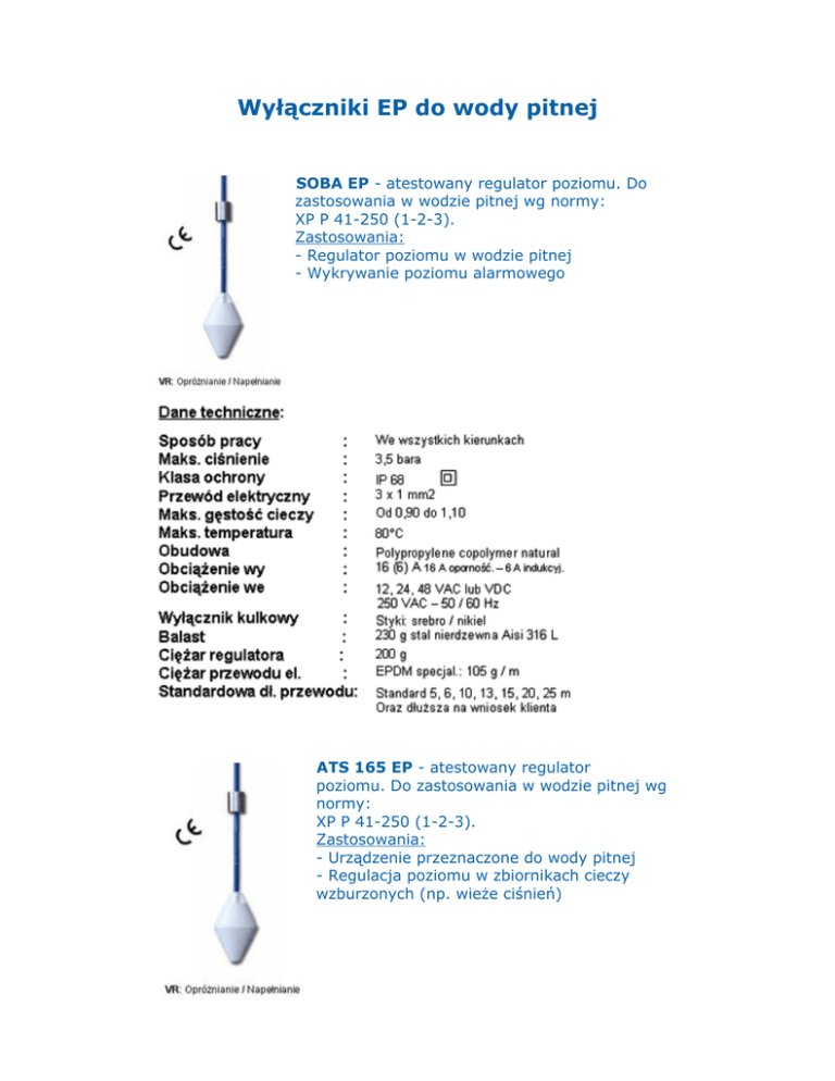 Wyłączniki EP do wody pitnej SOBA EP - atestowany regulator poziomu. Do zastosowania w wodzie pitnej wg normy: XP P 41-250 (1-2-3). Zastosowania: - Regulator poziomu w wodzie pitnej - Wykrywanie poziomu alarmowego ATS 165 EP - atestowany regulator poziomu. Do zastosowania w wodzie pitnej wg normy: XP P 41-250 (1-2-3). Zastosowania: - Urządzenie przeznaczone do wody pitnej - Regulacja poziomu w zbiornikach cieczy wzburzonych (np. wieże ciśnień)