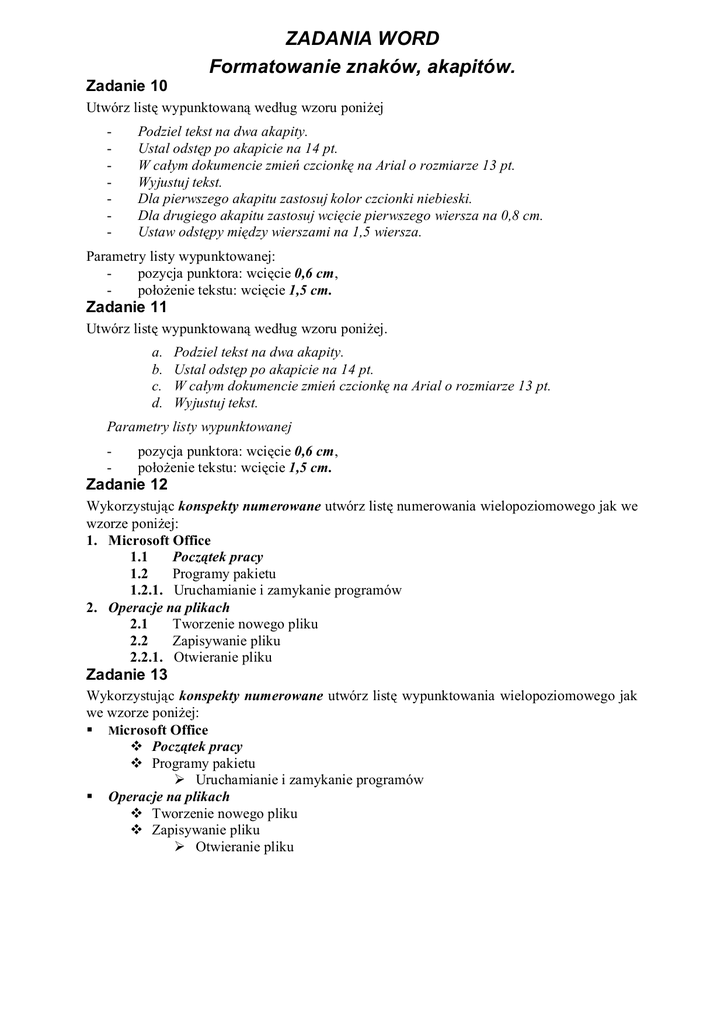 ZADANIA WORD Formatowanie znaków, akapitów. Zadanie 10 Utwórz listę wypunktowaną według wzoru poniżej - Podziel tekst na dwa akapity. Ustal odstęp po akapicie na 14 pt. W całym dokumencie zmień czcionkę na Arial o rozmiarze 13 pt. Wyjustuj tekst. Dla pierwszego akapitu zastosuj kolor czcionki niebieski. Dla drugiego akapitu zastosuj wcięcie pierwszego wiersza na 0,8 cm. Ustaw odstępy między wierszami na 1,5 wiersza. Parametry listy wypunktowanej: pozycja punktora: wcięcie 0,6 cm, położenie tekstu: wcięcie 1,5 cm. Zadanie 11 Utwórz listę wypunktowaną według wzoru poniżej. a. b. c. d. Podziel tekst na dwa akapity. Ustal odstęp po akapicie na 14 pt. W całym dokumencie zmień czcionkę na Arial o rozmiarze 13 pt. Wyjustuj tekst. Parametry listy wypunktowanej - pozycja punktora: wcięcie 0,6 cm, położenie tekstu: wcięcie 1,5 cm. Zadanie 12 Wykorzystując konspekty numerowane utwórz listę numerowania wielopoziomowego jak we wzorze poniżej: 1. Microsoft Office 1.1 Początek pracy 1.2 Programy pakietu 1.2.1. Uruchamianie i zamykanie programów 2. Operacje na plikach 2.1 Tworzenie nowego pliku 2.2 Zapisywanie pliku 2.2.1. Otwieranie pliku Zadanie 13 Wykorzystując konspekty numerowane utwórz listę wypunktowania wielopoziomowego jak we wzorze poniżej: § Microsoft Office v Początek pracy v Programy pakietu Ø Uruchamianie i zamykanie programów § Operacje na plikach v Tworzenie nowego pliku v Zapisywanie pliku Ø Otwieranie pliku