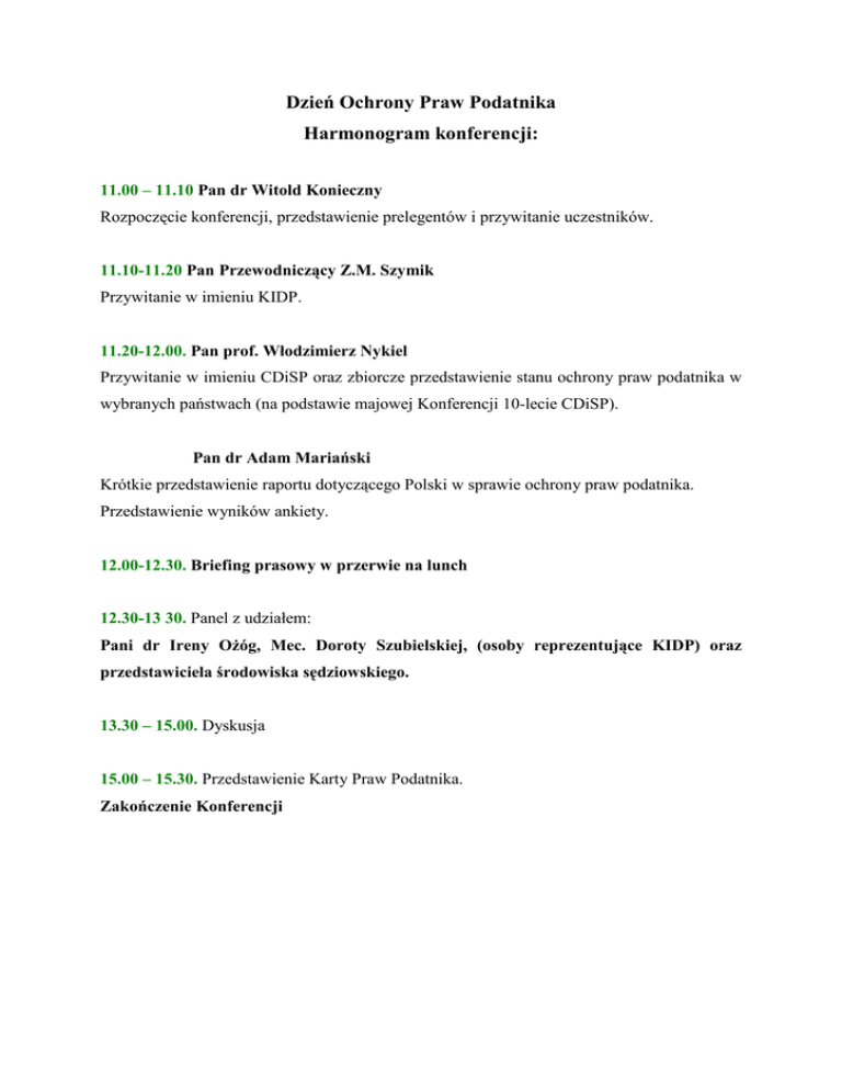 Dzień Ochrony Praw Podatnika Harmonogram konferencji: 11.00 – 11.10 Pan dr Witold Konieczny Rozpoczęcie konferencji, przedstawienie prelegentów i przywitanie uczestników. 11.10-11.20 Pan Przewodniczący Z.M. Szymik Przywitanie w imieniu KIDP. 11.20-12.00. Pan prof. Włodzimierz Nykiel Przywitanie w imieniu CDiSP oraz zbiorcze przedstawienie stanu ochrony praw podatnika w wybranych państwach (na podstawie majowej Konferencji 10-lecie CDiSP). Pan dr Adam Mariański Krótkie przedstawienie raportu dotyczącego Polski w sprawie ochrony praw podatnika. Przedstawienie wyników ankiety. 12.00-12.30. Briefing prasowy w przerwie na lunch 12.30-13 30. Panel z udziałem: Pani dr Ireny OŜóg, Mec. Doroty Szubielskiej, (osoby reprezentujące KIDP) oraz przedstawiciela środowiska sędziowskiego. 13.30 – 15.00. Dyskusja 15.00 – 15.30. Przedstawienie Karty Praw Podatnika. Zakończenie Konferencji