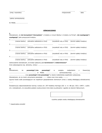 ………………………………….. (imię i nazwisko) ……………………………, miejscowość ……………… data …………………………………. (adres zamieszkania) Nr PESEL …………………………. OŚWIADCZENIE I. Oświadczam, Ŝe nie korzystam*/korzystam* z kredytu w innym Banku/ z kredytu na Firmę*, nie występuję*/ występuję* jako poręczyciel kredytu: 1. ............................... ................................. .......................... ................................... (nazwa banku) (aktualne zadłuŜenie w PLN) (wysokość raty w PLN) (termin spłaty kredytu) 2. ................................... ....................................... .................................. ................................... (nazwa banku) (aktualne zadłuŜenie w PLN) (wysokość raty w PLN) (termin spłaty kredytu) 3. ................................... ....................................... .................................. ................................... (nazwa banku) (aktualne zadłuŜenie w PLN) (wysokość raty w PLN) (termin spłaty kredytu) 4. ................................... ....................................... .................................. ................................... (nazwa banku) (aktualne zadłuŜenie w PLN) (wysokość raty w PLN) (termin spłaty kredytu) Jednocześnie oświadczam, Ŝe kredyt spłacany jest terminowo*/ nieterminowo* Inne zobowiązania (np. alimenty, renty): .................................................................................................. II. Oświadczam, Ŝe pozostaję*/nie ...................................................., nr pozostaję* PESEL w …….................... związku małŜeńskim zamieszkałym(łą) __-___ z Panem(ią) …………………….., …………………………………… oraz pozostaję*/nie pozostaję* w stanie małŜeńskiej wspólności ustawowej. Oświadczam, Ŝe na moim utrzymaniu pozostaje …...... dzieci oraz inne osoby .......... Łączna liczba osób pozostających we wspólnym gospodarstwie domowym (wraz z osobą składającą oświadczenie) ………. Świadomy(a) odpowiedzialności karnej z tytułu art. 297 Kodeksu Karnego (DZ. U. nr. 88 poz. 553 z 1997r. z późn. zm.) oświadczam, Ŝe wszystkie podane wyŜej przeze mnie dane są aktualne i zgodne ze stanem faktycznym. czytelny podpis osoby składającej oświadczenie * niepotrzebne skreślić