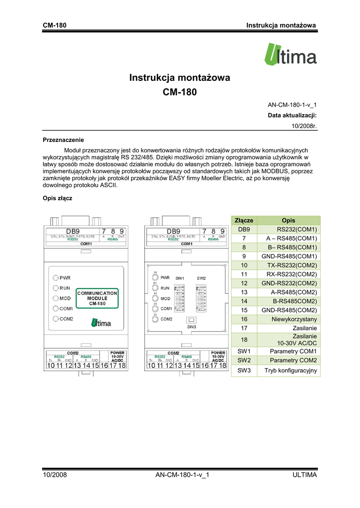 Instrukcja montażowa CM-180 Instrukcja montażowa CM-180 AN-CM-180-1-v_1 Data aktualizacji: 10/2008r. Przeznaczenie Moduł przeznaczony jest do konwertowania różnych rodzajów protokołów komunikacyjnych wykorzystujących magistralę RS 232/485. Dzięki możliwości zmiany oprogramowania użytkownik w łatwy sposób może dostosować działanie modułu do własnych potrzeb. Istnieje baza oprogramowań implementujących konwersję protokołów począwszy od standardowych takich jak MODBUS, poprzez zamknięte protokoły jak protokół przekaźników EASY firmy Moeller Electric, aż po konwersję dowolnego protokołu ASCII. Opis złącz Złącze Opis DB9 7 8 9 10 RS232(COM1) A – RS485(COM1) B– RS485(COM1) GND-RS485(COM1) TX-RS232(COM2) 11 12 13 14 15 16 17 SW1 RX-RS232(COM2) GND-RS232(COM2) A-RS485(COM2) B-RS485COM2) GND-RS485(COM2) Niewykorzystany Zasilanie Zasilanie 10-30V AC/DC Parametry COM1 SW2 Parametry COM2 SW3 Tryb konfiguracyjny 18 10/2008 AN-CM-180-1-v_1 ULTIMA Instrukcja montażowa CM-180 Sposób montażu Uwaga! Montaż modułu zależy od wgranego do niego oprogramowania. Szczegółowy opis w instrukcji obsługi modułu CM-180 (DS-CM-360-1-v1). Parametry techniczne Parametr Napięcie zasilania Maksymalna moc modułu bez obciążenia Wilgotność względna pracy Wilgotność względna przechowywania Temperatura pracy Temperatura przechowywania Napięcie izolacji Pamięć parametrów Stopień ochrony zacisków Stopień ochrony obudowy Montaż Ciężar Wymiary z konektorami Opis 7…30 VAC/VDC 2VA 20% … 95% 20% … 95% -10⁰C … 60⁰C -20⁰C … 70⁰C 3kV DC EEPROM IP-20 wg DIN 40050/EC 529 IP-43 wg DIN 40050/EC 529 Na wspornikach szynowych wg PN/E-06292 lub DIN EN 50 022-35 116 g 52 x 92,2 x 58 mm Kontakt Adres: ULTIMA Ul. Okrężna 1 81-822 Sopot Tel./Fax. - +48(058) 341 16 61 Adres internetowy: www.ultima-automatyka.pl 10/2008 AN-CM-180-1-v_1 ULTIMA