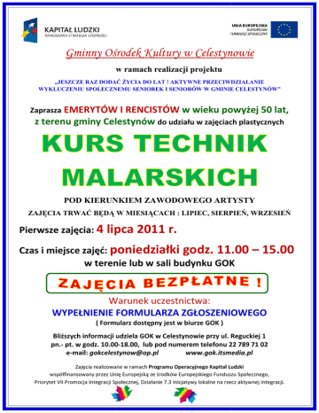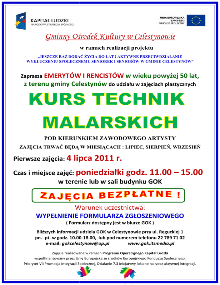 Gminny Ośrodek Kultury w Celestynowie w ramach realizacji projektu „JESZCZE RAZ DODAĆ śYCIA YCIA DO LAT ! AKTYWNE PRZECIWDZIAŁANIE WYKLUCZENIU SPOŁECZNEMU SENIOREK I SENIORÓW W GMINIE CELESTYNÓW” Zaprasza EMERYTÓW I RENCISTÓW w wieku powyżej 50 lat, z terenu gminy Celestynów do udziału w zajęciach plastycznych POD KIERUNKIEM ZAWODOWEGO ARTYSTY ZAJĘCIA TRWAĆ BĘDĄ Ą W MIESI MIESIĄCACH CACH : LIPIEC, SIERPIEŃ, SIERPIE WRZESIEŃ Pierwsze zajęcia: 4 lipca 2011 r. Czas i miejsce zajęć: poniedziałki godz. 11.00 – 15.00 w terenie lub w sali budynku GOK Warunek uczestnictwa: WYPEŁNIENIE FORMULARZA ZGŁOSZENIOWEGO ( Formularz dostępny jest w biurze GOK ) Bliższych informacji udziela GOK w Celestynowie przy ul. Reguckiej 1 pn.- pt. w godz. 10.00-18.00, 10.00 lub pod numerem telefonu 22 789 71 02 e-mail: [email protected] www.gok.itsmedia.pl Zajęcia realizowane w ramach Programu Operacyjnego Kapitał Ludzki współfinansowany przez Unię Europejską ze środków Europejskiego Funduszu Społecznego, Priorytet VII Promocja Integracji Społecznej, Działanie 7.3 Inicjatywy lokalne na rzecz aktywnej integracji.
