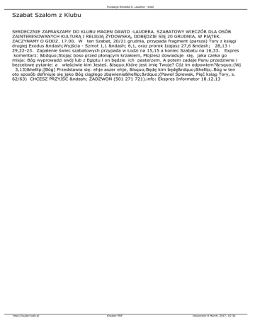Fundacja Ronalda S. Laudera - Łódź Szabat Szalom z Klubu SERDECZNIE ZAPRASZAMY DO KLUBU MAGEN DAWID -LAUDERA. SZABATOWY WIECZÓR DLA OSÓB ZAINTERESOWANYCH KULTURĄ I RELIGIĄ ŻYDOWSKĄ, ODBĘDZIE SIĘ 20 GRUDNIA, W PIĄTEK. ZACZYNAMY O GODZ. 17.00. W ten Szabat, 20/21 grudnia, przypada fragment (parsza) Tory z księgi drugiej Exodus –Wyjścia - Szmot 1,1 – 6,1, oraz prorok Izajasz 27,6 – 28,13 i 29,22-23. Zapalenie świec szabatowych przypada w Łodzi na 15,15 a koniec Szabatu na 16,33. Expres komentarz: „Stojąc boso przed płonącym krzakiem, Mojżesz dowiaduje się, jaka czeka go misja: Bóg wyprowadzi swój lub z Egiptu i on będzie ich pasterzem. A potem zadaje Panu przedziwne i bezcelowe pytanie: a właściwie kim Jesteś. ‘Które jest imię Twoje? Cóż im odpowiem?’(Wj 3,13)…[Bóg] Przedstawia się: ehje aszer ehje, ‘Będę kim będę”….Bóg w ten oto sposób definiuje się jako Bóg ciągłego zbawienia…”(Paweł Śpiewak, Pięć ksiąg Tory, s. 62/63) CHCESZ PRZYJŚĆ – ZADZWOŃ (501 271 721).info: Ekspres Informator 18.12.13 http://lauder.lodz.pl Kreator PDF Utworzono 8 March, 2017, 15:36