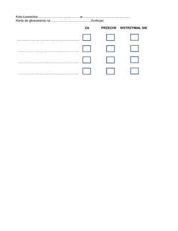 Koło Łowieckie ………………………………..w …………………………………… Karta do głosowania na ………………………………(funkcja) ZA ………………………………………………… ……………………………………………….. ………………………………………………. ………………………………………………. PRZECIW WSTRZYMAŁ SIE