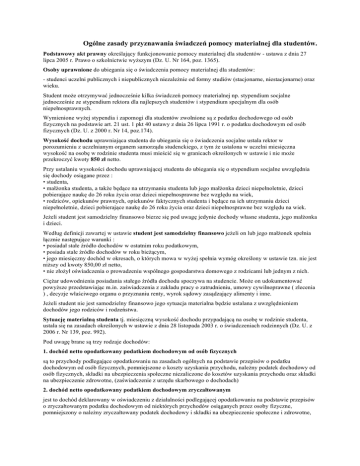 Ogólne zasady przyznawania świadczeń pomocy materialnej dla studentów. Podstawowy akt prawny określający funkcjonowanie pomocy materialnej dla studentów - ustawa z dnia 27 lipca 2005 r. Prawo o szkolnictwie wyższym (Dz. U. Nr 164, poz. 1365). Osoby uprawnione do ubiegania się o świadczenia pomocy materialnej dla studentów: - studenci uczelni publicznych i niepublicznych niezależnie od formy studiów (stacjonarne, niestacjonarne) oraz wieku. Student może otrzymywać jednocześnie kilka świadczeń pomocy materialnej np. stypendium socjalne jednocześnie ze stypendium rektora dla najlepszych studentów i stypendium specjalnym dla osób niepełnosprawnych. Wymienione wyżej stypendia i zapomogi dla studentów zwolnione są z podatku dochodowego od osób fizycznych na podstawie art. 21 ust. 1 pkt 40 ustawy z dnia 26 lipca 1991 r. o podatku dochodowym od osób fizycznych (Dz. U. z 2000 r. Nr 14, poz.174). Wysokość dochodu uprawniająca studenta do ubiegania się o świadczenia socjalne ustala rektor w porozumieniu z uczelnianym organem samorządu studenckiego, z tym że ustalona w uczelni miesięczna wysokość na osobę w rodzinie studenta musi mieścić się w granicach określonych w ustawie i nie może przekroczyć kwoty 850 zł netto. Przy ustalaniu wysokości dochodu uprawniającej studenta do ubiegania się o stypendium socjalne uwzględnia się dochody osiągane przez : • studenta, • małżonka studenta, a także będące na utrzymaniu studenta lub jego małżonka dzieci niepełnoletnie, dzieci pobierające naukę do 26 roku życia oraz dzieci niepełnosprawne bez względu na wiek, • rodziców, opiekunów prawnych, opiekunów faktycznych studenta i będące na ich utrzymaniu dzieci niepełnoletnie, dzieci pobierające naukę do 26 roku życia oraz dzieci niepełnosprawne bez względu na wiek. Jeżeli student jest samodzielny finansowo bierze się pod uwagę jedynie dochody własne studenta, jego małżonka i dzieci. Według definicji zawartej w ustawie student jest samodzielny finansowo jeżeli on lub jego małżonek spełnia łącznie następujące warunki : • posiadał stałe źródło dochodów w ostatnim roku podatkowym, • posiada stałe źródło dochodów w roku bieżącym, • jego miesięczny dochód w okresach, o których mowa w wyżej spełnia wymóg określony w ustawie tzn. nie jest niższy od kwoty 850,00 zł netto, • nie złożył oświadczenia o prowadzeniu wspólnego gospodarstwa domowego z rodzicami lub jednym z nich. Ciężar udowodnienia posiadania stałego źródła dochodu spoczywa na studencie. Może on udokumentować powyższe przedstawiając m.in. zaświadczenia z zakładu pracy o zatrudnieniu, umowy cywilnoprawne ( zlecenia ) , decyzje właściwego organu o przyznaniu renty, wyrok sądowy zasądzający alimenty i inne. Jeżeli student nie jest samodzielny finansowo jego sytuacja materialna będzie ustalana z uwzględnieniem dochodów jego rodziców i rodzeństwa. Sytuację materialną studenta tj. miesięczną wysokość dochodu przypadającą na osobę w rodzinie studenta, ustala się na zasadach określonych w ustawie z dnia 28 listopada 2003 r. o świadczeniach rodzinnych (Dz. U. z 2006 r. Nr 139, poz. 992). Pod uwagę brane są trzy rodzaje dochodów: 1. dochód netto opodatkowany podatkiem dochodowym od osób fizycznych są to przychody podlegające opodatkowaniu na zasadach ogólnych na podstawie przepisów o podatku dochodowym od osób fizycznych, pomniejszone o koszty uzyskania przychodu, należny podatek dochodowy od osób fizycznych, składki na ubezpieczenia społeczne niezaliczone do kosztów uzyskania przychodu oraz składki na ubezpieczenie zdrowotne, (zaświadczenie z urzędu skarbowego o dochodach) 2. dochód netto opodatkowany podatkiem dochodowym zryczałtowanym jest to dochód deklarowany w oświadczeniu z działalności podlegającej opodatkowaniu na podstawie przepisów o zryczałtowanym podatku dochodowym od niektórych przychodów osiąganych przez osoby fizyczne, pomniejszony o należny zryczałtowany podatek dochodowy i składki na ubezpieczenie społeczne i zdrowotne, (oświadczenie studenta i członków jego rodziny rozliczających się na podstawie przepisów o zryczałtowanym podatku dochodowym 3. dochody niepodlegające opodatkowaniu na podstawie przepisów o podatku dochodowym od osób fizycznych są to następujące dochody wymienione w katalogu zamkniętym (art. 3 pkt 1 lit. c ustawy z dnia 28 listopada 2003 r. o świadczeniach rodzinnych): - renty określone w przepisach o zaopatrzeniu inwalidów wojennych i wojskowych oraz ich rodzin, - renty wypłacone osobom represjonowanym i członkom ich rodzin, przyznane na zasadach określonych w przepisach o zaopatrzeniu inwalidów wojennych i wojskowych oraz ich rodzin, - świadczenia pieniężne oraz ryczałt energetyczny określone w przepisach o świadczeniu pieniężnym i uprawnieniach przysługujących żołnierzom zastępczej służby wojskowej przymusowo zatrudnianym w kopalniach węgla, kamieniołomach, zakładach rud uranu i batalionach budowlanych, - dodatek kombatancki, ryczałt energetyczny i dodatek kompensacyjny określone w przepisach o kombatantach oraz niektórych osobach będących ofiarami represji wojennych i okresu powojennego, - świadczenie pieniężne określone w przepisach o świadczeniu pieniężnym przysługującym osobom deportowanym do pracy przymusowej oraz osadzonym w obozach pracy przez III Rzeszę Niemiecką lub Związek Socjalistycznych Republik Radzieckich, - emerytury i renty otrzymywane przez osoby, które utraciły wzrok w wyniku działań w latach 1939-1945 lub eksplozji pozostałych po tej wojnie niewypałów i niewybuchów, - renty inwalidzkie z tytułu inwalidztwa wojennego, kwoty zaopatrzenia otrzymywane przez ofiary wojny oraz członków ich rodzin i renty wypadkowe osób, których inwalidztwo powstało w związku z przymusowym pobytem na robotach w III Rzeszy Niemieckiej w latach 1939-1945, otrzymywane z zagranic
