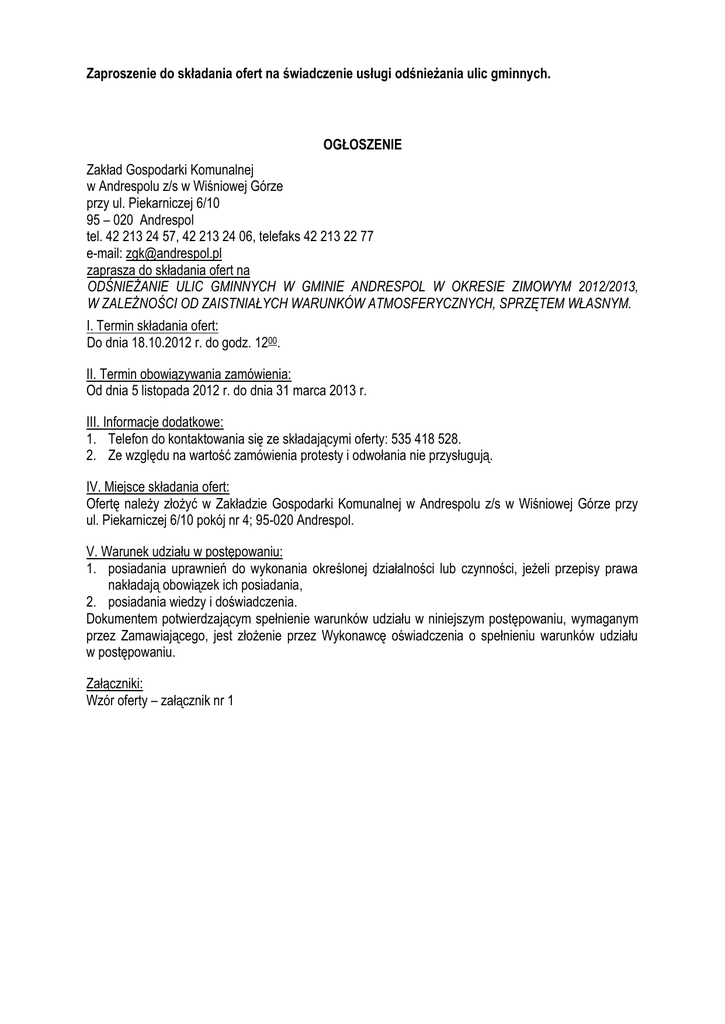 Zaproszenie do składania ofert na świadczenie usługi odśnieżania ulic gminnych. OGŁOSZENIE Zakład Gospodarki Komunalnej w Andrespolu z/s w Wiśniowej Górze przy ul. Piekarniczej 6/10 95 – 020 Andrespol tel. 42 213 24 57, 42 213 24 06, telefaks 42 213 22 77 e-mail: [email protected] zaprasza do składania ofert na ODŚNIEŻANIE ULIC GMINNYCH W GMINIE ANDRESPOL W OKRESIE ZIMOWYM 2012/2013, W ZALEŻNOŚCI OD ZAISTNIAŁYCH WARUNKÓW ATMOSFERYCZNYCH, SPRZĘTEM WŁASNYM. I. Termin składania ofert: Do dnia 18.10.2012 r. do godz. 1200. II. Termin obowiązywania zamówienia: Od dnia 5 listopada 2012 r. do dnia 31 marca 2013 r. III. Informacje dodatkowe: 1. Telefon do kontaktowania się ze składającymi oferty: 535 418 528. 2. Ze względu na wartość zamówienia protesty i odwołania nie przysługują. IV. Miejsce składania ofert: Ofertę należy złożyć w Zakładzie Gospodarki Komunalnej w Andrespolu z/s w Wiśniowej Górze przy ul. Piekarniczej 6/10 pokój nr 4; 95-020 Andrespol. V. Warunek udziału w postępowaniu: 1. posiadania uprawnień do wykonania określonej działalności lub czynności, jeżeli przepisy prawa nakładają obowiązek ich posiadania, 2. posiadania wiedzy i doświadczenia. Dokumentem potwierdzającym spełnienie warunków udziału w niniejszym postępowaniu, wymaganym przez Zamawiającego, jest złożenie przez Wykonawcę oświadczenia o spełnieniu warunków udziału w postępowaniu. Załączniki: Wzór oferty – załącznik nr 1 Załącznik nr 1 OFERTA na odśnieżanie ulic gminnych w gminie Andrespol w okresie zimowym 2012/2013, w zależności od zaistniałych warunków atmosferycznych, sprzętem własnym. 1. ZAMAWIAJĄCY: Zakład Gospodarki Komunalnej w Andrespolu z/s w Wiśniowej Górze przy ul. Piekarniczej 6/10 95 – 020 Andrespol tel. 42 213 24 57, 42 213 24 06, telefaks 42 213 22 77 e-mail: [email protected] 2. WYKONAWCA: Niniejsza oferta zostaje złożona przez: L. p. Nazwa Wykonawcy Rodzaj sprzętu odśnieżającego Nr NIP Nr REGON Adres Wykonawcy 1. 3. Ja niżej podpisany oświadczam, że: 1. Cena mojej oferty za realizację niniejszego zamówienia wynosi: Cena netto roboczogodziny …………………………..……. PLN (słownie: ………………….……... …………………………………………………………………………………….…………...……. PLN). stawka VAT ……………%, co stanowi kwotę ……………………………….………………….. PLN. Cena brutto roboczogodziny …………………….……. PLN (słownie: …………………..………….. ……………………………………………………………………………………….…………...…. PLN). 2. Czasu dojazdu od chwili otrzymania zlecenia od Zamawiającego: ....……………………………… ……………………………………………………………………………………………….……………… 3. Obliczona cena ryczałtowa obejmuje wszystkie czynności oraz zakres podany w ogłoszeniu, jest ceną kompletną, jednoznaczną i ostateczną. 4. Nr rachunku bankowego …………………………………………………………………….………..... 5. Potwierdzam termin związania ofertą: od dnia 05.11.2012 r. do dnia 31.03.2013 r. 6. W przypadku przyznania mnie zamówienia, zobowiązuję się zawrzeć umowę na warunkach i w terminie, określonym przez Zamawiającego. 7. Oświadczam, że zapoznałem się z opisem przedmiotu zamówienia, warunkami lokalnymi, w których realizowany będzie przedmiot zamówienia oraz, że nie wnoszę do niego zastrzeżeń. 4. Oświadczam, że: 1. Posiadam uprawnienia do wykonywania określonej działalności lub czynności, jeżeli przepisy prawa nakładają obowiązek ich posiadania. 2. Posiadam wiedzę i doświadczenie niezbędne do prawidłowego wykonania przedmiotu zamówienia. 3. Posiadam ubezpieczenie odpowiedzialności cywilnej od działalności. ………………………………………….. (podpis osoby upoważnionej)