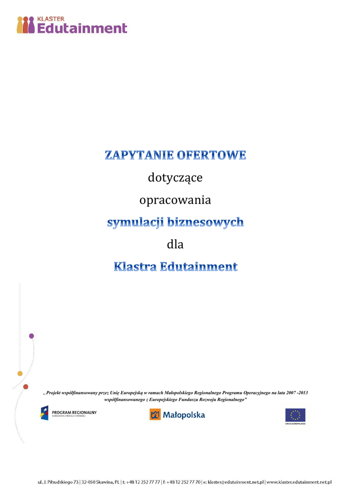Zapytanie ofertowe dotyczące opracowania dla „Projekt współfinansowany przez Unię Europejską w ramach Małopolskiego Regionalnego Programu Operacyjnego na lata 2007 -2013 współfinansowanego z Europejskiego Funduszu Rozwoju Regionalnego” 0 Zapytanie ofertowe 1 2 3 4 Informacje wstępne................................................................................................................................ 1 Przedmiot zapytania ofertowego - opis i specyfikacja ............................................................. 2 Zawartość i struktura oferty ............................................................................................................... 4 Termin składania ofert i osoby kontaktowe ................................................................................. 5 Lider Klastra Edutainment, firma M.M. Druk Serwis ogłasza konkurs na opracowanie symulacji biznesowych, które będą zakupione w ramach realizacji projektu, co w bezpośredni sposób przyczyni się do rozwoju Klastra, popularyzacji idei Edutainment oraz pozyskania doświadczeń do tworzenia innowacyjnego systemu nauczania dla małopolskich ośrodków akademickich. Każda gra będzie dotyczyła innej tematyki. Ponadto wspomniane symulację będą narzędziem do rozwijania produktów Klastra, które następnie będą oferowane na rynku. Szczegółowe wymagania dotyczące oferty są przedstawione w dalszej części tego dokumentu. 1.1 Dokument jest formalnym zapytaniem ofertowym wystosowanym przez Klaster Edutainment 1.2 Treść niniejszego dokumentu, wszelkie informacje, do których się odwołuje, oraz prowadzona korespondencja i rozmowy muszą zostać zachowane w tajemnicy. Oferent jest zobowiązany do nie udostępniania osobom trzecim informacji uzyskanych w związku z zapytaniem ofertowym bez pisemnej zgodny i upoważnienia ze strony Klastra Edutainment 1.3 Klaster Edutainment dokona analizy zgodności przedstawionej oferty z wymaganiami funkcjonalnymi określonymi w tym zapytaniu ofertowym. 1.4 Oferta powinna zawierać szczegółowe zestawienie wszystkich kosztów, które poniesie Klaster Edutainment w przypadku wyboru danej oferty. 1 Zapytanie ofertowe 1.5 Jeśli Oferent proponuje usługi strony trzeciej, musi jasno określić wiążące ich zależności lub umowy. 1.6 Klaster Edutainment zastrzega sobie prawo do odmowy wyboru oferty. Klaster Edutainment nie jest zobowiązany do powiadomienia Oferenta o odmowie wyboru jego oferty. 1.7 Klaster Edutainment może wedle własnego wyboru: przyjąć ofertę w całości lub też rozpocząć negocjacje. 1.8 Klaster Edutainment nie będzie pokrywał żadnych kosztów Oferentów, związanych z przygotowaniem odpowiedzi na niniejsze zapytanie ofertowe, prezentacji, odpowiedzi, spotkań czy negocjacji. Klaster Edutainment nie będzie pokrywał żadnych kosztów i szkód poniesionych przez Oferenta przed zawarciem umowy. 1.9 Niniejsze Zapytanie ofertowe nie jest elementem postępowania przetargowego, w rozumieniu art. 701 - 705 Kodeksu cywilnego, w szczególności nie jest ogłoszeniem aukcji lub przetargu Edutainment w biznesie jest jedną z najnowszych i najbardziej skutecznych metod przekazywania wiedzy. Edutainment stanowi unikalne połącznie edukacji i rozrywki w oparciu o ideę „uczyć bawiąc”. Uczestnicy szkoleń w bardzo efektywny sposób uczą się przez doświadczenie w symulowanym świecie biznesu, realistycznych sytuacji i problemów, przed jakimi stają na co dzień pracownicy różnych szczebli i obszarów przedsiębiorstwa. Przewidywane obszary tematyczne, które będą podejmowane w ramach nabywanych symulacji będą związane z kształtowaniem najlepszych praktyk biznesowych w takich obszarach jak: 1. Zarządzanie strategiczne, Podstawowym celem gry jest ma być dostarczenie uczestnikom doświadczenia procesu podejmowania decyzji, planowania i realizowania wybranej strategii biznesowej. Gra wskazywać ma na pewne podstawowe mechanizmy budowania przewagi konkurencyjnej oraz rywalizowania o skończoną liczbę konsumentów. 2 Zapytanie ofertowe 2. Zarządzanie sprzedażą i marketingiem, Podstawowym celem gry ma być przygotowanie kadry/ uczestników do pełnienia roli menadżerów sprzedaży, wyćwiczenie praktycznych metod i sposobów pracy w ramach zarządzania zespołem handlowców i realizacji celów sprzedaży. Z myślą o przyszłości przedsiębiorstwa, uczestnicy mają także nauczyć się podejmować takie decyzje i działania marketingowe, które zapewnią sukces i dalszy rozwój na rynku. 3. Zarządzanie produkcją, Podstawowym celem gry ma być pokazanie praktycznych aspektów planowania i zarządzania produkcją ze szczególnym uwzględnieniem budowy systemu oceny i kontroli w tych obszarach (zarówno w zakresie kosztów jak i poziomu obsługi klienta). 4. Lean Management, czyli "szczupłe zarządzanie", Podstawowym celem gry ma być przekazanie uczestnikom założeń filozofii Lean Management i zasad stosowania poszczególnych narzędzi i technik w praktyce. 5. Zarządzanie zasobami ludzkimi, Podstawowym celem gry ma być przekazanie uczestnikom wiedzy, niezbędnej do prawidłowego zarządzania zasobami ludzkimi w organizacji, rozumienia ich roli, doskonalenia umiejętności w zakresie zbioru najlepszych praktyk oraz budowania i rozwijania odpowiednich relacji. 6. Zarządzanie projektem, Podstawowym celem gry ma być nabycie przez uczestników umiejętności w zarządzaniu projektem, czyli planowanie, harmonogramowanie i utrzymywanie postępów w czynnościach składających się na cały projekt. 7. Kierowanie zespołem, Podstawowym celem gry ma być umożliwienie uczestnikom wypracowania własnego stylu kierowania zespołem. Pokazać, jak mówić do pracowników, by zrozumieli dokładnie to, co chcemy im przekazać i jak skutecznie motywować do pracy. 3 Zapytanie ofertowe Uczestnikami gier symulacyjnych będą pracownicy przedsiębiorstw z różnych branż zarówno z sektora MŚP, jak również duże firmy