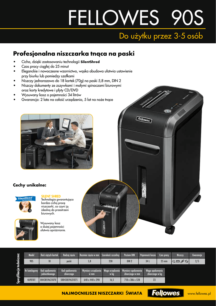 FELLOWES 90S Do użytku przez 3-5 osób Profesjonalna niszczarka tnąca na paski • • • • • • • Cicha, dzięki zastosowaniu technologii SilentShred Czas pracy ciągłej do 25 minut Eleganckie i nowoczesne wzornictwo, wąska obudowa ułatwia ustawienie przy biurku lub pomiedzy szafkami Niszczy jednorazowo do 18 kartek (70g) na paski 5,8 mm, DIN 2 Niszczy dokumenty ze zszywkami i małymi spinaczami biurowymi oraz karty kredytowe i płyty CD/DVD Wysuwany kosz o pojemności 34 litrów Gwarancja: 2 lata na całość urządzenia, 5 lat na noże tnące Cechy unikalne: silent shred Technologia gwarantująca bardzo cichą pracę niszczarki, co czyni ją idealną do przestrzeni biurowych. Specyfikacja techniczna: Wysuwany kosz o dużej pojemności ułatwia opróżnianie. Model Ilość ciętych kartek Rodzaj cięcia 90S 18 paski Nr katalogowy Kod opakowania jednostkowego 4690101 0043859631070 Kod opakowania zbiorczego 50043859631075 Rozmiar cięcia w mm Szerokość szczeliny 5,8 230 Poziom DIN Pojemność kosza Czas pracy DIN 2 34 L 25 min Wymiary urządzenia Waga urządzenia Wymiary opakowania w mm w kg zbiorczego w mm 640 x 440 x 290 16,5 718 x 386 x 528 NAJMOCNIEJSZE NISZCZARKI ŚWIATA Niszczy Gwarancja 2/5 Waga opakowania zbiorczego w kg 23 www.fellowes.pl