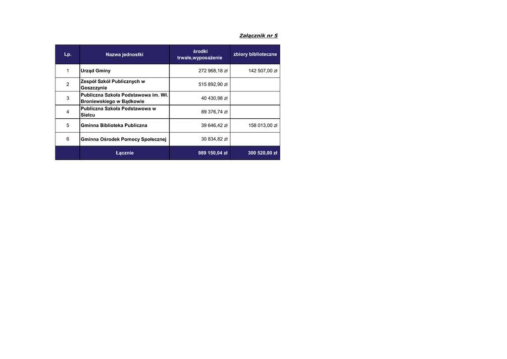 Załącznik nr 5 Lp. Nazwa jednostki środki trwałe,wyposażenie 1 Urząd Gminy 272 968,18 zł 2 Zespół Szkół Publicznych w Goszczynie 515 892,90 zł 3 Publiczna Szkoła Podstawowa im. Wł. Broniewskiego w Bądkowie 40 430,98 zł 4 Publiczna Szkoła Podstawowa w Sielcu 89 376,74 zł 5 Gminna Biblioteka Publiczna 39 646,42 zł 6 Gminna Ośrodek Pomocy Społecznej 30 834,82 zł Łącznie 989 150,04 zł zbiory biblioteczne 142 507,00 zł 158 013,00 zł 300 520,00 zł
