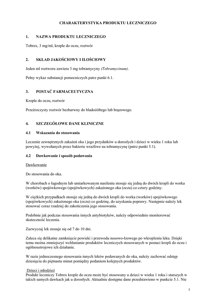 CHARAKTERYSTYKA PRODUKTU LECZNICZEGO 1. NAZWA PRODUKTU LECZNICZEGO Tobrex, 3 mg/ml, krople do oczu, roztwór 2. SKŁAD JAKOŚCIOWY I ILOŚCIOWY Jeden ml roztworu zawiera 3 mg tobramycyny (Tobramycinum). Pełny wykaz substancji pomocniczych patrz punkt 6.1. 3. POSTAĆ FARMACEUTYCZNA Krople do oczu, roztwór Przeźroczysty roztwór bezbarwny do bladożółtego lub brązowego. 4. SZCZEGÓŁOWE DANE KLINICZNE 4.1 Wskazania do stosowania Leczenie zewnętrznych zakażeń oka i jego przydatków u dorosłych i dzieci w wieku 1 roku lub powyżej, wywołanych przez bakterie wrażliwe na tobramycynę (patrz punkt 5.1). 4.2 Dawkowanie i sposób podawania Dawkowanie Do stosowania do oka. W chorobach o łagodnym lub umiarkowanym nasileniu stosuje się jedną do dwóch kropli do worka (worków) spojówkowego (spojówkowych) zakażonego oka (oczu) co cztery godziny. W ciężkich przypadkach stosuje się jedną do dwóch kropli do worka (worków) spojówkowego (spojówkowych) zakażonego oka (oczu) co godzinę, do uzyskania poprawy. Następnie należy lek stosować coraz rzadziej do zakończenia jego stosowania. Podobnie jak podczas stosowania innych antybiotyków, należy odpowiednio monitorować skuteczność leczenia. Zazwyczaj lek stosuje się od 7 do 10 dni. Zaleca się delikatne zamknięcie powieki i przewodu nosowo-łzowego po wkropleniu leku. Dzięki temu można zmniejszyć wchłanianie produktów leczniczych stosowanych w postaci kropli do oczu i ogólnoustrojowe ich działanie. W razie jednoczesnego stosowania innych leków podawanych do oka, należy zachować odstęp dziesięciu do piętnastu minut pomiędzy podaniem kolejnych produktów. Dzieci i młodzież Produkt leczniczy Tobrex krople do oczu może być stosowany u dzieci w wieku 1 roku i starszych w takich samych dawkach jak u dorosłych. Aktualnie dostępne dane przedstawiono w punkcie 5.1. Nie 1 określono bezpieczeństwa i skuteczności stosowania produktu u dzieci poniżej 1 roku i nie są dostępne żadne dane na temat takiego stosowania produktu. Stosowanie u pacjentów z zaburzeniami czynności wątroby lub nerek Nie badano działania leku Tobrex w tych populacjach pacjentów. Niemniej, z uwagi na małe wchłanianie ogólne substancji czynnej po miejscowym podaniu leku, nie jest konieczna zmiana dawkowania. Sposób podawania Aby zapobiec zakażeniu końcówki kroplomierza i roztworu, należy zachować ostrożność i nie dotykać końcówką kroplomierza powiek, otaczających tkanek ani żadnych powierzchni. 4.3 Przeciwwskazania Nadwrażliwość na tobramycynę lub którykolwiek składnik leku. 4.4 Specjalne ostrzeżenia i środki ostrożności dotyczące stosowania U niektórych pacjentów może wystąpić nadwrażliwość na aminoglikozydy stosowane miejscowo. Występuje wówczas świąd powiek, obrzęk, zaczerwienienie spojówki. W razie wystąpienia nadwrażliwości należy przerwać stosowanie produktu. Podobnie jak przy stosowaniu wszelkich antybiotyków, długotrwałe stosowanie może powodować namnażanie się drobnoustrojów opornych, w tym grzybów. W razie wystąpienia nadkażenia należy zastosować odpowiednie leczenie. Produkt Tobrex w postaci kropli do oczu (roztwór) zawiera chlorek benzalkoniowy, który może powodować podrażnienie i zmianę koloru soczewek kontaktowych. Dlatego należy wyjąć soczewki kontaktowe z oka przed zakropleniem produktu. Można je ponownie założyć po upływie 15 minut od zakroplenia. Należy zwrócić uwagę pacjentom, że nie wolno stosować soczewek kontaktowych, jeśli występują zakażenia oka. 4.5 Interakcje z innymi produktami leczniczymi i inne rodzaje interakcji Nie przeprowadzono szczególnych badań dotyczących interakcji produktu Tobrex z innymi lekami. Opisywano interakcje po podaniu ogólnym tobramycyny. Niemniej, wchłanianie tobramycyny do krążenia ogólnego po podaniu leku do oka jest tak małe, że ryzyko interakcji jest minimalne. 4.6 Wpływ na płodność, ciążę i laktację Nie określono bezpieczeństwa stosowania produktu u kobiet w ciąży i u kobiet karmiących piersią. Ciąża Nie przeprowadzono odpowiednich badań z grupą kontrolną dotyczących stosowania produktu Tobrex u kobiet w ciąży. Badania, w których aminoglikozydy (w tym tobramycynę) podawano doustnie lub pozajelitowo kobietom w ciąży, nie wykazały ryzyka dla płodu. Niemniej jednak, aminoglikozydy przechodzą przez łożysko. Podczas podawania aminoglikozydów w okresie ciąży należy brać pod uwagę ich wpływ na płód lub noworodka. Wprawdzie brak dowodów na działanie teratogenne, ototoksyczne lub nefrotoksyczne na płód, należy jednak przypuszczać, że działanie takie może występować. Patrz punkt 5.3., gdzie opisano badania na ciężarnych samicach zwierząt. Produkt Tobrex wolno stosować w okresie ciąży jedynie wówczas, gdy potencjalne korzyści uzasadniają ewentualne ryzyko dla płodu. Karmienie piersią 2 Przy stosowaniu ogólnym tobramycyna przenika do mleka kobiecego w takich ilościach, że mogłoby to mieć niekorzystny wpływ na niemowlę. Po podaniu miejscowym ekspozycja układowa jest mała. Na tej podstawie uważa się, że ryzyko dla niemowlęcia jest małe w przypadku stosowania leku Tobrex. Należy je jednak uwzględniać podczas przepisywania produktu kobietom karmiącym piersią. Ponieważ wiele leków jest wydalanych z mlekiem kobiecym, należy rozważyć okresowe przerwanie karmienia piersią w okresie stosowania produktu Tobrex. 4.7 Wpływ na zdolność prowadzenia pojazdów i obsługiwania maszyn Podobnie jak inne leki w postaci kropli do oczu, produkt może powodować przemijające zamazane widzenie lub inne zaburzenia wzroku, które mogą upośledzać zdolność prowadzenia pojazdów mechanicznych i obsługiwania urządzeń mechanicznych w ruchu. Gdyby po zakropleniu leku wystąpiło zamazane widzenie, pacjent nie powinien prowadzić pojazdów mechanicznych ani obsługiwać niebezpiecznych urządzeń do czasu, aż będzie widział wyraźni