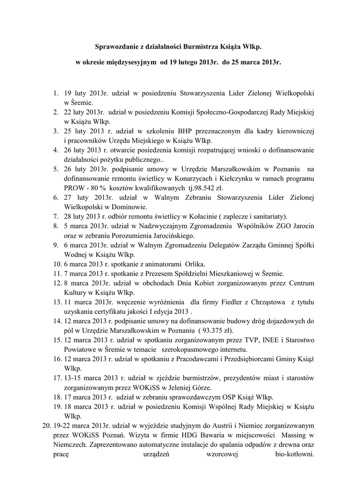 Sprawozdanie z działalności Burmistrza Książa Wlkp. w okresie międzysesyjnym od 19 lutego 2013r. do 25 marca 2013r. 1. 19 luty 2013r. udział w posiedzeniu Stowarzyszenia Lider Zielonej Wielkopolski w Śremie. 2. 22 luty 2013r. udział w posiedzeniu Komisji Społeczno-Gospodarczej Rady Miejskiej w Książu Wlkp. 3. 25 luty 2013 r. udział w szkoleniu BHP przeznaczonym dla kadry kierowniczej i pracowników Urzędu Miejskiego w Książu Wlkp. 4. 26 luty 2013 r. otwarcie posiedzenia komisji rozpatrującej wnioski o dofinansowanie działalności pożytku publicznego.. 5. 26 luty 2013r. podpisanie umowy w Urzędzie Marszałkowskim w Poznaniu na dofinansowanie remontu świetlicy w Konarzycach i Kiełczynku w ramach programu PROW - 80 % kosztów kwalifikowanych tj.98.542 zł. 6. 27 luty 2013r. udział w Walnym Zebraniu Stowarzyszenia Lider Zielonej Wielkopolski w Dominowie. 7. 28 luty 2013 r. odbiór remontu świetlicy w Kołacinie ( zaplecze i sanitariaty). 8. 5 marca 2013r. udział w Nadzwyczajnym Zgromadzeniu Wspólników ZGO Jarocin oraz w zebraniu Porozumienia Jarocińskiego. 9. 6 marca 2013r. udział w Walnym Zgromadzeniu Delegatów Zarządu Gminnej Spółki Wodnej w Książu Wlkp. 10. 6 marca 2013 r. spotkanie z animatorami Orlika. 11. 7 marca 2013 r. spotkanie z Prezesem Spółdzielni Mieszkaniowej w Śremie. 12. 8 marca 2013r. udział w obchodach Dnia Kobiet zorganizowanym przez Centrum Kultury w Książu Wlkp. 13. 11 marca 2013r. wręczenie wyróżnienia dla firmy Fiedler z Chrząstowa z tytułu uzyskania certyfikatu jakości I edycja 2013 . 14. 12 marca 2013 r. podpisanie umowy na dofinansowanie budowy dróg dojazdowych do pól w Urzędzie Marszałkowskim w Poznaniu ( 93.375 zł). 15. 12 marca 2013 r. udział w spotkaniu zorganizowanym przez TVP, INEE i Starostwo Powiatowe w Śremie w temacie szerokopasmowego internetu. 16. 12 marca 2013 r. udział w spotkaniu z Pracodawcami i Przedsiębiorcami Gminy Książ Wlkp. 17. 13-15 marca 2013 r. udział w zjeździe burmistrzów, prezydentów miast i starostów zorganizowanym przez WOKiSS w Jeleniej Górze. 18. 17 marca 2013 r. udział w zebraniu sprawozdawczym OSP Książ Wlkp. 19. 18 marca 2013 r. udział w posiedzeniu Komisji Wspólnej Rady Miejskiej w Książu Wlkp. 20. 19-22 marca 2013r. udział w wyjeździe studyjnym do Austrii i Niemiec zorganizowanym przez WOKiSS Poznań. Wizyta w firmie HDG Bawaria w miejscowości Massing w Niemczech. Zaprezentowano automatyczne instalacje do spalania odpadów z drewna oraz pracę urządzeń wzorcowej bio-kotłowni. Również w Niemczech w miejscowości Egenfelden firma HAWI zaprezentowała nowoczesne systemy fotowoltaiczne i sposoby wykorzystania wyprodukowanej przez nie energii elektrycznej. Natomiast w Austrii w miejscowości Wippenham firma Laryhof GmbH prezentowała obiekty gospodarstwa agroturystycznego dla 600 osób opalane wyłącznie biomasą uzyskiwaną z własnych pól uprawnych – uprawa topoli białej. Zarządzenia podjęte w tym okresie : 1. Zarządzenie nr 10/2013 Burmistrza Książa Wlkp. z dnia 18 lutego 2013r. w sprawie planu finansowego dochodów i wydatków jednostki Urzędu Miejskiego w Książu Wlkp. na rok 2013 r. 2. Zarządzenie nr 11/2013 Burmistrza Książa Wlkp. z dnia 18 lutego 2013r. w sprawie informacji o ostatecznych kwotach dochodów i wydatków oraz wysokości dotacji gminnych jednostek organizacyjnych na rok 2013. 3. Zarządzenie nr 12/2013 Burmistrza Książa Wlkp. z dnia 18 lutego2013r. w sprawie informacji o ostatecznych kwotach dochodów i wydatków na rok 2013. 4. Zarządzenie nr 13/2013 Burmistrza Książa Wlkp. z dnia 18 lutego 2013r. w sprawie informacji o ostatecznych kwotach dochodów i wydatków na rok 2013. 5. Zarządzenie nr 14/2013 Burmistrza Książa Wlkp. z dnia 20 lutego 2013r. w sprawie Regulaminu gospodarowania Środkami Zakładowego Funduszu Świadczeń Socjalnych oraz powołania Komisji Socjalnej Urzędu Miejskiego w Książu Wlkp. 6. Zarządzenie nr 15/2013 Burmistrza Książa Wlkp. z dnia 28 lutego 2013r. w sprawie zwrotu pracownikom Urzędu Miejskiego w Książu Wlkp. należności z tytułu krajowej podróży służbowej. 7. Zarządzenie nr 16/2013 Burmistrza Książa Wlkp. z dnia 28 lutego 2013 r. w sprawie zmian w budżecie gminy Książ Wlkp. na rok 2013. 8. Zarządzenie nr 17/2013 Burmistrza Książa Wlkp. z dnia 28 lutego 2013r. w sprawie planu finansowego dochodów i wydatków jednostki Urzędu Miejskiego w Książu Wlkp. na rok 2013. 9. Zarządzenie nr 18/2013 Burmistrza Książa Wlkp. z dnia 01 marca 2013 r. w sprawie wprowadzenia procedury opracowywania, publikacji i nadzorowania aktualności Kart Usług Publicznych w Urzędzie Miejskim w Książu Wlkp. 10. Zarządzenie nr 19/2013 Burmistrza Książa Wlkp. z dnia 07 marca 2013 roku w sprawie zmiany Zarządzenia Burmistrza Książa Wlkp. nr 49/2012 z dnia 23 maja 2012 roku w sprawie zatwierdzenia arkusza organizacyjnego Gimnazjum im. Dr. M. Krybusa w Książu Wlkp. na rok szkolny 2012/2013. 11. Zarządzenie nr 20/2013 Burmistrza Książa Wlkp. z dnia 18 marca 2013 r. w sprawie przedstawienia sprawozdania z wykonania budżetu gminy Książ Wlkp. za rok 2012. Burmistrz /-/ Teofil Marciniak