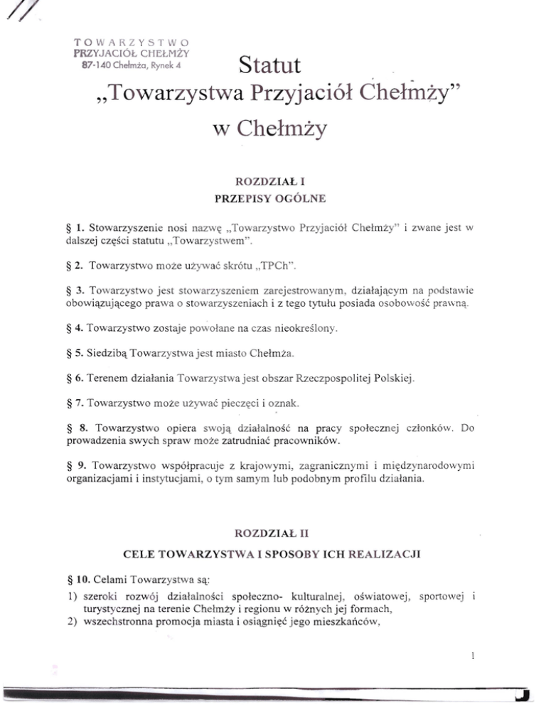 // TO W A R ZY 5 T W O PRZYJACIOl CHEl MzY Statut "Towarzys twa Przyjaciol Chelmzy" 87-140Chelmzc, Rynek 4 w Chelmzy ROZ DZ IAL I PRZE PI SY OGOLNE § 1. Stowarzyszenie nosi nazwe .Towarzystwo Przyjaciol Chelmzy" i zw ane jest w dalszej czesci statutu .Towarzystwem''. § 2. Towarzystwo m oz e uzyw ac skr6tu "TPCh" . § 3. Towa rzystw o jest stowarzysz eniem zarejestrowanym, dz ialaj acym na podstawie obowiazujacego prawa 0 stowarzyszeniach i z tego tytulu posiada osobow osc prawna. § 4. Towarzystwo zostaje powolane na czas nieokreslony, § 5. Siedziba Towarzystwa j est miasto Chelmz a. § 6. Terenem dzialania Tow arzystw a jest obszar Rze czp ospolitej Po lski ej. § 7. Towa rzystwo mo ze uzywac pieczeci i oz nak. § 8. Towarzystwo opiera swoja dziala lnosc na pr acy spolecznej czlonko w. Do prowadzenia swych spraw rnoze zatrudniac pracownik6w. § 9. Towarzystw o wsp6lpracuj e z krajow ymi , zagraniczn ym i i mied zyna rodow ymi organizacjami i instytucj am i, 0 tym sam ym Iub podobn ym profilu dz ialania. ROZDZIAL II CELE T OWARZ YSTWA I SPOSOBY ICH REALIZACJ I § 10. Celami Towarzystw a sa : 1) szeroki rozw6j dz ialalnosci spoleczno- kultu ralnej , oswiatowej, sportowej turystycznej na terenie Chelmzy i regionu w roznyc h jej formach, 2) wszechstronna promocja miasta i osiagniec j ego mieszkancow, 3) aktywizacja mieszkancow do wspoldzialani a na rzecz wszechstronnego rozwoju miasta, 4) upowszechnianie dzialan na rzecz roznorodnego rozwoj u . edukacj i oraz zagospodarowania czasu w olnego dzieci i mlodziezy, 5) kUI~owanie historii, tradycj i i ku ltury ze sz czeg6lnym u wzgl~dnieniem, miasta i regionu. § 11. Towarzystw o rea lizuje swoj e cele poprzez : 1) organizowanie spotkan populam o-nau kowych, sy mp ozj 6w, odczyt6w, wy kladow, wystaw, prelekcj i, projekcj i filmowych, seminari6w , a takze konkurs6w zwiazanych z potrzebami mieszkancow oraz prow adzenie prac badawczo rozwoj owych w dziedzinie kul turoznawstwa, 2) organizowanie lub wspolorganizowanie festiwali, festy n6w, koncertow, turn iej ow, imprez sportowo - rekreacyj nych, przegladow or az przygo towyw anie przedstaw ien teatralnych, 3) sprawowanie ob ywatelski ej pieczy nad trwalyrni zabytkam i i pomnikami kultury; upowszechnianie i po glebianie wiedzy 0 miescie , 0 j ego miej scu w dziejach narodu i panstwa oraz w rozw oj u spoleczno- eko nomi czny m kraju , 4) prowadzenie dz iala lnosci wydawniczo-p ubli cystycznej i pr omocyj nej , 5) wspolpraca i wspieran ie instytucj i i organizacj i real izuj acych ce le zbi ezne z celami Tow arzystwa, 6) podejmowanie innych dz ialan slu zacych realizacj i ce16w T owarzy stw a. ROZD ZIAL III CZLONKOWIE TOWARZYSTWA ORAZ ICH PRA W A I OB OWI1\ZKI § 12. Czlonkowie Towarzystw a dziela sie na: 1) czlonkow zwyczajnyc h, 2) czlonkow wspierajacych, 3) czlonkow honorowych. § 13. 1. Czlonkami Towarzystwa me ga, z zastrzezeniern ust.2 , bye osoby fizyczne i prawne . Osoba prawna dz iala w T owa rzystw ie przez sw oje go prze dstaw iciela. 2. Osoba prawna moze bye jedynie czl onkiem wspieraj acyrn T owarzystw a, 2 § 14. l . Prz yjecia nowych cz lonk ow dok onuj e Zarzad uchwala podjeta w ciagu dwoch miesiecy od dat y zlozenia dek laracj i zawierajacej rekornendacje dw6ch czlonk6w zwyczajnych. 2. W razie odmowy przyje cia w poczet czlonkow , zainteresowany rna prawo w terminie jednego miesiaca od daty jej doreczenia zlozyc na rece Zarzadu odwolanie do Walnego Zebrania. 3. Walne Zebranie rozpatruj e odwolanie w czasie naj blizszych obr ad. Stanowisko Walnego Zebrania jest ostateczne. § 15. 1. Czlonek zwyczaj ny rna prawo: 1) wybierac i bye wyb ieranym do wlad z Towarzystw a, 2) uczestniczyc z glos ern stanowiacyrn w Walnym Ze braniu, 3) zglaszac wniosk i i postulaty dotycz ace dz ialalnosci Tow arzystwa, 4) korzystac z po mocy i zaplecza Towarzy stw a w podej mo wanych dzialaniach zgodnych z j ego celam i, 5) brae udzial w praca ch, zeb raniach prawem glosu. innych przeds iew zieciach Towarzystwa ~~ 2. Czlonek zw yczaj ny zobow iazany j est do: 1) przestrzegania statutu, regu lamin6w i uchwal wladz Tow arzystwa , 2) regulamego oplacania skladek na rzecz Towarzystw a, 3) czynnego uc zes tniczen ia w realizacj i cel6w statutowych Towarzystw a, 4) dban ia 0 mien ie Towarzys twa. § 16. 1. Czlonkiem wspieraj acyrn Towarzy stwa moze zostac osoba fizy czn a Ju t prawna, uznajaca ce le Towarzystw a, kt6ra chce wspornagac jego dzi alalnosc statutowa, 2. Przyjecia na cz lonka w spierajacego dokonuj e Zarzad T owarzystwa na podstawie podpisanej deklaracj i. 3. Czlonek wspieraj acy rna prawo z glosem doradczym brae udzial osob iscie lub za posrednictwern swojego przedst awiciela , w prac ach Towarzystw a , zglas zac do wl adz Towarzystwa wnioski i postulaty dotyczace podej mowanych przez Towarzystw o zadan. 4. Czlonek wspierajacy j est zobowiazany do regulam ego wywiazywania sie z deklarowanych swiadczen i przestrzegania ustalen zaw artych w podpisanej deklaracj i. § 17. 1. Czlonkiem honorowym Towarzystwa moze zostac osoba fizyczna szczeg61nie zasluzona dla roz w oj u miasta Chelmza i region u. 3 2. Godnosc Towarzystwa. czlonka honorowego nadaje Waln e Zebrani e na wnio sek Zarzadu 3. Czlonek honorowy rna w szystkie prawa czlonka zw yczajnego T ow arzystw a. 4. Czlonek honorowy rna obow iazek przestrzega ni a Statutu i uchwal wladz Towarzystwa. § 18. 1. Czlonkostwo w T ow arzystwie ustaje na skut ek: 1) dob row olnej rezygnacj i z przynaleznosci do T owarzystw a, zgloszonej na pism Ie Zarzadowi, po up rzednirn uregulowaniu w szelk ich zo bo wi azan wobec T owarzystwa, 2) smierci czlonka lub ut raty os obowosc i prawnej przez czl onka wsp ieraj acego, 3) uchwaly Zarzadu z p ow odu nieplacen ia skladek czlonkows kich przez okres 1 roku lub nieusprawiedliw ionego nieuczestnicz enia w Walnyrn Zebra niu przez okr es kolejnych 3 lat, 4) wy kluczenia uchwala Z arzadu z powodu niep rzestrzegania postanow ien statutu, reg ulamin6w i uchw al w ladz T owarzystw a oraz dzialania na szkod e Towarzystw a. 2. Osoba wy