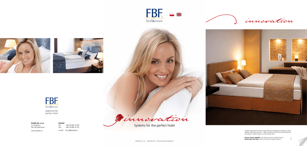 innovation Systems for the perfect hotel Estella Sp. z o.o. ul. Krzywa 3 59-100 Polkowice Poland: Tel.: +48 76 845 37 80 Fax.: +48 76 845 37 81 www.estella.eu e-mail:[email protected] Systems for the perfect hotel Uwaga! Przedstawione kolory mogą nieznacznie odbiegać od oryginału - proszę zapytać o darmowe zworniki! / Note: The colours shown here may deviate from the original – please request our free sample cards. Proszę otwórz zakładkę, aby zobaczyć szeroki wachlarz tkanin! Please open this flap to view our exclusive range of fabrics! Estella Sp. z o.o. · Tylko dla firm · Only for business demand >> >> Tkanina obiciowa Alassio – zmywalny, odporny na rozdarcia welur Cover fabric Alassio – washable, tear-resistant velour Tkanina obiciowa Cayenne – wysokiej jakości Chenille Cover fabric Cayenne – high quality chenille Alassio 023/Naturalny Alassio 020/Beżowy Cayenne 104/Krem Alassio 045/Morelowy Alassio 035/Koniak Cayenne 037/Cappuccino Cayenne 024/Terra Alassio 524/Cynamonowy Alassio 042/BuraczkowyAlassio 115/Morski Alassio 058/Jodłowy Cayenne 060/Niebieski Cayenne 137/Żwirowy Cayenne 070/Złoty Alassio 081/Szary Alassio 008/Szaroniebieski Cayenne 011/Kość słoniowa Alassio 130/CzekoladowyAlassio 090/Czarny Tkanina obiciowa Inka – ciekawe wzornictwo Cover fabric Inka – fine repp-like appearance Inka 070/Złoty Inka 060/Niebieski Inka 081/Szary Inka 030/Kawowy Inka 104/Krem Inka 130/Czekoladowy Inka 090/Czarny Texas 104/Krem Texas 035/Koniak Texas 058/Jodłowy Texas 130/CzekoladowyTexas 090/Czarny Cayenne 042/BuraczkowyCayenne 045/Morelowy Cayenne 090/Czarny an excellent choice Nasze referencje California 104/Krem California 570/Lniany California 075/Piaskowy California 045/Morelowy California 024/Terra California 069/Fuksja California 060/Niebieski California 053/Zielony California 020/Beżowy California 534/Kakaowy California 130/ Czekoladowy Miro 104/Krem Texas 065/Kobalt Texas 105/Makowy Miro 035/Koniak Our references The cover fabrics shown are only a selection from our range of fabrics. Naturally, we are more than happy to process customer-supplied fabrics also. Kempinski Hotel Vier Jahreszeiten, Munich California 090/Czarny Możesz połączyć nasze nowe wysokiej jakości tkaniny - odpowiednie na narzuty, pledy i wezgłowia - z tkaninami pościelowymi. (Ceny, jak również inne możliwości połączenia dostępne są na zapytanie). Miro 011/Kość słoniowa Miro 020/Beżowy Miro 093/Ceglany Jesteśmy bardzo szczęśliwi, że lista naszych klientów liczy już ponad 15.000 pozycji. Do kręgu naszych klientów zaliczają się zarówno małe, ekskluzywne hotele, architekci, podmioty wyposażenia wnętrz, zrzeszenia kupieckie i pralnie, jak i znane sieci hoteli, jak np.: Wymienione tkaniny obiciowe są tylko częścią naszej pełnej oferty tkanin. Oczywiście będziemy także zadowoleni z możliwości wykorzystania tkanin dostarczonych przez Państwa. Tkanina obiciowa Miro – ognioodporny Cover fabric Miro – flame-resistant Tkanina obiciowa Texas – wytrzymała, syntetyczna skóra Cover fabric Texas – hard wearing, synthetic leather cover fabric Texas 031/Brązowy Cayenne 130/Czekoladowy Tkanina obiciowa California – ognioodporny Cover fabric California – flame-resistant Inka 519/Pomarańczowy Inka 524/Cynamonowy Inka 037/Cappuccino Inka 042/Buraczkowy Inka 098/Riviera Cayenne 020/Beżowy Miro 045/Morelowy Miro 115/Morski Miro 058/Jodłowy Dallas 023/Naturalny Dallas 079/Liliowy You can combine our new, high quality fabrics – suitable for bedspreads, bed plaids and backboards – with our cover fabrics (Prices as well as other combination possibilities are available on request). Dorint Resort, Binz Qubus Hotel, Bielsko Biała Holiday Inn Munich City Centre, Munich KAMEHA GRAND, Bonn NOWOŚĆ! Tkanina obiciowa Dallas – struktura lnu NEW! Cover fabric Dallas – linen-like appearance Texas 076/Wanilia Texas 037/Cappuccino Texas 010/Biały Texas 042/Buraczkowy Dallas 005/Turkusowy Dallas 021/Perłowy NOWOŚĆ! Tkanina obiciowa Viola NEW! Cover fabric Viola NEU! Tkanina obiciowa Corvo NEW! Cover fabric Corvo Tkanina obiciowa Alba – nowoczesna struktura lnu Cover fabric Alba – modern linen-like structure Dallas 090/Czarny Alba 092/Antracyt Alba 070/Złoty Alba 067/Oberżyna Alba 005/Turkusowy Alba 069/Fuksja Alba 060/Niebieski Alba 035/Koniak Dallas 092/Antracyt Dallas 130/CzekoladowyDallas 139/Ciemnoszary Corvo 011/Kość słoniowa Corvo 104/Krem Corvo 037/Cappuccino Corvo 070/Złoty Corvo 045/Morelowy Corvo 105/Makowy Corvo 067/Oberżyna Tkanina obiciowa Stage – wygląd centkowanego kordonku Cover fabric Stage – mottled chenille-like appearance Alba 084/Grafit Stage 010/Biały Stage 104/Krem Alba 011/Kość słoniowa Stage 130/Czekoladowy Stage 069/Fuksja Corvo 016/Jasnoniebieski Stage 037/Cappuccino Stage 090/Czarny Hotel Bukovina, Bukowina Tatrzańska Alba 130/CzekoladowyAlba 139/Ciemnoszary Alba 023/Naturalny Tkanina obiciowa Accent – ognioodporny Cover fabric Accent – flame-resistant Stage 035/Koniak Stage 058/Jodłowy Viola 142/Oberżyna-Lila Viola 143/Woda-Mandaryna Tkanina obiciowa Lugano, Cover fabric Lugano Tkanina obiciowa El Paso – nowoczesna, wysokiej jakości mikrofaza Cover fabric El Paso – modern, top-quality micro velour Lugano 104/Krem Accent 019/Brzoskwiniowy Accent 519/Pomarańczowy Accent 024/Terra Accent 524/Cynamonowy El Paso 020/Beżowy El Paso 031/Brązowy El Paso 104/Krem Lugano 037/Cappuccino Lugano 045/Morelowy Lugano 060/Niebieski El Paso 042/Buraczkowy Steigenberger Hotel Metropolitan, Frankfurt Accent 034/Nugatowy Accent 534/Kakaowy Accent 070/Złoty Accent 570/Lniany El Paso 126/Jabłkowy El Paso 115/Morski El Paso 130/Czekoladowy El Paso 534/Kakaowy Accent 065/Kobalt Accent 582/Srebrno-szary El Paso 045/Morelowy El Paso 058/Jodłowy El Paso 081/Szary U3 Accent 565/Delft Accent 082/Srebrny El Paso 092/Antracyt Viola 144/Srebrny-Brązowy Holiday Inn Hotel, Valencia We are proud to count over 15.00