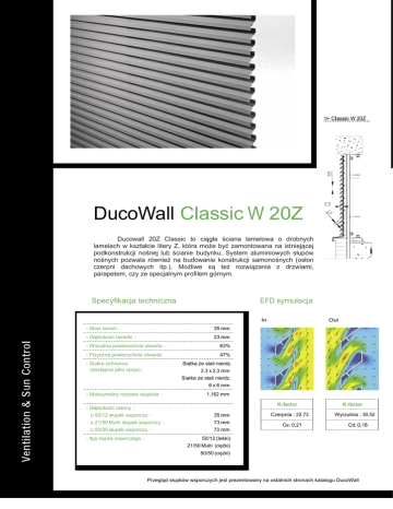 > Classic W 20Z DucoWall Classic W 20Z Ducowall 20Z Classic to ciągła ściana lamelowa o drobnych lamelach w kształcie litery Z, która może być zamontowana na istniejącej podkonstrukcji nośnej lub ścianie budynku. System aluminiowych słupów nośnych pozwala również na budowanie konstrukcji samonośnych (osłon czerpni dachowych itp.). Możliwe są też rozwiązania z drzwiami, parapetem, czy ze specjalnym profilem górnym. Specyfikacja techniczna EFD symulacja In - Skok lameli : 35 mm - Głębokość lamelki : 23 mm - Wizualna powierzchnia otwarta : Out 63% - Fizyczna powierzchnia otwarta : - Siatka ochronna (dostępna jako opcja) : 47% Siatka ze stali nierdz. 2.3 x 2.3 mm Siatka ze stali nierdz. 6 x 6 mm - Maksymalny rozstaw słupków : 1,162 mm - Głębokość osłony : o 50/12 słupek wsporczy : o 21/50 Multi słupek wsporczy : 35 mm 73 mm o 50/50 słupek wsporczy : 73 mm - typ słupka wsporczego : K-factor K-factor Czerpnia : 22.73 Ce: 0,21 Wyrzutnia : 30.52 Cd: 0,18 50/12 (lekki) 21/50 Multi (ciężki) 50/50 (ciężki) Przegląd słupków wsporczych jest prezentowany na ostatnich stronach katalogu DucoWall