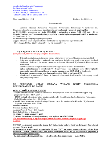 Akademia Wychowania Fizycznego im. Bronisława Czecha Centrum Edukacji Zawodowej 31-571 Kraków, Al. Jana Pawła II 78 tel.fax 012/683-14-45, tel.012/683-14-46 Nasz znak SK.424- 1 /14 Kraków 24.01.2014 r. Zawiadomienie Centrum Edukacji Zawodowej Akademii Wychowania Fizycznego w Krakowie im. Bronisława Czecha zawiadamia, że kurs instruktorów rekreacji ruchowej- część ogólna– nr 8/ 2013/2014 rozpocznie się dnia 15.02.2014 r. zebraniem o godz. 9.00 -9.45 sala K w Zespole Pomieszczeń Naukowo-Dydaktycznych /przy salach gimnastycznych/ AWF w Krakowie, Al. Jana Pawła II 78. Po zebraniu rozpoczną się zajęcia dydaktyczne. Zajęcia odbywać się w sesjach sobotnio-niedzielnych, zaplanowane są w terminach: -15,16 lutego.2014 r., 22,23 lutego 2014 r., 1,2 marca 2014 r., W y m a g a n e d o k u m e n t y na kurs : (Dotyczy osób, które nie złożyły kompletu dokumentów) - druk zgłoszenia typ A dostępny na stronie internetowej www.awf.krakow.pl/studium.html dokument potwierdzający wykształcenie minimum świadectwo ukończenia szkoły średniej lub ksero z indeksu 1 i 4 strona (dotyczy studentów Akademii Wychowania Fizycznego w Krakowie) ubezpieczenie od następstw nieszczęśliwych wypadków na czas trwania kursu opłata rekrutacyjna w wysokości 50,- (bezzwrotna) - nie dotyczy osób, które wpłaciły przy części specjalistycznej kursu organizowanego przez CEZ AWF w Krakowie. Pozostałe osoby proszone są o dokonanie wpłaty 50,00 zł na konto CEZ zdjęcie szt.1 o wymiarach 3,5 cm x 4,5 cm /nie obowiązuje jeżeli zostało złożone przy części specjalistycznej kursu/. NA PODSTAWIE WPŁAT DOPUSZCZAJĄCE DO ZAJĘĆ. ZOSTANĄ WYDANE KARTY UCZESTNIKA ODPŁATNOŚĆ ZA KURS WYNOSI - 440,00 złotych /słownie czterysta czterdzieści złotych (koszt kursu dla osób realizujących cały program) wplata do 31.01.2014 r. –230,00 złotych /słownie dwieście trzydzieści złotych/ (koszt kursu dla abs. kierunku: Fizjoterapia (Rehabilitacja) wplata do 31.01.2014 r. - 200,00 złotych /słownie: dwieście złotych/ (koszt kursu dla absolwentów kierunku: Wychowanie Fizyczne wplata do 31.01.2014 r. Płatna na konto: Centrum Edukacji Zawodowej Al. Jana Pawła II 78 , 31-571 Kraków Bank PeKaO S.A. w Krakowie 90 1240 4722 1111 0000 4859 4185 Tytułem: Instruktor rekreacji ruchowej -cz. ogólna Nr 8/2013/2014 Nie dokonanie wpłaty w wyznaczonym terminie będzie traktowane jako rezygnacja z kursu! UWAGA na życzenie uczestnika kursu do 7 dni od daty wpłaty, Centrum Edukacji Zawodowej wystawi fakturę VAT. W przypadku konieczności wystawienia faktury VAT na osobę prawną (firma, szkoła itp.) uczestnik kursu zobowiązany jest podać niezbędne dane do jej wystawienia (zgodnie z obowiązującymi przepisami): 1. pełna nazwa firmy, szkoły itp. 2. adres z kodem pocztowym 3. nr NIP-u Wszelkich informacji w sprawach organizacyjnych udziela : Centrum Edukacji Zawodowej AWF , tel. (12) 683-14-46, tel/fax (12) 683-14-45 pok. 514/ pawilon A. Centrum czynne w dniach: poniedziałek, wtorek, środa, piątek w godz. 10.00 -13.00, czwartek nieczynne Uwaga! osoby realizujące wybrane przedmioty / naliczanie kosztów indywidualne/ proszone są o kontakt telefoniczny lub osobisty w celu uzyskania informacji o wysokości wpłaty. RAMOWY PROGRAM KURSU INSTRUKTORÓW REKREACJI RUCHOWEJ – CZĘŚĆ OGÓLNA Rok akademicki 2013/2014 OSOBY REALIZUJĄCE CAŁY PROGRAM – 60 godz. –opłata 440,00 złotych Lp. 1. 2. 3. 4. 5. Zakres kształcenia Teoria i metodyka rekreacji Anatomiczno-fizjologiczne podstawy ćwiczeń fizycznych w rekreacji i sporcie powszechnym Humanistyczne podstawy rekreacji ruchowej i sportu powszechnego (pedagogika, psychologia, socjologia) Organizacja i marketing imprez sportowych i rekreacyjnych Pierwsza pomoc przedmedyczna RAZEM Liczba godzin 16 14 (8 godz.Anat. / 6 godz.Fizj.) 14 (5 godz. Pedag. / 5 godz. Psych. / 4 godz. Socjol) 10 Egzamin/zaliczenie Egzamin zaliczenie 6 60 zaliczenie zaliczenie zaliczenie ABSOLWENCI KIERUNKU: FIZJOTERAPIA - 30 godz. – opłata 230,00 złotych Lp. 1. 2. 3. Zakres kształcenia Teoria i metodyka rekreacji Humanistyczne podstawy rekreacji ruchowej i sportu powszechnego (socjologia) Organizacja i marketing imprez sportowych i rekreacyjnych RAZEM Liczba godzin 16 Egzamin/zaliczenie Egzamin zaliczenie 4 10 zaliczenie 30 ABSOLWENCI KIERUNKU: WYCHOWANIE FIZYCZNE – 26 godz.- opłata 200,00.złotych Lp. 1. 2. Zakres kształcenia Teoria i metodyka rekreacji Organizacja i marketing imprez sportowych i rekreacyjnych RAZEM Liczba godzin 16 10 Egzamin/zaliczenie Egzamin zaliczenie 26 KIEROWNIK Centrum Edukacji Zawodowej Dr Marcin Kaca
