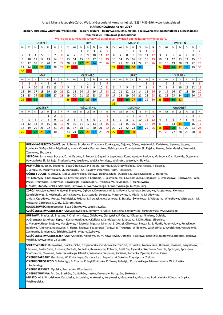 Urząd Miasta Jastrzębie-Zdrój, Wydział Gospodarki Komunalnej tel. (32) 47-85-396, www.jastrzebie.pl HARMONOGRAM na rok 2017 odbioru surowców wtórnych (worki) szkło – papier i tektura – tworzywa sztuczne, metale, opakowania wielomateriałowe z nieruchomości zamieszkałej – zabudowa jednorodzinna Worki z odpadami należy wystawiać przed posesją w dzień poprzedzający termin odbioru. STYCZEŃ LUTY MARZEC KWIECIEŃ Pn Wt Śr Cz 5 12 19 26 Pt So N 6 13 20 27 7 14 21 28 1 8 15 22 29 6 13 20 27 7 14 21 28 Pn Wt 2 9 16 23 30 3 10 17 24 31 4 11 18 25 Pn Wt Śr Cz Pt So N 1 8 15 22 29 2 9 16 23 30 3 10 17 24 31 4 11 18 25 5 12 19 26 6 13 20 27 7 14 21 28 Pn Wt Śr Pn Wt MAJ 5 12 19 26 6 13 20 27 Cz Pt So N 1 8 15 22 2 9 16 23 3 10 17 24 4 11 18 25 5 12 19 26 Pn Wt Śr Cz Pt So N 6 13 20 27 7 14 21 28 1 8 15 22 29 2 9 16 23 30 3 10 17 24 31 4 11 18 25 5 12 19 26 Pn Wt Śr Pt So N 7 14 21 28 1 8 15 22 29 CZERWIEC 5 12 19 26 6 13 20 27 Pn Wt WRZESIEŃ 4 11 18 25 Śr Pt So N Cz Pt So N 7 14 21 28 1 8 15 22 29 2 9 16 23 30 3 10 17 24 4 11 18 25 So N 7 14 21 28 1 8 15 22 29 2 9 16 23 30 3 10 17 24 7 14 21 28 1 8 15 22 29 2 9 16 23 30 3 10 17 24 31 Śr 4 11 18 25 Cz 5 12 19 26 Pt 6 13 20 27 Wt Śr Cz 6 13 20 27 6 13 20 27 Pt So N 7 14 21 28 1 8 15 22 29 2 9 16 23 30 4 11 18 25 5 12 19 26 Pn Wt Śr Cz Pt So N 2 9 16 23 30 7 14 21 28 1 8 15 22 29 2 9 16 23 30 3 10 17 24 31 4 11 18 25 5 12 19 26 6 13 20 27 Pn Wt Śr SIERPIEŃ 3 10 17 24 31 4 11 18 25 5 12 19 26 Pn Wt Śr Cz Pt So N 7 14 21 28 1 8 15 22 29 2 9 16 23 30 3 10 17 24 4 11 18 25 5 12 19 26 LISTOPAD 6 13 20 27 Cz 3 10 17 24 LIPIEC Śr PAŹDZIERNIK Cz Pn GRUDZIEŃ 4 11 18 25 5 12 19 26 6 13 20 27 Cz Pt So N 7 14 21 28 1 8 15 22 29 2 9 16 23 30 3 10 17 24 31 BORYNIA-SKRZECZKOWICE: gen J. Bema, Brodecka, Chabrowa, Edukacyjna, Gajowa, Górna, Kościelniok, Kwiatowa, Łąkowa, Łączna, Łowiecka, 3 Maja, Miła, Myśliwska, Nowa, Osińska, Partyzantów, Plebiscytowa, Powstańców Śl., Rajska, Siewna, Świerklańska, Wolności, Zamkowa, Zbożowa. SZEROKA: Bananowa, Boczna, D. i A. Dybów, A. Fredry, J. Gagarina, Jagodowa, Kombatantów, Ludowa, Malinowa, C.K. Norwida, Odpolany, Powstańców Śl., M. Reja, Truskawkowa, Węglowa, Wojska Polskiego, Wolności, Wesoła, H. Sławika. PRZYJAŹŃ: ks. bp. H. Bednorza, Boża Góra Lewa, P. Findera, Górnicza, M. Grażyńskiego, J.Krasickiego, J. Ligonia, J. Lompy, M. Mielżyńskiego, St. Moniuszki, PCK, Piastów, Połomska, Rotm. Pileckiego. GÓRNE I DOLNE: A. Asnyka, T. Boya-Żeleńskiego, Bukowa, Dębina, Długa, Dubielec, K.I.Gałczyńskiego, Z. Herberta, św. Katarzyny, J. Kasprowicza, J.I. Kraszewskiego, J. Lechonia, B. Leśmiana, św. J. Nepomucena, Okopowa, E. Orzeszkowej, Pochwacie, Polna, Prusa, J.Przybosia, Pszczyńska, Równoległa, Ruchu Oporu, Rybnicka, W. Reymonta, H. Sienkiewicza, L. Staffa, Stodoły, Sielska, Strażacka, Szybowa, J. Twardowskiego, K. Wierzyńskiego, G. Zapolskiej. ZDRÓJ: Akacjowa, Armii Krajowej, Brzozowa, Dębowa, Dworcowa, Al. Jana Pawła II, Jodłowa, Jesionowa, Kasztanowa, Klonowa, Kondziołowiec, T. Kościuszki, Leśna, Lipowa, 11 Listopada, Lwowska, Mazurowiec, K. Miarki, A. Mickiewicza, 1 Maja, Ogrodowa, Prosta, Podmiejska, Różana, J. Słowackiego, Sosnowa, S. Staszica, Świerkowa, J. Wieczorka, Wierzbowa, Wiśniowa, M. Witczaka, Zdrojowa, K. Zioły, S. Żeromskiego. BOGOCZOWIEC: Bogoczowiec, Boża Góra Prawa, Wodzisławska. CZĘŚĆ SOŁECTWA MOSZCZENICA: Dąbrowskiego, Komuny Paryskiej, Kościelna, Szotkowicka, Skrzyszowska, Wyszyńskiego. RUPTAWA: Biadoszek, Brzeziny, J. Chełmońskiego, Chlebowa, Cieszyńska, F. Czyża, J.Długosza, Gliniana, Gołębia, A. Grottgera, Jaskółcza, Kępa, J. Kochanowskiego, H.Kołłątaja, Konduktorska, J. Kossaka, J. Kilińskiego, Libowiec, J. Malczewskiego, Majowa, Maryjowiec, J. Matejki, Mączna, Młyńska, S. Okrzei, Oliwkowa, Piesza, ks.E. Płonki, Przemysłowa, Pułaskiego, Rajdowa, T. Rejtana, Ruptawiec, P. Skargi, Sadowa, Spacerowa, Torowa, R. Traugutta, Widokowa, Wschodnia, J. Wybickiego, Wyzwolenia, Zachodnia, Zamłynie, D. Ździebły, Żwirki i Wigury, Żwirowa. CZĘŚĆ SOŁECTWA MOSZCZENICA: Frysztacka, Kolejowa, ks. M. Kowalczyka, Okręgliki, Piaskowa, Ranoszka, Ruptawska, Rzeczna, Tęczowa, Wiejska, Wyzwolenia, Za Lasem. SOŁECTWO BZIE: Budowlana, Bracka, Cicha, Gospodarska, Grzybowa, Hetmańska, Husarska, Kolonia Jana, Klubowa, Kłosowa, Kosynierów, Libowiec, Pastorówka, Pszenna, Pochyła, Podleśna, Rekreacyjna, Rolnicza, Rostków, Rycerska, Skerbenia, Skotnia, Spokojna, Sportowa, Spółdzielcza, Stawowa, Świerczewskiego, Ułańska, Wiosenna, Wspólna, Zaciszna, Zamecka, Zgodna, Żytnia, Żyzna. OSIEDLE BARBARY: Graniczna, W. Korfantego, Olszowa, ks. J. Popiełuszki, Szkolna, Turystyczna, Zielona. OSIEDLE CHROBREGO: S. Batorego, B. Czecha, K. Jagiellończyka, Królowej Jadwigi, J.Kusocińskiego, Marusarzówny, W. Łokietka, J. Sobieskiego. OSIEDLE STASZICA: Opolska, Poznańska, Wrocławska. OSIEDLE TUWIMA: Astrów, Bratków, Goździków, Irysów, Krokusów, Narcyzów, Stokrotek. MIASTO: Al. J. Piłsudskiego, Kaszubska, Katowicka, Krakowska, Kurpiowska, Mazowiecka, Mazurska, Podhalańska, Północna, Śląska, Wielkopolska.