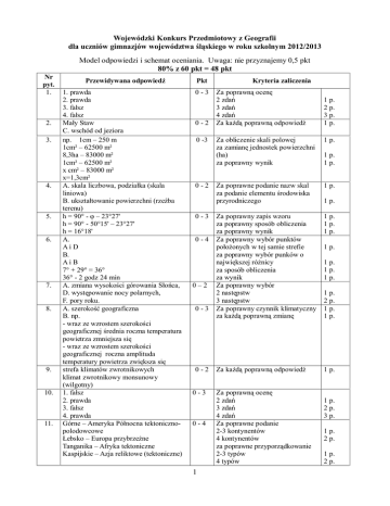 Wojewódzki Konkurs Przedmiotowy z Geografii dla uczniów gimnazjów województwa śląskiego w roku szkolnym 2012/2013 Model odpowiedzi i schemat oceniania. Uwaga: nie przyznajemy 0,5 pkt 80% z 60 pkt = 48 pkt Nr pyt. 1. 2. 3. 4. 5. 6. 7. 8. 9. 10. 11. Przewidywana odpowiedź 1. prawda 2. prawda 3. fałsz 4. fałsz Mały Staw C. wschód od jeziora np. 1cm – 250 m 1cm² – 62500 m² 8,3ha – 83000 m² 1cm² – 62500 m² x cm² – 83000 m² x=1,3cm² A. skala liczbowa, podziałka (skala liniowa) B. ukształtowanie powierzchni (rzeźba terenu) h = 90° - φ – 23°27' h = 90° - 50°15' – 23°27' h = 16°18' A. AiD B. AiB 7° + 29° = 36° 36° - 2 godz 24 min A. zmiana wysokości górowania Słońca, D. występowanie nocy polarnych, F. pory roku. A. szerokość geograficzna B. np. - wraz ze wzrostem szerokości geograficznej średnia roczna temperatura powietrza zmniejsza się - wraz ze wzrostem szerokości geograficznej roczna amplituda temperatury powietrza zwiększa się strefa klimatów zwrotnikowych klimat zwrotnikowy monsunowy (wilgotny) 1. fałsz 2. prawda 3. fałsz 4. prawda Górne – Ameryka Północna tektonicznopolodowcowe Łebsko – Europa przybrzeżne Tanganika – Afryka tektoniczne Kaspijskie – Azja reliktowe (tektoniczne) Pkt 0-3 0-2 0 -3 0-2 0-3 0-4 0–2 0-3 0-2 0-3 0-4 1 Kryteria zaliczenia Za poprawną ocenę 2 zdań 3 zdań 4 zdań Za każdą poprawną odpowiedź 1 p. 2 p. 3 p. 1 p. Za obliczenie skali polowej za zamianę jednostek powierzchni (ha) za poprawny wynik 1 p. Za poprawne podanie nazw skal za podanie elementu środowiska przyrodniczego 1 p. Za poprawny zapis wzoru za poprawny sposób obliczenia za poprawny wynik Za poprawny wybór punktów położonych w tej samie strefie za poprawny wybór punków o największej różnicy za sposób obliczenia za wynik Za poprawny wybór 2 następstw 3 następstw Za poprawny czynnik klimatyczny za każdą poprawną zmianę 1 p. 1 p. 1 p. Za każdą poprawną odpowiedź 1 p. Za poprawną ocenę 2 zdań 3 zdań 4 zdań Za poprawne podanie 2-3 kontynentów 4 kontynentów za poprawne przyporządkowanie 2-3 typów 4 typów 1 p. 1 p. 1 p. 1 p. 1 p. 1 p. 1 p. 1 p. 2 p. 1 p. 1 p. 1 p. 2 p. 3 p. 1 p. 2 p. 1 p. 2 p. 12. 13 14 15 16 17 18. 19. 20. A. 96,5% B. wody podziemne, lodowce i stała pokrywa śnieżna, marzłoć trwała 1C 2D 3A 4E 1. wiatr, akumulacja 2. rzeka (wody płynące) erozja boczna A. C – Andy D – Himalaje F – Kordyliery B. np. Islandia położona jest na grzbiecie oceanicznym stanowiącym granicę między płytami litosfery. W strefie ryftowej płyty odsuwają się od siebie, a materia z wnętrza ziemi wydobywa się na powierzchnię m.in. podczas erupcji wulkanów międzyzwrotnikowa – strefa klimatów równikowych lub zwrotnikowych umiarkowana – strefa klimatów umiarkowanych, podzwrotnikowych, zwrotnikowych, okołobiegunowych podbiegunowa – strefa klimatów okołobiegunowych lub umiarkowanych A. A – Równiny Centralne C – Kotlina Kongo E - Atacama B. B – tundra C – wilgotny las równikowy D – las zrzucający liście na zimę Od góry czarnoziemy bielicowe czerwonożółte cynamonowe np. - są wiecznie zielone, czyli wegetacja trwa cały rok, - występuje bardzo dużo gatunków roślin, - dno lasów jest zacienione, -występują liczne epifity 0-2 Za każdą poprawną odpowiedź 1 p. 0-3 Za poprawne przyporządkowanie 2 form 3 form 4 form Za każdą poprawną odpowiedź 1 p. 2 p. 3 p. 1 p. Za poprawne wskazanie 2 krain 3 krain 1 p. 2 p. 0–4 0-4 za uwzględnienie w wyjaśnieniu położenia Islandii na granicy płyt -rozsuwania się płyt litosfery (strefy ryftowej) 0-2 Za poprawne podanie po 1 strefie klimatycznej do 2 stref oświetlenia po 1 strefie klimatycznej do 3 stref oświetlenia 1 p. 1 p. 1 p. 2 p. 0-4 0-3 za poprawne przyporządkowanie 2 krain 3 krain za poprawne przyporządkowanie 2 formacji roślinnych 3 formacji roślinnych 1 p. 2 p. 1 p. 2 p. Za poprawne przyporządkowanie 2 typów 3 typów 4 typów 1 p. 2 p. 3 p. 0-2 Za podanie 1 cechy za podanie 2 cech 1 p. 2 p.t 0-5 Za każdy zaznaczony i podpisany obiekt za zaznaczenie punktu o podanych współrzędnych 2 1 p. 1 p.