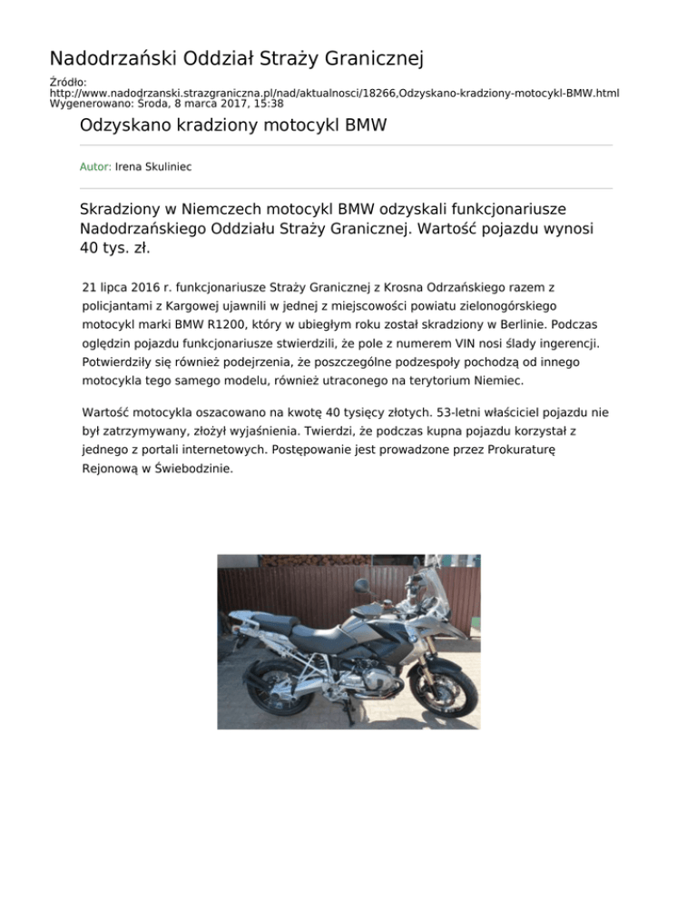 Nadodrzański Oddział Straży Granicznej Źródło: http://www.nadodrzanski.strazgraniczna.pl/nad/aktualnosci/18266,Odzyskano-kradziony-motocykl-BMW.html Wygenerowano: Środa, 8 marca 2017, 15:38 Odzyskano kradziony motocykl BMW Autor: Irena Skuliniec Skradziony w Niemczech motocykl BMW odzyskali funkcjonariusze Nadodrzańskiego Oddziału Straży Granicznej. Wartość pojazdu wynosi 40 tys. zł. 21 lipca 2016 r. funkcjonariusze Straży Granicznej z Krosna Odrzańskiego razem z policjantami z Kargowej ujawnili w jednej z miejscowości powiatu zielonogórskiego motocykl marki BMW R1200, który w ubiegłym roku został skradziony w Berlinie. Podczas oględzin pojazdu funkcjonariusze stwierdzili, że pole z numerem VIN nosi ślady ingerencji. Potwierdziły się również podejrzenia, że poszczególne podzespoły pochodzą od innego motocykla tego samego modelu, również utraconego na terytorium Niemiec. Wartość motocykla oszacowano na kwotę 40 tysięcy złotych. 53-letni właściciel pojazdu nie był zatrzymywany, złożył wyjaśnienia. Twierdzi, że podczas kupna pojazdu korzystał z jednego z portali internetowych. Postępowanie jest prowadzone przez Prokuraturę Rejonową w Świebodzinie.