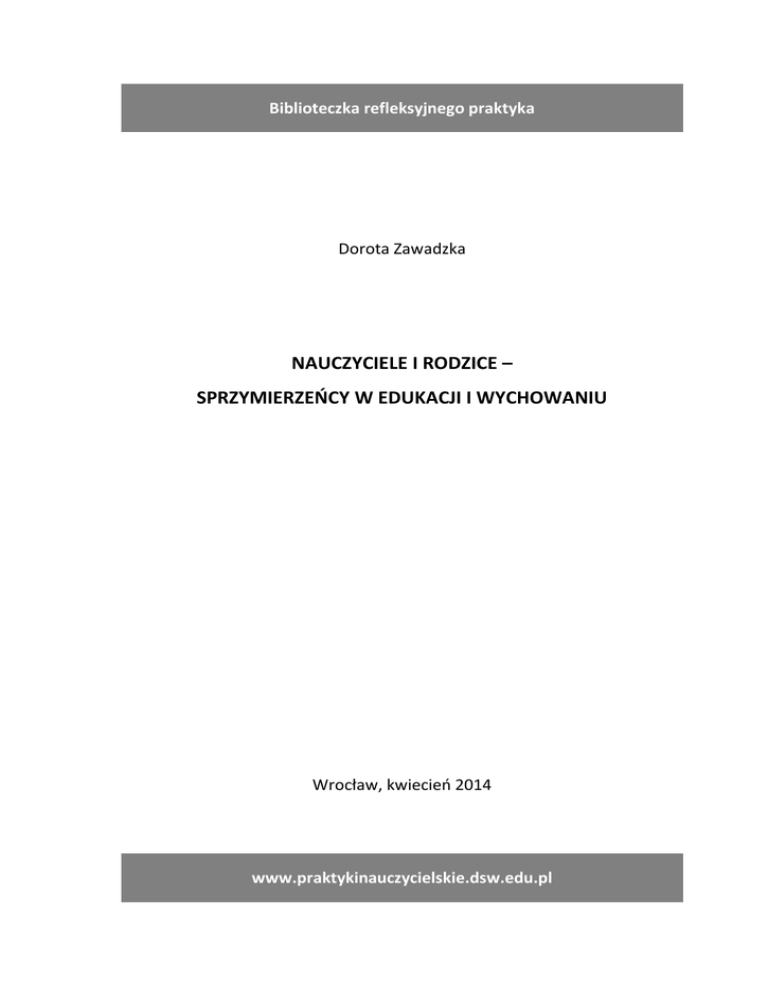 Biblioteczka refleksyjnego praktyka Dorota Zawadzka NAUCZYCIELE I RODZICE – SPRZYMIERZEŃCY W EDUKACJI I WYCHOWANIU Wrocław, kwiecień 2014 Biblioteczka refleksyjnego praktyka www.praktykinauczycielskie.dsw.edu.pl Strona | 2 Tezy 1. Formy kontaktu nauczycieli oraz instytucji edukacyjnych z rodzicami. 2. Znaczenie dobrej współpracy. 3. Wzajemne oczekiwania. 4. Plany edukacyjno-wychowawcze, jako podstawa dobrej współpracy. 5. Metody komunikacji, bariery i wyzwania. Niniejsze opracowanie stanowi rozszerzenie tez wykładu, który przygotowałam dla Dolnośląskiej Szkoły Wyższej. Jest to zbiór moich własnych doświadczeń z czasu, gdy czynnie uprawiałam zawód nauczyciela, oraz jest wynikiem przetworzenia informacji, które gromadzę od kilku lat, spotykając się z tysiącami nauczycieli i rodziców w Polsce. Wypada zacząć od postawienia pytania: Czy jakość komunikacji placówek edukacyjnych z rodzicami jest w Polsce dobra, czy też wymaga poprawy? Uważam, że wymaga poprawy i to natychmiastowej. Podam przykład uzasadniający moją opinię. Otóż w latach 2008-2014 w szkołach i przedszkolach przeprowadzana jest reforma systemu edukacyjnego. Najbardziej widoczną, wśród dorosłych, postawą wobec tego procesu jest opór. Opór, który wynika z kilku czynników, ale według mnie przede wszystkim z faktu, że poziom komunikacji szkoły z rodzicami pozostawia wiele do życzenia. Rodzice i dziadkowie dzisiejszych uczniów nie mają, na ogół sami dobrych doświadczeń, nauczyciele z kolei nie są uczeni technik kontaktu z dorosłymi i tego jak być partnerem mamy czy taty swojego ucznia. Nie wszystko jest oczywiście winą nauczyciela. Problem, który uwidacznia się poprzez obserwację relacji nauczyciel – rodzic, jest w istocie efektem naszych społecznych uwarunkowań i braku zaufania wobec instytucji w ogóle, a państwowych w szczególności. Strona | 3 Stawiamy się, niejako automatycznie, po dwóch stronach barykady, i zamiast robić coś wspólnie, szukamy usprawiedliwienia dla niezgodnych z naszymi wyobrażeniami, czy oczekiwaniami efektów procesu kształcenia. Poniżej znajdą Państwo opisanie rekomendowanych i uznanych za efektywne modeli relacji nauczycieli z rodzicami. Starałam się także nazwać i uszczegółowić zagrożenia, które mogą przeszkadzać we właściwej współpracy. Mam nadzieję, że skorzystają Państwo z mojego doświadczenia: dla lepszej jakości edukacji naszych dzieci i współpracy ich rodziców z placówkami oświatowymi. 1. Formy kontaktu nauczycieli oraz instytucji edukacyjnych z rodzicami. Rodzice odprowadzając dziecko do placówki edukacyjnej, zawierają z nimi de facto pewien rodzaj kontraktu. Kontraktu, w myśl którego, obie strony powinny współdziałać. Ma to polegać na robieniu wszystkiego, co w ich mocy, aby wykształcić i ukształtować człowieka gotowego na podjęcie wyzwań przyszłości. Wyzwań, o których możemy w sumie jedynie spekulować. Nie wiemy bowiem dokładnie jak będzie wyglądał świat naszych dzieci na końcu ich drogi edukacyjnej. Nauczyciel świadczy usługę edukacyjną na zlecenie rodzica. Odbiorcą tej usługi jest dziecko. Dobra współpraca między nauczycielami a rodzicami uczniów to jeden z filarów sukcesów edukacyjnych ucznia. To także fundament sukcesów wychowawczych nauczyciela. Na każdym poziomie edukacji szkolnej. Nauczyciel musi mieć świadomości pamiętać, że to rodzice są najlepszym źródłem informacji o swoich dzieciach, o ich słabych i mocnych stronach, potrzebach, zainteresowaniach, stresach. To rodzice powinni wiedzieć, jakie dziecko ma strategie radzenia sobie z trudnościami – wiedza ta powinna być przekazana przez rodziców nauczycielowi rozpoczynającemu pracę z dzieckiem. Dzięki informacji od rodziców nauczyciel ma możliwość spojrzenia na ucznia z innej perspektywy. Wypełnia to, buduje pełen obraz dziecka – ucznia. Takie postrzeganie relacji nauczyciel-rodzic, sfocusowane na potrzebach i wsparciu dziecka – jest niestety rzadkością. Nauczyciel Strona | 4 zostaje postawiony przez niebywale trudnym zadaniem, a mianowicie poznania ucznia i jego możliwości bez wiedzy o posiadanych przez niego strategiach radzenia sobie w życiu „pozaszkolnym”. Musi więc bardzo szybko rozpoznać dziecko i jego potrzeby jednocześnie prowadząc proces edukacyjny. To bardzo trudne zadanie. Rodzice bywają często wyzwaniem dla nauczycieli. Oczywiście również nauczyciele stanowią niekiedy wyzwanie dla rodziców. Koniecznie musimy pamiętać, że ta zależność jest dwustronna. Wiele razy słyszałam od nauczycieli: „Z dziećmi radzimy sobie znakomicie, ale ich rodzice… to zupełnie inna sprawa.” Nauczyciele bardzo często skarżą się, że rodzice nie są zainteresowani tym, co dzieje się na linii nauczyciel - uczeń. Nie ma więc dialogu, który pozwoliłby na moderowanie emocji dziecka w związku z zachowaniami i metodami pracy stosowanymi przez nauczyciela. W drugą stronę również, brak jest wsparcia rodzica dla pracy kadry pedagogicznej i pomocy w ustaleniu optymalnych technik motywacyjnych i działań budujących społeczność szkolną. Kształtowanie właściwych, z punktu widzenia szeroko pojętego społeczeństwa, cech u dziecka - czyli wychowanie – wymaga oczywiście czasu oraz dużego nakładu pracy. Mają ją do wykonania dorośli: nauczyciele i rodzice. Optymalnie byłoby, gdyby praca ta była wykonywana wspólnie. „Rodziców oskarża się, ale się ich nie szkoli.”– stwierdza T. Gordon. Warto i należy zmienić to podejście. Dlaczego tak trudno nauczycielom znaleźć wspólny język z rodzicami wychowanka, czy ucznia? Dlaczego rodzice niezbyt ufają nauczycielskim kompetencjom? Problem jest bardzo złożony. Składają się na niego własne doświadczenia rodzicielskie, doświadczenia zawodowe nauczycieli, tzw. praktyka szkolna. Oliwy do ognia dolewają media. Często można odnieść wrażenie, że zamiast nici por