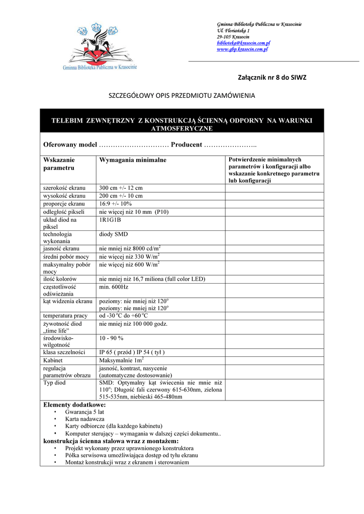 Gminna Biblioteka Publiczna w Krasocinie Ul. Floriańska 1 29-105 Krasocin [email protected] www.gbp.krasocin.com.pl Załącznik nr 8 do SIWZ SZCZEGÓŁOWY OPIS PRZEDMIOTU ZAMÓWIENIA TELEBIM ZEWNĘTRZNY Z KONSTRUKCJĄ ŚCIENNĄ ODPORNY NA WARUNKI ATMOSFERYCZNE Oferowany model ………………………… Producent ………………….. Wskazanie parametru Wymagania minimalne szerokość ekranu wysokość ekranu proporcje ekranu odległość pikseli układ diod na piksel technologia wykonania jasność ekranu średni pobór mocy maksymalny pobór mocy ilość kolorów częstotliwość odświeżania kąt widzenia ekranu 300 cm +/- 12 cm 200 cm +/- 10 cm 16:9 +/- 10% nie więcej niż 10 mm (P10) 1R1G1B temperatura pracy żywotność diod „time life” środowiskowilgotność klasa szczelności Kabinet regulacja parametrów obrazu Typ diod diody SMD nie mniej niż 8000 cd/m2 nie więcej niż 330 W/m2 nie więcej niż 600 W/m2 nie mniej niż 16,7 miliona (full color LED) min. 600Hz poziomy: nie mniej niż 120o poziomy: nie mniej niż 120o od -30 oC do +60 oC nie mniej niż 100 000 godz. 10 - 90 % IP 65 ( przód ) IP 54 ( tył ) Maksymalnie 1m2 jasność, kontrast, nasycenie (automatyczne dostosowanie) SMD: Optymalny kąt świecenia nie mnie niż 110o; Długość fali czerwony 615-630nm, zielona 515-535nm, niebieski 465-480nm Elementy dodatkowe: • • • Gwarancja 5 lat Karta nadawcza Karty odbiorcze (dla każdego kabinetu) Komputer sterujący – wymagania w dalszej części dokumentu.. • konstrukcja ścienna stalowa wraz z montażem: • • • Projekt wykonany przez uprawnionego konstruktora Półka serwisowa umożliwiająca dostęp od tyłu ekranu Montaż konstrukcji wraz z ekranem i sterowaniem Potwierdzenie minimalnych parametrów i konfiguracji albo wskazanie konkretnego parametru lub konfiguracji OPROGRAMOWANIE DO ZARZĄDZANIA TREŚCIĄ WYŚWIETLANĄ NA TABLICY Oprogramowanie do zarządzania systemem Szczegółowy opis funkcjonalności oprogramowania 1. Zarządzanie systemem Zarządzanie przez przeglądarkę Zarządzanie odbywa się poprzez dedykowany serwer Skalowalna wielkość interfejsu możliwość zarządzania systemem informacji multimedialnej z dowolnego komputera z dostępem do Internetu możliwość zarządzania wieloma typami nośników multimedialnych – odtwarzaczy (Ekranami LED, ekranami LCD, itd.) w jednym miejscu możliwość definiowania wielu dowolnej liczby kont użytkowników możliwość rozbudowy systemu o kolejne odtwarzacze 2. Zarządzania odtwarzaczem Możliwość wyświetlania szczegółowych informacji: Wersja oprogramowania, Ostatni adres IP, Procesor, Pamięć RAM, Dyski, System operacyjny, Interfejsy sieciowe, Aktywny monitor, Aktywna rozdzielczość, Dostępne rozdzielczości Możliwość wyświetlania aktualnych parametrów pracy odtwarzacza: wykorzystanie CPU przez aplikację, wykorzystanie CPU przez system, wykorzystanie pamięci RAM przez aplikację, wykorzystanie pamięci RAM przez system, wykorzystanie dysków twardych (3 nośniki) Możliwość przypisywania danych teleadresowych, dane osoby kontaktowej oraz opisu Możliwość konfiguracji synchronizacji odtwarzacza z systemem zależnej od dnia lub ostatniej modyfikacji Możliwość zaplanowania automatycznego restartowania odtwarzacza, godzin wyłączania ekranu oraz czyszczenia zasobów odtwarzacza Możliwość zaawansowanej konfiguracji jasności ekranu: statecznie zależna od rozkładu godzinowego lub dynamicznie na podstawie położenia geograficznego. Możliwość przypisania do odtwarzacza jednego z trzech sposobu odtwarzania: Lista odtwarzania, Lokalna lista odtwarzania , Harmonogram odtwarzania Możliwość podglądu aktualnego zrzutu ekranu wraz z dokładną godziną zrzutu Możliwość zmiany rozdzielczości wyświetlanego przez odtwarzacz obrazu Możliwość podglądu aktualnego stanu zasobów odtwarzacza Funkcja zdalnej aktualizacji wersji Oprogramowania na odtwarzacza 3. Zarządzanie użytkownikami Możliwość dodawania przez administratora nowych kont użytkowników chronionych hasłem Możliwość nadawanie różnych uprawnień dostępu dla użytkowników Informacje na temat użytkowników w postaci listy zawierającej: Użytkownika, login, adres e-mail, aktywność, typ konta Możliwość zmiany przez administratora nowych hasła dla każdego użytkownika Możliwość wprowadzania danych teleadresowych dla każdego użytkownika Możliwość określania czasu sesji dla każdego użytkownika po upłynięciu którego użytkownik zostaną automatycznie wylogowany Możliwość konfiguracji wyświetlania pomocy dla każdego z użytkowników Możliwość blokowania dostępu i wylogowania dla każdego użytkownika lub grupy wybranych użytkowników 4. Zarządzanie odtwarzaniem Możliwość tworzenia dowolnej liczby szablonów Standardowo dostępny „Szablon Podstawowy” z nałożoną blokadą usunięcia Możliwość tworzenia dowolnej liczby stref odtwarzania dla każdego z szablonów Możliwość graficznej edycji Szablonu lub precyzyjnego określania wymiarów w pikselach szablonu i stref Możliwość nadawania nazw strefą odtwarzania Możliwość zdefiniowania dowolnego koloru tła lub wybranego z gotowej palety Możliwość ustawienia własnego pliku graficznego jako tło dla każdego z szablonów oraz określanie trybu jego wyświetlania: rozciągnięty, zeskalowany przycięty Możliwość nadawania własnych nazw Strefom Dostępny gotowy zestaw najczęściej używanych rozmiarów szablonów w formie rozwijanej listy w górnej prawej części graficznego edytora szablonu Możliwość tworzenia dowolnej liczby list odtwarzania Możliwość przypisywania wielu szablonów do każdej z list oraz określania czasu rotacji pomiędzy nimi Możliwość tworzenia kolejki zasobów dla każdej ze stref szablonu Możliwość określania czasu trwania listy odtwarzania List odtwarzania w formie listy zasobów zawierającej: typ, nazwę, alias, czas oraz możliwość podglądu zaso