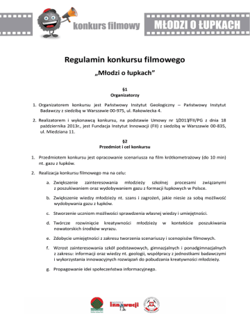 Regulamin konkursu filmowego „Młodzi o łupkach” §1 Organizatorzy 1. Organizatorem konkursu jest Państwowy Instytut Geologiczny – Państwowy Instytut Badawczy z siedzibą w Warszawie 00-975, ul. Rakowiecka 4. 2. Realizatorem i wykonawcą konkursu, na podstawie Umowy nr 1/2013/FII/PG z dnia 18 października 2013r., jest Fundacja Instytut Innowacji (FII) z siedzibą w Warszawie 00-835, ul. Miedziana 11. §2 Przedmiot i cel konkursu 1. Przedmiotem konkursu jest opracowanie scenariusza na film krótkometrażowy (do 10 min) nt. gazu z łupków. 2. Realizacja konkursu filmowego ma na celu: a. Zwiększenie zainteresowania młodzieży szkolnej procesami związanymi z poszukiwaniem oraz wydobywaniem gazu z formacji łupkowych w Polsce. b. Zwiększenie wiedzy młodzieży nt. szans i zagrożeń, jakie niesie za sobą możliwość wydobywania gazu z łupków. c. Stworzenie uczniom możliwości sprawdzenia własnej wiedzy i umiejętności. d. Twórcze rozwinięcie kreatywności nowatorskich środków wyrazu. młodzieży w kontekście poszukiwania e. Zdobycie umiejętności z zakresu tworzenia scenariuszy i scenopisów filmowych. f. Wzrost zainteresowania szkół podstawowych, gimnazjalnych i ponadgimnazjalnych z zakresu: informacji oraz wiedzy nt. geologii, współpracy z jednostkami badawczymi i wykorzystania innowacyjnych rozwiązań do pobudzania kreatywności młodzieży. g. Propagowanie idei społeczeństwa informacyjnego. §3 Uczestnicy 1. Uczestnikami konkursu mogą być uczniowie szkół podstawowych, gimnazjalnych i ponadgimnazjalnych. 2. Do konkursu może się zgłosić jeden uczeń, bądź zespół do max. trzech osób. 3. W konkursie biorą udział osoby, które są autorami nadesłanej pracy konkursowej. §4 Opiekun uczestnika/zespołu uczestników 1. Każdy uczestnik lub zespół uczestników konkursu musi mieć wskazanego opiekuna. Opiekunem uczestnika lub zespołu uczestników jest pracownik szkoły, z której pochodzi zgłoszenie. 2. Opiekun uczestników/zespołu uczestników odpowiada za wypełnienie formularza zgłoszeniowego szkoły, a tym samym za zgłoszenie. 3. Opiekun uczestnika/ów może nadzorować prace merytoryczne nad projektem, ale nie może wpływać na sposób realizacji pomysłu przez uczestników. 4. Rolą opiekuna jest zgłoszenie uczestnika/zespołu uczestników oraz wparcie młodzieży w procesie znalezienia źródeł informacji nt. gazu z łupków. 5. W przypadku finalistów – udział w dwudniowych warsztatach scenariuszowych. 6. W przypadku zwycięzców przyjazd do Warszawy na rozdanie nagród i projekcję filmu zrealizowanego na podstawie zwycięskiego scenariusza. §5 Szczegółowe zasady konkursu 1. Konkurs ma formę opracowania scenariusza na film krótkometrażowy – do 10 min. nt. gazu z łupków (aspekty geologiczne, środowiskowe, społeczne). 2. Uczestnicy mają dowolność w opracowaniu historii na scenariusz filmowy (film dokumentalny, przyrodniczy, obyczajowy, komedia, kryminał itp.). 3. Konkurs nie obejmuje historii na filmy rysunkowe i animowane. 4. Strony główne konkursu: www.ii.org.pl (Fundacja Instytut Innowacji) oraz www.pgi.gov.pl (Państwowy Instytut Geologiczny – Państwowy Instytut Badawczy). 5. Pracę konkursową oraz wydrukowane, wypełnione i podpisane obowiązkowe załączniki nr: 1, 2 i 3 (formularz zgłoszeniowy do konkursu i oświadczenia) należy przesłać na adres Fundacji Instytut Innowacji do dnia 10 marca 2014 (decyduje data stempla pocztowego). Fundacja Instytut Innowacji ul. Miedziana 11, 000-835 Warszawa z dopiskiem: „Konkurs filmowy: Młodzi o łupkach” 6. Pracę konkursową, podpisany formularz zgłoszeniowy wraz z oświadczeniami należy również przesłać w formie skanu na adres mailowy: [email protected] w terminie do dnia 10 marca 2014 r. 7. Nadesłane prace konkursowe i formularze zgłoszeniowe po 10 marca 2014 r. będą odrzucane. 8. Szkoła, z której uczniowie przystąpią do konkursu, ma prawo do umieszczenia informacji o konkursie, banneru konkursu i logotypów na stronie internetowej szkoły. §7 Przebieg konkursu Konkurs przebiega w trzech etapach. Etap I: Grudzień 2013 – Marzec 2014 1. Ogłoszenie konkursu: grudzień 2013 2. Zgłaszanie prac konkursowych: grudzień 2013 – 10 marca 2014 3. Ocena prac konkursowych i wyłonienie finalistów I Etapu: 31 marca 2014 Etap II: Kwiecień 2014 1. Dwudniowe warsztaty dla finalistów 15 najlepszych prac łączących wiedzę o gazie z formacji łupkowych z warsztatami filmowymi: kwiecień 2014 2. Ogłoszenie zwycięzcy/ów konkursu: do 28 kwietnia 2014. Etap III: Maj – Czerwiec 2014 1. Realizacja filmu w oparciu o zwycięski scenariusz: maj 2014. 2. Zorganizowanie uroczystości finału konkursu, czyli premiery filmu i promocja najlepszej pracy konkursowej: czerwiec 2014. §8 Scenariusz i scenopis filmu 1. Scenariusz filmu musi dotyczyć tematyki gazu z formacji łupkowych w Polsce. 2. Scenopis filmu powinien składać się z: a. Idei: co Autor chce pokazać poprzez film? b. Fabuły: krótkie opowiadanie kogo/czego dotyczy film, w jakim miejscu odbywa się akcja, jaka jest sytuacja wyjściowa dla historii filmu? c. Portretów bohaterów: krótkie charakterystyki występujących bohaterów (wiek, cechy charakteru itp.). 3. Pomysł (w zależności od gatunku) może zawierać fikcyjną historię, ale nie może naruszać praw osób trzecich, kogokolwiek obrażać itd. §9 Nagrody 1. Główną nagrodą w konkursie filmowym „Młodzi o łupkach” jest realizacja zwycięskiego pomysłu przez profesjonalną ekipę filmową oraz zaproszenie na uroczystą premierę filmu. 2. Nagrodą dla finalistów konkursu będzie udział w dwudniowych warsztatach filmowych w Warszawie. 3. Nagrody rzeczowe w postaci: dla zwycięzcy/ów konkursu. książek, albumów, fragmentu skały „łupkowej” §10 Transport i zakwaterowanie 1. Fundacja Instytut Innowacji zwraca finalistom i zwycięzcom konkursu koszty dojazdu wraz z opiekunem na warsztaty filmowe oraz na finał