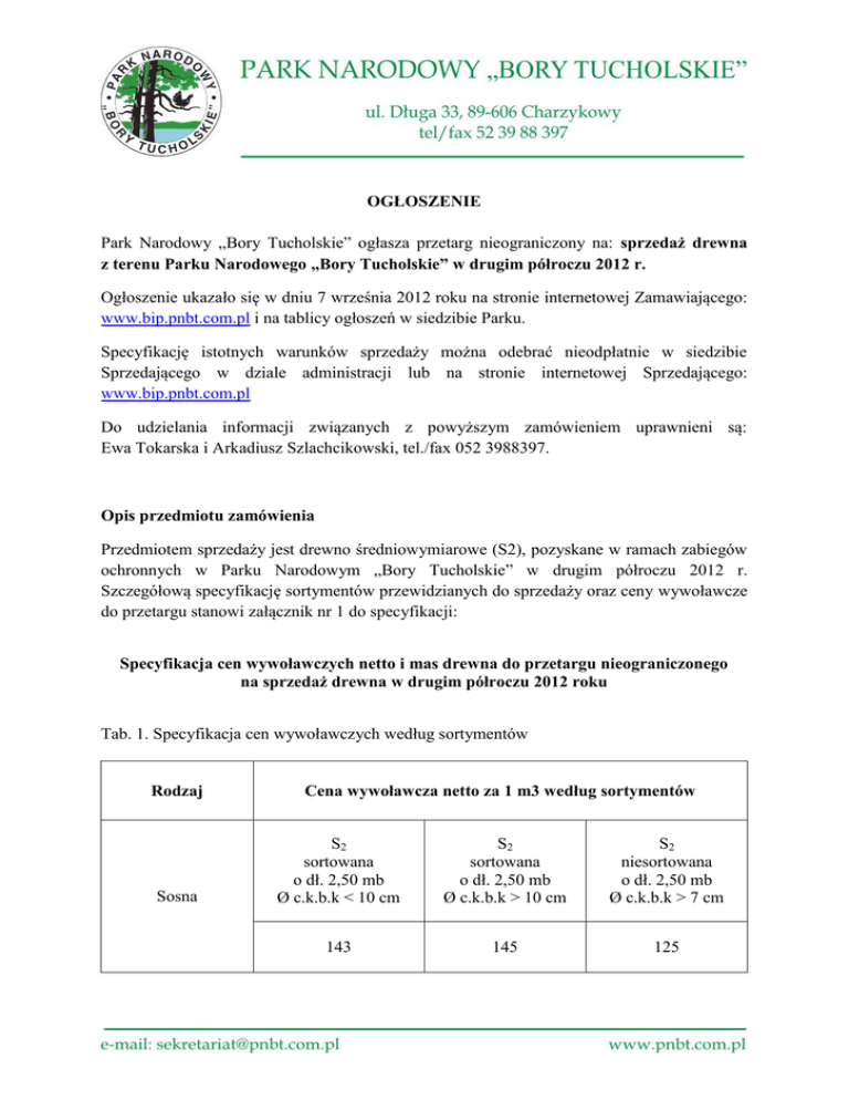 OGŁOSZENIE Park Narodowy „Bory Tucholskie” ogłasza przetarg nieograniczony na: sprzedaż drewna z terenu Parku Narodowego „Bory Tucholskie” w drugim półroczu 2012 r. Ogłoszenie ukazało się w dniu 7 września 2012 roku na stronie internetowej Zamawiającego: www.bip.pnbt.com.pl i na tablicy ogłoszeń w siedzibie Parku. Specyfikację istotnych warunków sprzedaży można odebrać nieodpłatnie w siedzibie Sprzedającego w dziale administracji lub na stronie internetowej Sprzedającego: www.bip.pnbt.com.pl Do udzielania informacji związanych z powyższym zamówieniem uprawnieni są: Ewa Tokarska i Arkadiusz Szlachcikowski, tel./fax 052 3988397. Opis przedmiotu zamówienia Przedmiotem sprzedaży jest drewno średniowymiarowe (S2), pozyskane w ramach zabiegów ochronnych w Parku Narodowym „Bory Tucholskie” w drugim półroczu 2012 r. Szczegółową specyfikację sortymentów przewidzianych do sprzedaży oraz ceny wywoławcze do przetargu stanowi załącznik nr 1 do specyfikacji: Specyfikacja cen wywoławczych netto i mas drewna do przetargu nieograniczonego na sprzedaż drewna w drugim półroczu 2012 roku Tab. 1. Specyfikacja cen wywoławczych według sortymentów Rodzaj Sosna Cena wywoławcza netto za 1 m3 według sortymentów S2 sortowana o dł. 2,50 mb Ø c.k.b.k < 10 cm S2 sortowana o dł. 2,50 mb Ø c.k.b.k > 10 cm S2 niesortowana o dł. 2,50 mb Ø c.k.b.k > 7 cm 143 145 125 Tab. 2. Specyfikacja oferowanych do sprzedaży mas drewna według sortymentów Sortyment Masa w m3 S2 sortowana o dł. 2,50 mb Ø c.k.b.k < 10 cm 400 S2 sortowana o dł. 2,50 mb Ø c.k.b.k > 10 cm 420 S2 niesortowana o dł. 2,50 mb Ø c.k.b.k > 7cm 480 Rodzaj Sosna Ogółem masa drewna w m3 1300 Sprzedający dopuszcza składanie ofert częściowych - na wybrany sortyment i ilość drewna. Sprzedający nie przewiduje sprzedaży uzupełniającej. Termin wykonania sprzedaży - od dnia podpisania umowy, do dnia 31 grudnia 2012 r. Warunki udziału w w/w postępowaniu Do przetargu mogą przystąpić Oferenci, którzy: 1. Złożą w wyznaczonym terminie pisemną ofertę zakupu drewna zgodnie ze wzorem - załącznik nr 2 do specyfikacji. 2. Załączą do składanej oferty aktualny wypis z Krajowego Rejestru Sądowego (Rejestru Przedsiębiorców) lub aktualne zaświadczenie o wpisie do ewidencji działalności gospodarczej (wydane lub potwierdzone za zgodność z ewidencją przez właściwy urząd nie wcześniej niż 6 miesięcy przed przedłożeniem). 3. Dysponują odpowiednim potencjałem technicznym oraz osobami zdolnymi do wykonania zakupu. 4. Oferenci, których sytuacja ekonomiczna i finansowa zapewnia prawidłową realizację zakupu. Dokumenty potwierdzające spełnianie warunków. 1. Oferta musi zawierać: A. Formularz ofertowy - załącznik nr 2 do SIWS.