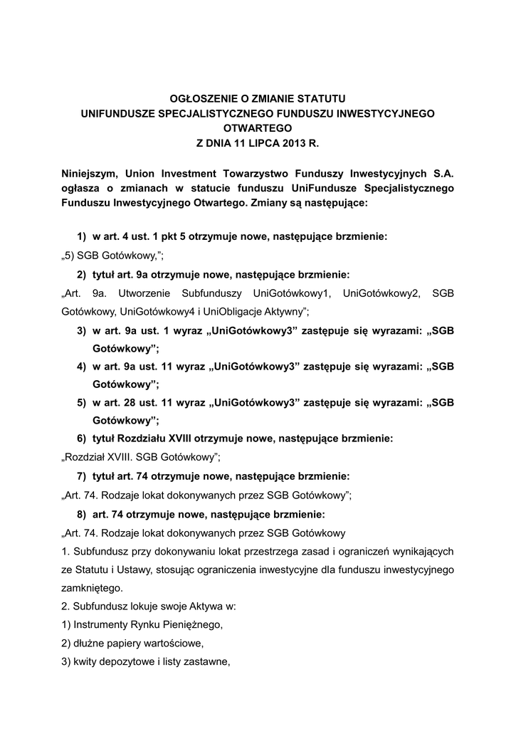 OGŁOSZENIE O ZMIANIE STATUTU UNIFUNDUSZE SPECJALISTYCZNEGO FUNDUSZU INWESTYCYJNEGO OTWARTEGO Z DNIA 11 LIPCA 2013 R. Niniejszym, Union Investment Towarzystwo Funduszy Inwestycyjnych S.A. ogłasza o zmianach w statucie funduszu UniFundusze Specjalistycznego Funduszu Inwestycyjnego Otwartego. Zmiany są następujące: 1) w art. 4 ust. 1 pkt 5 otrzymuje nowe, następujące brzmienie: „5) SGB Gotówkowy,”; 2) tytuł art. 9a otrzymuje nowe, następujące brzmienie: „Art. 9a. Utworzenie Subfunduszy UniGotówkowy1, UniGotówkowy2, SGB Gotówkowy, UniGotówkowy4 i UniObligacje Aktywny”; 3) w art. 9a ust. 1 wyraz „UniGotówkowy3” zastępuje się wyrazami: „SGB Gotówkowy”; 4) w art. 9a ust. 11 wyraz „UniGotówkowy3” zastępuje się wyrazami: „SGB Gotówkowy”; 5) w art. 28 ust. 11 wyraz „UniGotówkowy3” zastępuje się wyrazami: „SGB Gotówkowy”; 6) tytuł Rozdziału XVIII otrzymuje nowe, następujące brzmienie: „Rozdział XVIII. SGB Gotówkowy”; 7) tytuł art. 74 otrzymuje nowe, następujące brzmienie: „Art. 74. Rodzaje lokat dokonywanych przez SGB Gotówkowy”; 8) art. 74 otrzymuje nowe, następujące brzmienie: „Art. 74. Rodzaje lokat dokonywanych przez SGB Gotówkowy 1. Subfundusz przy dokonywaniu lokat przestrzega zasad i ograniczeń wynikających ze Statutu i Ustawy, stosując ograniczenia inwestycyjne dla funduszu inwestycyjnego zamkniętego. 2. Subfundusz lokuje swoje Aktywa w: 1) Instrumenty Rynku Pieniężnego, 2) dłużne papiery wartościowe, 3) kwity depozytowe i listy zastawne, 4) Instrumenty Pochodne, w tym Niewystandaryzowane Instrumenty Pochodne, - pod warunkiem, że są zbywalne, 5) depozyty w bankach krajowych, bankach zagranicznych lub instytucjach kredytowych.”; 9) art. 75 otrzymuje nowe, następujące brzmienie: „Art. 75. Kryteria doboru lokat oraz zasady ich dywersyfikacji 1. Podstawowym kryterium doboru lokat przez Subfundusz jest dążenie do osiągnięcia celu inwestycyjnego Subfunduszu przez uzyskanie rentowności wyższej niż określony Benchmark przy zachowaniu wysokiej płynności oraz minimalizowaniu ryzyka niewypłacalności emitentów papierów wartościowych, w które inwestuje Subfundusz. 2. Środki pieniężne Uczestników będą lokowane przez Fundusz na rachunek Subfunduszu w Instrumenty Rynku Pieniężnego oraz w inne dłużne papiery wartościowe, w przypadku których czas pozostający do wykupu nie przekracza 397 dni lub wysokość oprocentowania jest ustalana dla okresów nie dłuższych niż 397 dni, przy czym udział pozostałych kategorii lokat określonych w art. 74 ust. 2 musi być niższy niż 30% wartości Aktywów Subfunduszu. 3. Fundusz, działający na rachunek Subfunduszu, przy zawieraniu umów mających za przedmiot kategorie lokat wymienione w art. 74 ust. 2 pkt 1) 2) i 3) Statutu kieruje się w szczególności następującymi kryteriami: 1) płynności, 2) ceny, 3) dostępności, 4) zgodności ze strategią i celem inwestycyjnym, 5) ryzykiem kredytowym, 6) wyceny, 7) konkurencyjności rentowności w porównaniu do alternatywnych instrumentów finansowych dostępnych na rynku. 4. Podstawowe kryteria doboru lokat w odniesieniu do lokat wskazanych w art. 74 ust. 2 pkt. 4) Statutu określone są w ust. 12 i ust. 13. 5. W celu zapewnienia płynności, środki Subfunduszu są utrzymywane na rachunkach bankowych, o niskim ryzyku niewypłacalności. 6. Fundusz działający na rachunek Subfunduszu może dokonywać lokat za granicą, w państwach członkowskich Unii Europejskiej i w państwach należących do OECD innych niż Rzeczpospolita Polska i państwo członkowskie Unii Europejskiej. Instrumenty Rynku Pieniężnego i dłużne papiery wartościowe objęte lub nabyte za granicą mogą stanowić do 50 % wartości Aktywów Subfunduszu. 7. Głównym kryterium doboru lokat dla depozytów bankowych jest oprocentowanie depozytów oraz wiarygodność kontrahenta. 8. Papiery wartościowe lub Instrumenty Rynku Pieniężnego wyemitowane przez jeden podmiot oraz wierzytelności wobec tego podmiotu nie mogą stanowić łącznie więcej niż 15% wartości Aktywów Subfunduszu. 9. Listy zastawne wyemitowane przez jeden bank hipoteczny nie mogą stanowić więcej niż 25% wartości Aktywów Subfunduszu. 10. Depozyty bankowe w jednym banku krajowym, banku zagranicznym lub instytucji kredytowej nie mogą stanowić więcej niż 20 %wartości Aktywów Subfunduszu. 11. Zasad, o których mowa w ust. 2, nie stosuje się do lokat w papiery wartościowe, Instrumenty Rynku Pieniężnego lub wierzytelności emitowane, poręczone lub gwarantowane przez Skarb Państwa, Narodowy Bank Polski, państwa należące do OECD lub międzynarodowe instytucje finansowe, których członkiem jest Rzeczpospolita Polska lub co najmniej jedno państwo należące do OECD. 12. Z zastrzeżeniem ust. 13, Fundusz, na rachunek Subfunduszu może inwestować w następujące rodzaje Instrumentów Pochodnych, w tym Niewystandaryzowanych Instrumentów Pochodnych, zarówno w celu ograniczenia ryzyka inwestycyjnego jak i w celu zapewnienia sprawnego zarządzania portfelem inwestycyjnym: 1) kontrakty terminowe gdzie instrumentem bazowym może być indeks giełdowy, papiery wartościowe, Instrumenty Rynku Pieniężnego, kursy walut, stopa procentowa, 2) opcje gdzie instrumentem bazowym może być indeks giełdowy, papiery wartościowe, Instrumenty Rynku Pieniężnego, kursy walut, stopa procentowa, 3) transakcje wymiany walut, papierów wartościowych, Instrumentów Rynku Pieniężnego i indeksów giełdowych. 13. Fundusz, działając na rachunek Subfunduszu, przy zawieraniu umów mających za przedmiot Instrumenty Pochodne kieruje się następującymi kryteriami: 1) płynności, 2) ceny, 3) dostępności, 4) zgodności ze strategią i celem inwestycyjnym, 5) dopasowanie charakterystyki Instrumentu Pochodnego do polityki inwestycyjnej oraz instrumentów finansowych znajdujących się w portfelu inwestycyjnym Subfunduszu. 14. Instrumenty, o których mowa w u
