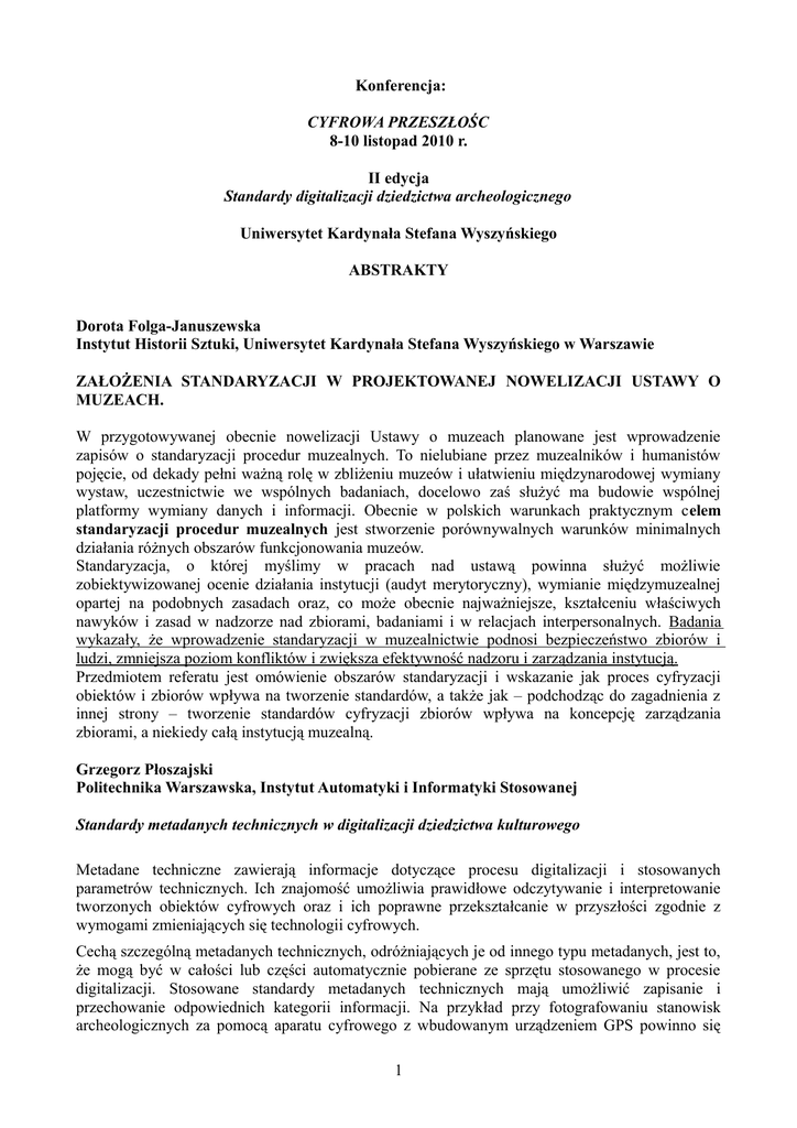 Konferencja: CYFROWA PRZESZŁOŚC 8-10 listopad 2010 r. II edycja Standardy digitalizacji dziedzictwa archeologicznego Uniwersytet Kardynała Stefana Wyszyńskiego ABSTRAKTY Dorota Folga-Januszewska Instytut Historii Sztuki, Uniwersytet Kardynała Stefana Wyszyńskiego w Warszawie ZAŁOŻENIA STANDARYZACJI W PROJEKTOWANEJ NOWELIZACJI USTAWY O MUZEACH. W przygotowywanej obecnie nowelizacji Ustawy o muzeach planowane jest wprowadzenie zapisów o standaryzacji procedur muzealnych. To nielubiane przez muzealników i humanistów pojęcie, od dekady pełni ważną rolę w zbliżeniu muzeów i ułatwieniu międzynarodowej wymiany wystaw, uczestnictwie we wspólnych badaniach, docelowo zaś służyć ma budowie wspólnej platformy wymiany danych i informacji. Obecnie w polskich warunkach praktycznym celem standaryzacji procedur muzealnych jest stworzenie porównywalnych warunków minimalnych działania różnych obszarów funkcjonowania muzeów. Standaryzacja, o której myślimy w pracach nad ustawą powinna służyć możliwie zobiektywizowanej ocenie działania instytucji (audyt merytoryczny), wymianie międzymuzealnej opartej na podobnych zasadach oraz, co może obecnie najważniejsze, kształceniu właściwych nawyków i zasad w nadzorze nad zbiorami, badaniami i w relacjach interpersonalnych. Badania wykazały, że wprowadzenie standaryzacji w muzealnictwie podnosi bezpieczeństwo zbiorów i ludzi, zmniejsza poziom konfliktów i zwiększa efektywność nadzoru i zarządzania instytucją. Przedmiotem referatu jest omówienie obszarów standaryzacji i wskazanie jak proces cyfryzacji obiektów i zbiorów wpływa na tworzenie standardów, a także jak – podchodząc do zagadnienia z innej strony – tworzenie standardów cyfryzacji zbiorów wpływa na koncepcję zarządzania zbiorami, a niekiedy całą instytucją muzealną. Grzegorz Płoszajski Politechnika Warszawska, Instytut Automatyki i Informatyki Stosowanej Standardy metadanych technicznych w digitalizacji dziedzictwa kulturowego Metadane techniczne zawierają informacje dotyczące procesu digitalizacji i stosowanych parametrów technicznych. Ich znajomość umożliwia prawidłowe odczytywanie i interpretowanie tworzonych obiektów cyfrowych oraz i ich poprawne przekształcanie w przyszłości zgodnie z wymogami zmieniających się technologii cyfrowych. Cechą szczególną metadanych technicznych, odróżniających je od innego typu metadanych, jest to, że mogą być w całości lub części automatycznie pobierane ze sprzętu stosowanego w procesie digitalizacji. Stosowane standardy metadanych technicznych mają umożliwić zapisanie i przechowanie odpowiednich kategorii informacji. Na przykład przy fotografowaniu stanowisk archeologicznych za pomocą aparatu cyfrowego z wbudowanym urządzeniem GPS powinno się 1 stosować standard metadanych technicznych, w którym jest miejsce na współrzędne GPS. Z drugiej strony zakres dostarczanych metadanych technicznych może być jednym z kryteriów doboru sprzętu. O ile przy opisywaniu obiektów oryginalnych stosuje się różne standardy metadanych dla różnych typów obiektów fizycznych i dla różnych grup instytucji kultury, o tyle standardy metadanych technicznych są związane z typem tworzonych obiektów cyfrowych; są nimi często obrazy cyfrowe nieruchome, ale bywają także cyfrowe obrazy ruchome, cyfrowe zapisy dźwięku, a niekiedy tekst. Ponadto oprócz obiektów prostych mogą być tworzone cyfrowe obiekty złożone, zawierające wiele powiązanych ze sobą obiektów prostych, niekiedy różnego rodzaju (np. obraz i tekst lub dźwięk), i metadane muszą wówczas przedstawić informację o strukturze takiego obiektu. Referat stanowi próbę zwięzłego przedstawienia podstawowych informacji o standardach metadanych technicznych stosowanych przy digitalizacji dziedzictwa kulturowego. Agnieszka Oniszczuk-Rakowska Dział Archeologii KOBiDZ Projekt CARARE – archeologia i architektura w Europeanie CARARE (Connecting ARchaeology and ARchitecture in Europeana) to program typu Best Practice Network, finansowany w ramach ICT-PSP. Jest to jeden z sieci projektów związanych z rozbudową internetowego portalu o europejskim dziedzictwie kulturowym – Europeana (www.europeana.eu). Obecnie można w nim znaleźć 6 milionów rekordów; są to głównie archiwalia i muzealia. W ramach projektu CARARE Europeana wzbogacona zostanie o bogate multimedialnie treści związane z archeologią i architekturą (m.in. modele 3D, wizualizacje). Celem projektu jest dostarczenie narzędzi zapewniających poprawne funkcjonowanie bazy multimedialnej zarówno w trakcie rozbudowy jak i w przyszłości, wypracowanie metod włączania do Europeany obiektów 3D/VR. Istotnym jest, że w CARARE położono nacisk na fazę wdrożeniową. Projekt zapewnić ma stałe funkcjonowanie rozbudowanej bazy Europeana z możliwością uzupełniania jej o kolejne zabytki archeologiczne i architektoniczne po zakończeniu projektu. Realizacja projektu CARARE rozpoczęła się w lutym 2010r., a zakończy w styczniu 2013r. Projekt koordynują Kulturarvsstyrelsen (Dania) i MDR Partners (Wielka Brytania), zaś konsorcjum tworzy 29 instytucji z 20 krajów Europy. Są wśród nich partnerzy techniczni, jak i merytoryczni – dostawcy danych. Do ostatniej grupy należy Krajowy Ośrodek Badań i Dokumentacji Zabytków, który zamieści w Europeanie cztery kolekcje: modele 3D i dokumentacja fotogrametryczna, zamki, Pomniki Historii/skarby dziedzictwa narodowego, stanowiska archeologiczne Dr.-Ing. Piotr Kuroczyński (Darmstadt – Niemcy) dr Paweł Madera (Wrocław) Technische Universität Darmstadt, Fachgebiet InformationsKommunikationstechnologie in der Architektur, Prof. Manfred Koob und Cyfrowa wizja przedlokacyjnego Wrocławia (X – lata 20. XIII w.). Metody, problemy i perspektywy wirtualnej rekonstrukcji zaginionej przestrzeni kulturowej. Referat przedstawia proces realizacji 1. części projektu pt. „Trójwymiarowa komp