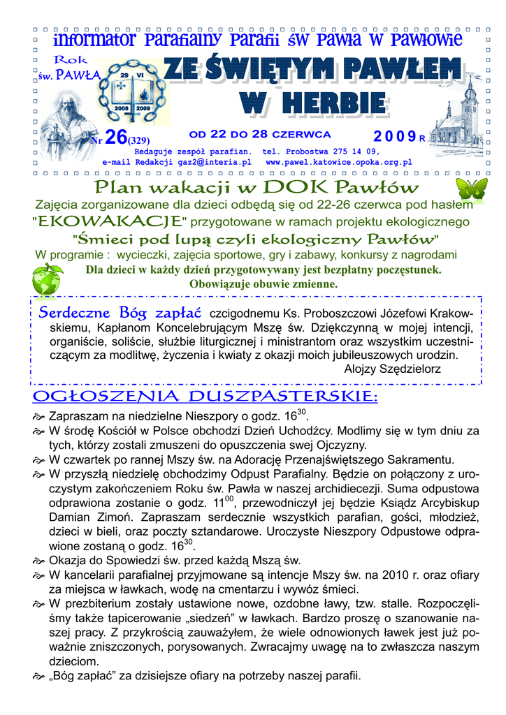 Rok św. w. PAWŁA 29 2008 Nr VI 2009 OD 22 DO 28 CZERWCA 2 0 0 9 R. 26(329) Redaguje zespół parafian. tel. Probostwa 275 14 09, e-mail Redakcji [email protected] www.pawel.katowice.opoka.org.pl Plan wakacji w DOK Pawłów Zajęcia zorganizowane dla dzieci odbędą się od 22-26 czerwca pod hasłem "EKOWAKACJE" przygotowane w ramach projektu ekologicznego "Śmieci mieci pod lupą lup czyli ekologiczny Pawłów" W programie : wycieczki, zajęcia sportowe, gry i zabawy, konkursy z nagrodami Dla dzieci w kaŜdy dzień przygotowywany jest bezpłatny poczęstunek. Obowiązuje obuwie zmienne. Serdeczne Bóg zapłać czcigodnemu Ks. Proboszczowi Józefowi Krakowskiemu, Kapłanom Koncelebrującym Mszę św. Dziękczynną w mojej intencji, organiście, soliście, słuŜbie liturgicznej i ministrantom oraz wszystkim uczestniczącym za modlitwę, Ŝyczenia i kwiaty z okazji moich jubileuszowych urodzin. Alojzy Szędzielorz OGŁOSZENIA DUSZPASTERSKIE: Zapraszam na niedzielne Nieszpory o godz. 1630. W środę Kościół w Polsce obchodzi Dzień Uchodźcy. Modlimy się w tym dniu za tych, którzy zostali zmuszeni do opuszczenia swej Ojczyzny. W czwartek po rannej Mszy św. na Adorację Przenajświętszego Sakramentu. W przyszłą niedzielę obchodzimy Odpust Parafialny. Będzie on połączony z uroczystym zakończeniem Roku św. Pawła w naszej archidiecezji. Suma odpustowa odprawiona zostanie o godz. 1100, przewodniczył jej będzie Ksiądz Arcybiskup Damian Zimoń. Zapraszam serdecznie wszystkich parafian, gości, młodzieŜ, dzieci w bieli, oraz poczty sztandarowe. Uroczyste Nieszpory Odpustowe odprawione zostaną o godz. 1630. Okazja do Spowiedzi św. przed kaŜdą Mszą św. W kancelarii parafialnej przyjmowane są intencje Mszy św. na 2010 r. oraz ofiary za miejsca w ławkach, wodę na cmentarzu i wywóz śmieci. W prezbiterium zostały ustawione nowe, ozdobne ławy, tzw. stalle. Rozpoczęliśmy takŜe tapicerowanie „siedzeń” w ławkach. Bardzo proszę o szanowanie naszej pracy. Z przykrością zauwaŜyłem, Ŝe wiele odnowionych ławek jest juŜ powaŜnie zniszczonych, porysowanych. Zwracajmy uwagę na to zwłaszcza naszym dzieciom. „Bóg zapłać” za dzisiejsze ofiary na potrzeby naszej parafii. INTENCJE MSZY św. w. od 22 do 28 czerwca 2009 r. 22.VI g.1800 Koncelebra Poniedziałek - Z prośbą o Opiekę BoŜą, zdrowie oraz Dary Ducha Św. dla Wsp. św. Paulina Emilii Witosz z okazji 18 rocznicy urodzin, z Noli oraz świętych męczenników Jana - Z prośbą o Opiekę BoŜą, zdrowie oraz Dary Ducha Św. dla Fischera i Tomasza More’a Sandry Gniździa z okazji 18 rocznicy urodzin. 23.VI Wtorek Dzień Ojca 24.VI Środa Uroczystość Narodzenia św. Jana Chrzciciela 25.VI Czwartek g. 700 - W intencji ks. Seniora Henryka Macury w rocznicę święceń kapłańskich, 00 g.18 - Za + Irenę Fudała w dniu urodzin. g. 700 - Za + Alfonsa Gola, g.1800 - Wspólna za zmarłych /intencje w gablotce/, g. 700 - Za ++ Paulinę i Pawła Smołka, po mszy św. Adoracja Najświętszego Sakramentu 00 g.18 - Za + Paulinę Langner od znajomych. 26.VI Piątek g. 700 - Za + Małgorzatę Kuza jako 30-dniowa, g.1800 - Za + Marię Cygan w rocznicę śmierci. 27.VI Sobota g. 700 - Do Miłosierdzia BoŜego i Matki Boskiej Częstochowskiej z podziękowaniem za odebrane łaski, z prośbą o dalszą Opiekę BoŜą i zdrowie dla rodziny Mierzwa, 00 g.14 - Ślub rzymski: Kortus - Mikołajczak, g.1730 Spowiedź święta g.1800 - Za + Irenę Bytomską w 10 rocznicę śmierci. Wsp. Najświętszej Maryi Panny Nieustającej Pomocy oraz św. Cyryla Aleksandryjskiego 28.VI Niedziela 13 ZWYKŁA W CIĄGU ROKU g. 630 Godzinki ku czci Matki Boskiej, g. 700 - Za + Aleksandra Markiewicza oraz Ŝonę Hildegardę, g.1100 - Suma odpustowa: Za parafian, ODPUST g.1630 Uroczyste Nieszpory PARAFIALNY g.1700 - Za ++ Ludwikę i Bogusława Bilskich. Fragment do rozwaŜania na dziś: Flm
