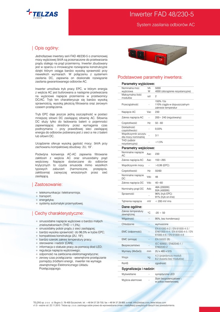 Inwerter FAD 48/230-5 System zasilania odbiorów AC | Opis ogólny: Jednofazowe inwertery serii FAD 48/230-5 o znamionowej mocy wyjściowej 5kVA są przeznaczone do przetwarzania prądu stałego na prąd przemienny. Inwerter zbudowany jest w oparciu o innowacyjne rozwiązania konstrukcyjne dzięki którym osiąga bardzo wysoką sprawność przy niewielkich wymiarach. W połączeniu z systemem zasilania DC, zapewnia on doskonałe rozwiązanie zasilania gwarantowanego odbiorów AC. Inwerter umożliwia tryb pracy EPC, w którym energia z wejścia AC jest buforowana a następnie przetwarzana na wyjściowe napięcie przemienne w przetwornicy DC/AC. Tryb ten charakteryzuje się bardzo wysoką sprawnością, wysoką jakością filtrowania oraz zerowym czasem przełączenia. Tryb EPC daje jeszcze jedną oszczędność w postaci mniejszej siłowni DC zasilającej siłownię AC. Siłownia DC służy tylko do ładowania baterii o pojemności zapewniającej określony przez wymagania czas podtrzymania – przy prawidłowej sieci zasilającej energia do odbiorów pobierana jest z sieci a nie z baterii lub siłowni DC. Urządzenie oferuje wysoką gęstość mocy: 5kVA przy zachowaniu kompaktowej obudowy: 2U, 19”. Podwójna konwersja AC-AC zapewnia filtrowanie zakłóceń z wejścia AC oraz sinusoidalny prąd wejściowy. Napięcie dostarczane do odbiorów krytycznych to czysta sinusoida mimo wszelkich typowych zaburzeń (harmoniczne, przepięcia, zakłócenia) zazwyczaj wnoszonych przez sieć zasilającą. | Zastosowanie: + + + + telekomunikacja i teletransmisja; transport; energetyka; systemy automatyki przemysłowej. | Cechy charakterystyczne: + sinusoidalne napięcie wyjściowe o bardzo małych zniekształceniach (THD <1,5%); + sinusoidalny pobór prądu z sieci zasilającej; + bardzo wysoka sprawność: do 96,5% w trybie EPC; + kompaktowa konstrukcja (2U, 19"); + bardzo szeroki zakres temperatury pracy; + sterowanie i nadzór (CAN); + informacja o statusie pracy za pomocą diod LED; + regulacja napięcia wyjściowego; + odporność na zakłócenia elektromagnetyczne; + zerowy czas przełączania - wewnętrzne przełączanie pomiędzy źródłami energii, inwerter nie wymaga zewnętrznego Elektronicznego Układu Przełączającego. Podstawowe parametry inwertera: Parametry wyjściowe: Nominalna moc wyjściowa Maksymalna ilość modułów Przeciążalność Napięcie AC Zakres napięcia AC Częstotliwość Dokładność częstotliwości Współczynnik szczytu dla mocy nominalnej THD (odbiór rezystancyjny) VA W 5000 4000 (obciążenie rezystancyjne) szt 2 Vac - 150% 15s 110% ciągła w dopuszczalnym zakresie temperatur 230 200÷ 240 (regulowany) Hz 50 - 60 - 0,03% - 3:1 - <1,5% Parametry wejściowe: Nominalne napięcie AC Aac 230 Zakres napięcia AC Aac 150÷265 Współczynnik mocy - >0,99 (EPC) Częstotliwość Hz 50/60 Nominalne napięcie DC Vdc 48 Zakres napięcia DC Vdc 40÷60 Nominalny prąd DC Adc Sprawność Tętnienia napięcia - 46A (2000W) 93A (4000W) 96% (tryb EPC) 91% (tryb on-line) mV < 200 mV rms C -20 ÷ 50 Dane ogólne: Zakres temperatury zewnętrznej Wilgotność - 95%, bez kondensacji Chłodzenie - wymuszone EMC (odporność) - EN 61000-4-2 / EN 61000-4-3 / EN61000-4-4 / EN 61000-4-5 / EN 61000-4-6 / EN 61000-4-8 EMC (emisja) - EN 55022 (B) Bezpieczeństwo - IEC 60950 / EN62040-1 / EN62040-2 Wymiary (WxSxG) mm Waga kg RoHS - 2U x 485 x 515 4,3 (pojedynczy moduł) 8,2 (kaseta bez modułów) zgodność Sygnalizacja i nadzór: Wyświetlanie - synoptyczne LED Wyjścia alarmowe - Styki bezpotencjałowe \ w półce inwerterowej TELZAS sp. z o.o. ul. Bugno 3, 78-400 Szczecinek, tel. +48 94 37 29 750, fax +48 94 37 29 800, e-mail: [email protected], www.telzas.com v1.0 - ważne od: 22.11.2015 Telzas sp. z o.o. zastrzega sobie prawo do wprowadzania zmian i modyfikacji powyższych danych bez powiadomienia.