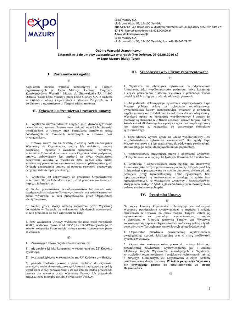 Expo Mazury S.A. ul. Grunwaldzka 55, 14-100 Ostróda KRS 513712 (Sąd Rejonowy w Olsztynie VIII Wydział Gospodarczy KRS),NIP 839-2767-573, kapitał zakładowy 85.428.000,00 zł Adres do korespondencji: Expo Mazury S.A. ul. Grunwaldzka 55, 14-100 Ostróda; fax: +48 89 647 78 77 Ogólne Warunki Uczestnictwa Załącznik nr 1 do umowy uczestnictwa w targach (Pro Defense, 02-05.06.2016 r.) w Expo Mazury (dalej: Targi) I. Postanowienia ogólne §1 Regulamin określa warunki uczestnictwa w Targach organizowanych w Expo Mazury, Centrum TargowoKonferencyjnym Warmii i Mazur, ul. Grunwaldzka 55, 14-100 Ostróda (dalej: Expo Mazury), przez Expo Mazury S.A. z siedzibą w Ostródzie (dalej Organizator) i stanowi Załącznik nr 1 do Umowy o uczestnictwo w Targach (dalej: umowa). II. Zgłoszenie uczestnictwa i zawarcie umowy §2 1. Wystawca weźmie udział w Targach, jeśli dokona zgłoszenia uczestnictwa, zawrze Umowę oraz dokona wszelkich płatności wynikających z Umowy oraz Formularza zamówień usług dodatkowych w terminach wskazanych w Umowie oraz w załącznikach. 2. Umowę uważa się za zawartą z chwilą dostarczenia przez Wystawcę do Organizatora, pocztą lub osobiście, umowy podpisanej zgodnie z zasadami reprezentacji. Wystawca, w terminie 7 dni od dnia dostarczenia Organizatorowi podpisanej umowy, zobowiązany jest zapłacić na rzecz Organizatora bezzwrotną zaliczkę w wysokości 20% łącznej ceny brutto zamówionej powierzchni wystawienniczej oraz opłatę rejestracyjną. O dacie dostarczenia umowy za pomocą operatora pocztowego decyduje data stempla pocztowego. 3. Wystawca jest zobowiązany do przesłania Organizatorowi w terminie 30 dni kalendarzowych przed planowanym terminem imprezy informacji o: a) liczbie pracowników, współpracowników lub innych osób działających w strukturze Wystawcy, innych niż goście zaproszeni przez Wystawcę, w celu przygotowania przez Organizatora identyfikatorów, b) liczbie gości, którzy zostaną zaproszeni przez Wystawcę do udziału w Targach, ze wskazaniem ich danych adresowych, w celu przesłania do nich zaproszeń na Targi, 4. Przy zawieraniu Umowy wyklucza się możliwość zaistnienia skutku, o którym mowa w art. 3854 §1 i 2 Kodeksu cywilnego, to znaczy związania Stron treścią wzorca umów stosowanego przez Wystawcę. §3 1. Zawierając Umowę Wystawca oświadcza, że: 1) nie zawiera jej jako konsument w rozumieniu art. 22 1 Kodeksu cywilnego, 2) jest przedsiębiorcą w rozumieniu art. 431 Kodeksu cywilnego, 3) posiada zdolność prawną i pełną zdolność do czynności prawnych, może skutecznie zawrzeć Umowę i zaciągnąć wszystkie wynikające z niej zobowiązania i że nie istnieje żadna przeszkoda prawna dla zawarcia przez Wystawcę Umowy lub przeszkoda prawna, która mogłaby utrudnić wykonanie Umowy, III. Współwystawcy i firmy reprezentowane §4 1. Wystawca ma obowiązek zgłoszenia, na odpowiednim formularzu, jako współwystawców podmioty, które korzystają z części powierzchni / stoiska wystawcy i prezentują własne produkty i/lub usługi przy udziale własnego personelu. 2. Od podmiotu dokonującego zgłoszenia współwystawcy Expo Mazury pobiera opłatę za zgłoszenie współwystawcy, uwzględniającą koszty manipulacyjne związane z rejestracją współwystawcy oraz dodatkowe świadczenia dla współwystawcy. Wysokość opłaty za zgłoszenie współwystawcy i zasady jej płatności są określone w „Ofercie cenowej” danych targów. Zakres świadczeń wkalkulowanych w opłatę za zgłoszenie współwystawcy jest określony w załączniku do stosownego formularza zgłoszeniowego. 3. Expo Mazury wyraża zgodę na udział współwystawcy /-ów w „Potwierdzeniu zgłoszenia uczestnictwa”. Bez zgody Expo Mazury wystawca nie jest uprawniony do oddawania powierzchni / stoiska lub jego części do używania innym podmiotom. 4. Współwystawcy przysługują prawa i obowiązki wystawcy, o których mowa w niniejszych Ogólnych Warunkach Uczestnictwa. 5. Wystawca / współwystawca może zgłosić, na stosownym formularzu, jako firmy reprezentowane podmioty, których produkty i / lub usługi są prezentowane na stoisku wystawcy, ale bez udziału personelu firmy reprezentowanej. Dane zgłoszonych firm reprezentowanych są umieszczane w katalogu w spisie firm reprezentowanych, ze wskazaniem wystawcy / wspólwystawcy, który je reprezentuje. Z tytułu zgłoszenia firm reprezentowanych nie pobiera się dodatkowych opłat. IV. Przedmiot Umowy §5 Na mocy Umowy Organizator zobowiązuje się udostępnić Wystawcy powierzchnię wystawienniczą o metrażu i rodzaju określonym w Umowie na okres trwania Targów, celem jej wykorzystania na potrzeby wystawiennicze, zgodnie z określoną w Umowie tematyką Targów, zaś Wystawca zobowiązuje się zapłacić Organizatorowi umówioną opłatę z tytułu uczestnictwa w Targach oraz zamówionych usług dodatkowych. 1. Organizator przydziela powierzchnię wystawienniczą uwzględniając warunki lokalizacyjne oraz w miarę możliwości, życzenia Wystawcy. 2. Organizator zastrzega sobie prawo do zmiany lokalizacji przydzielonej powierzchni wystawienniczej, jak i zmiany lokalizacji innych Wystawców sąsiadujących z Wystawcą, ze względów organizacyjnych i projektowo-technicznych, jak też z przyczyn niezależnych od Organizatora o czym zostanie poinformowany drogą mailową. W takim przypadku Wystawcy nie przysługuje prawo do odszkodowania ze strony Organizatora. §6 1 Expo Mazury S.A. ul. Grunwaldzka 55, 14-100 Ostróda KRS 513712 (Sąd Rejonowy w Olsztynie VIII Wydział Gospodarczy KRS),NIP 839-2767-573, kapitał zakładowy 85.428.000,00 zł Adres do korespondencji: Expo Mazury S.A. ul. Grunwaldzka 55, 14-100 Ostróda; fax: +48 89 647 78 77 Ogólne Warunki Uczestnictwa Załącznik nr 1 do umowy uczestnictwa w targach (Pro Defense, 02-05.06.2016 r.) w Expo Mazury (dalej: Targi) 1.Przekazanie Wystawcy powierzchni wystawienniczej nastąpi pod warunkiem uregulowania na rz