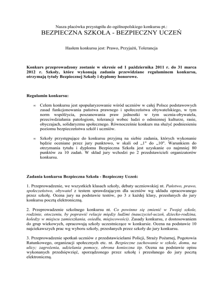 Nasza placówka przystąpiła do ogólnopolskiego konkursu pt.: BEZPIECZNA SZKOŁA - BEZPIECZNY UCZEŃ Hasłem konkursu jest: Prawo, Przyjaźń, Tolerancja Konkurs przeprowadzony zostanie w okresie od 1 października 2011 r. do 31 marca 2012 r. Szkoły, które wykonują zadania przewidziane regulaminem konkursu, otrzymają tytuły Bezpiecznej Szkoły i dyplomy honorowe. Regulamin konkursu: • Celem konkursu jest spopularyzowanie wśród uczniów w całej Polsce podstawowych zasad funkcjonowania państwa prawnego i społeczeństwa obywatelskiego, w tym norm współżycia, poszanowania praw jednostki w tym ucznia-obywatela, przeciwdziałania patologiom, tolerancji wobec ludzi o odmiennej kulturze, rasie, obyczajach, solidaryzmu społecznego. Równocześnie konkurs ma służyć podniesieniu poziomu bezpieczeństwa szkół i uczniów. • Szkoły przystępujące do konkursu przyjmą na siebie zadania, których wykonanie będzie oceniane przez jury punktowo, w skali od „1" do „10". Warunkiem do otrzymania tytułu i dyplomu Bezpieczna Szkoła jest uzyskanie co najmniej 80 punktów za 10 zadań. W skład jury wchodzi po 2 przedstawicieli organizatorów konkursu. Zadania konkursu Bezpieczna Szkoła - Bezpieczny Uczeń: 1. Przeprowadzenie, we wszystkich klasach szkoły, debaty uczniowskiej nt. Państwo, prawo, społeczeństwo, obywatel z testem sprawdzającym dla uczniów wg układu opracowanego przez szkołę. Ocena jury na podstawie testów, po 3 z każdej klasy, przesłanych do jury konkursu pocztą elektroniczną. 2. Przeprowadzenie szkolnego konkursu nt. Co powinno się zmienić w Twojej szkole, rodzinie, otoczeniu, by poprawić relacje między ludźmi (nauczyciel-uczeń, dziecko-rodzina, koledzy w miejscu zamieszkania, osiedlu, miejscowości). Zasady konkursu, z dostosowaniem do grup wiekowych, opracowują szkoły uczestniczące w konkursie. Ocena na podstawie 10 najciekawszych prac wg wyboru szkoły, przesłanych przez szkoły do jury konkursu. 3. Przeprowadzenie spotkań uczniów z przedstawicielami Policji, Straży Pożarnej, Pogotowia Ratunkowego, organizacji społecznych etc. nt. Bezpieczne zachowanie w szkole, domu, na ulicy; zagrożenia, udzielania pomocy, obrona konieczna itp. Ocena na podstawie opisu wykonanych przedsięwzięć, sporządzonego przez szkołę i przesłanego do jury pocztą elektroniczną. 4. Przeprowadzenie pogadanek we wszystkich klasach na temat: Prawna ochrona dóbr osobistych człowieka, w tym nietykalności cielesnej, a zwyczaje szkolne. Zalecane podjęcie tematu relacji „chłopcy-dziewczęta" - język, kultura osobista etc. „Czy uczniowie klną i dlaczego..." Ocena na podstawie informacji przesłanej do jury pocztą elektroniczną. 5. Przeprowadzenie we wszystkich klasach konwersatoriów na temat Tytoń, narkotyki, dopalacze - jak się przed tym bronić. Ocena na podstawie informacji przesłanej do jury przez szkołę. 6. Przeprowadzenie we wszystkich klasach konwersatoriów nt. Kibole, blokersi, grupy podwórkowe - co robić, jeśli rozpoznajesz zagrożenie, jak się bronić przed wciągnięciem do „paczki". Wskazany udział specjalisty ds. prewencji z Policji, pedagoga-specjalisty z zakresu resocjalizacji. Ocena na podstawie informacji przesłanej do jury przez szkołę. 7. Przeprowadzenie we wszystkich klasach konwersatoriów pod hasłem Mój przyjaciel jest inwalidą - jak kształtować podstawy akceptujące niepełnosprawność. Ocena na podstawie informacji przesłanej do jury przez szkołę. 8. Przeprowadzenie we wszystkich klasach konwersatoriów pod hasłem Nie jesteś sam. Jak monitorować sytuację osób z otoczenia szkolnego lub środowiskowego, które znalazły się w biedzie, chorobie, stanie sieroctwa społecznego lub „eurosieroctwa"; gdzie szukać pomocy. Wskazany udział przedstawicieli ośrodków pomocy społecznej i pomocy rodzinie, zawodowych kuratorów sądowych. 9. Przeprowadzenie konwersatoriów na temat: Przestrzeganie prawa to obowiązek każdego, także ucznia... Prezentacja może obejmować podstawowe reguły prawa cywilnego i karnego w konwencji odpowiedniej dla grup wiekowych, a także tematykę przestępczości nieletnich i wykonywania kar orzeczonych przez sądy dla nieletnich oraz sądy powszechne. 10. Wykonanie dowolnego zadania wg tematyki wybranej przez uczestniczącą w konkursie szkołę, dotyczącego kwestii bezpiecznej szkoły lub bezpieczeństwa uczniów. (źródło: http://bezpieczna-szkola.com/i-tura-konkursu.html) O realizacji poszczególnych obszarów będziemy informować na bieżąco na stronie internetowej Ośrodka.